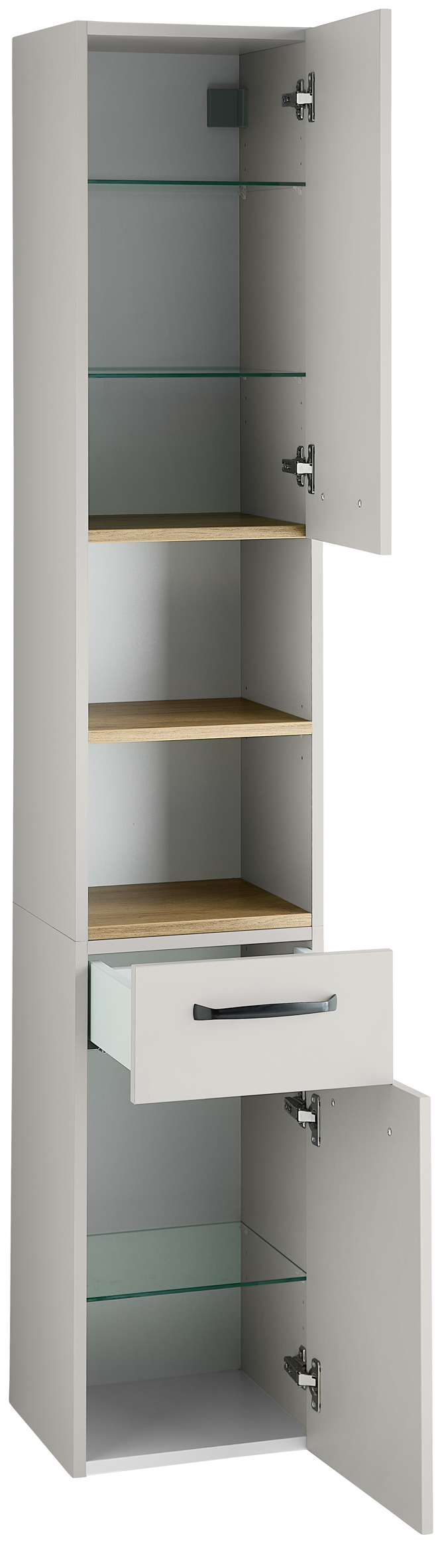 Die melaminharzbeschichteten Oberflächen sind pflegeleicht und resistent gegen Feuchtigkeit und Schmutz, was die tägliche Reinigung erleichtert. Die Kombination aus Kaschmir und Riviera-Eiche-Holznachbildung harmoniert sehr gut und schenkt dem Badezimmer eine warme, natürliche und zugleich moderne Ausstrahlung, die für ein wohnliches Ambiente und zeitlose Eleganz sorgt.