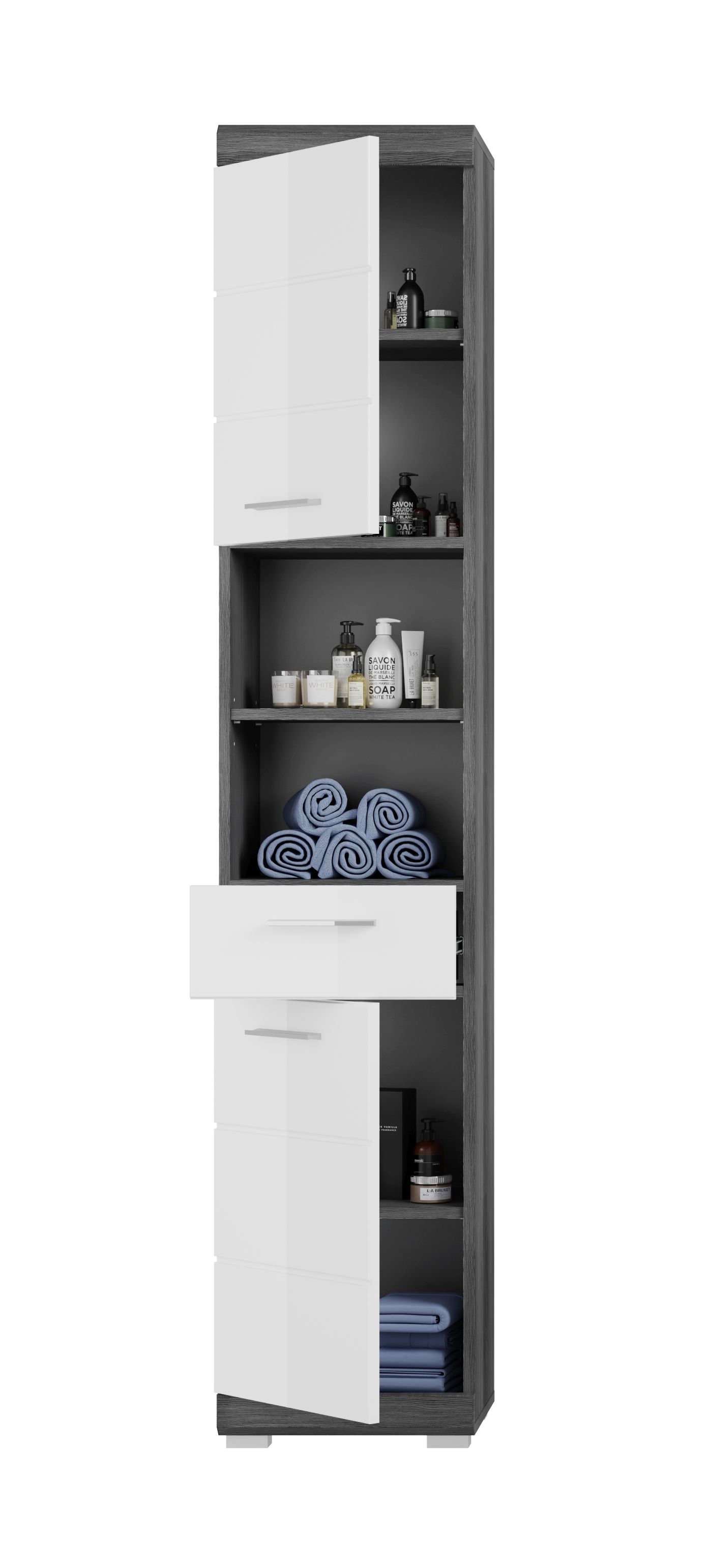 In unserem trendigen Sortiment präsentieren wir einen Badezimmer Hochschrank in angesagter Rauchsilber Nachbildung und weißem Hochglanz tiefgezogenem Finish, der deinem Badezimmer einen modernen Touch verleiht. Mit seinen schlanken Maßen von 37x191x31 cm bietet er nicht nur praktischen Stauraum, sondern auch ein stilvolles Design. Entdecke die perfekte Kombination aus Funktionalität und trendigem Chic mit diesem angesagten Hochschrank.