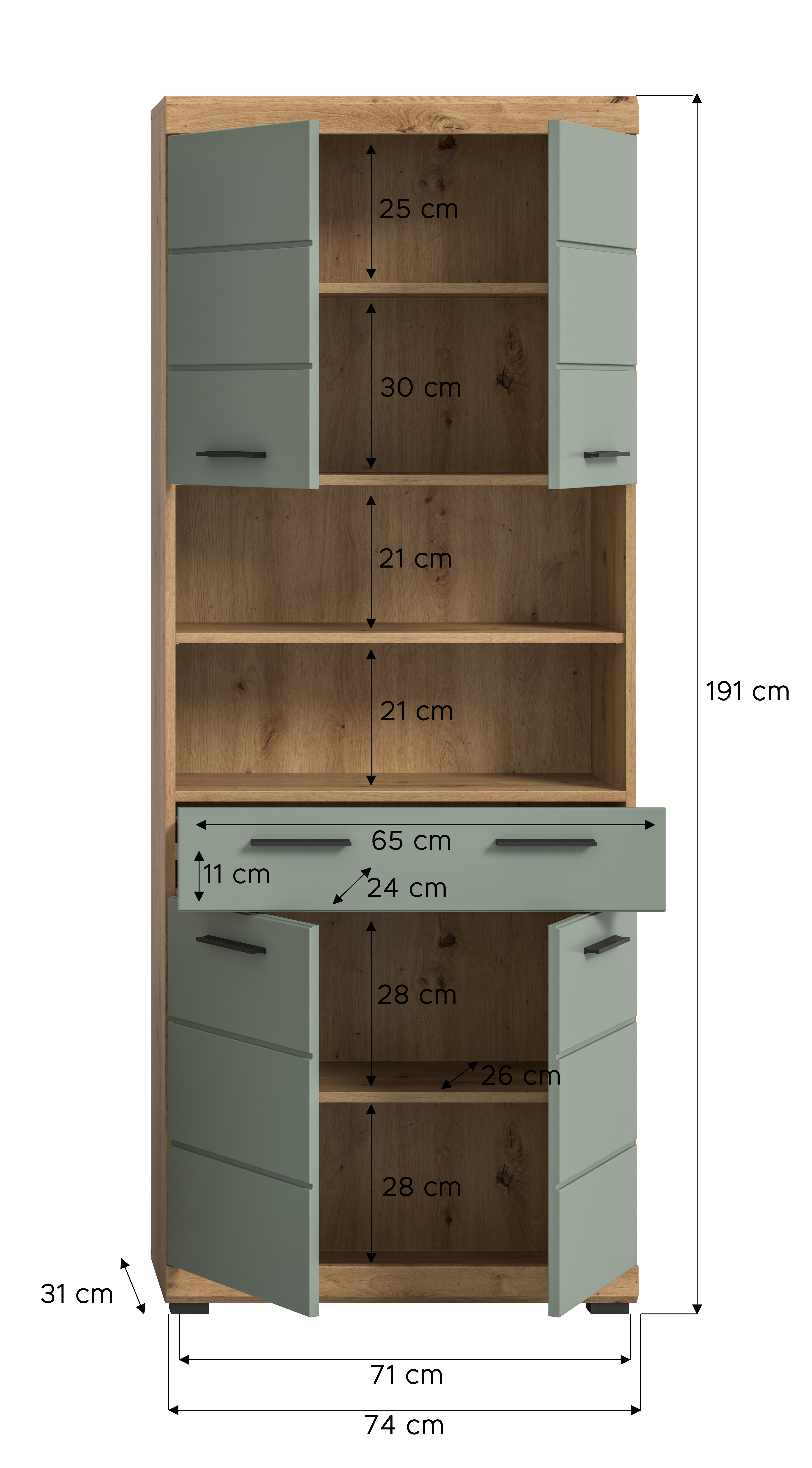 - Design/Stil: Schlichter Hochschrank in Salbei Nachbildung und Artisan Eiche Finish, der sich nahtlos in verschiedene Badezimmer- und Hauswirtschaftsräume einfügt und ein modernes und ordentliches Erscheinungsbild bietet.