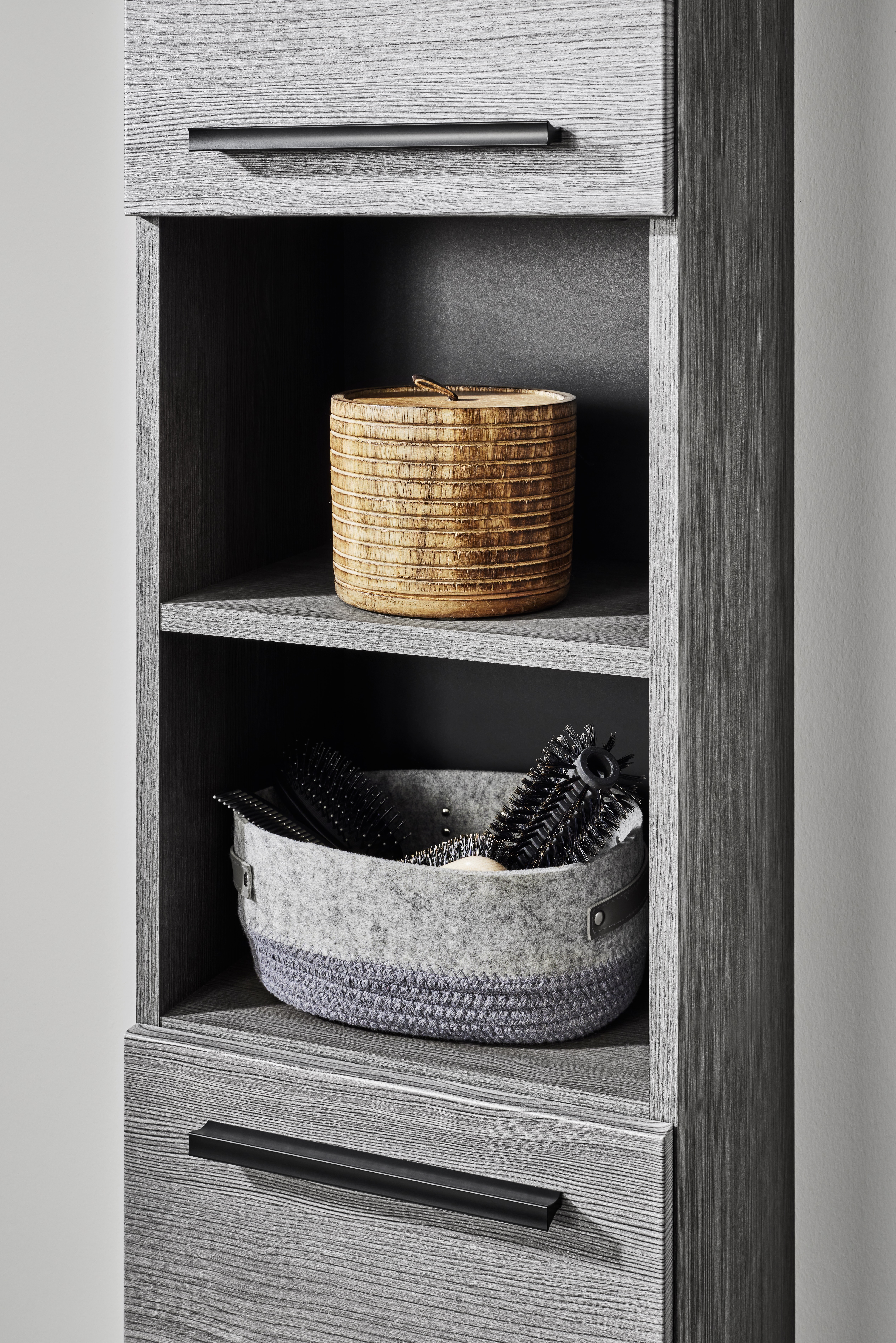 - Viel Stauraum: Zwei Einlegeböden und zwei offene Fächer bieten flexible Aufbewahrungsmöglichkeiten.