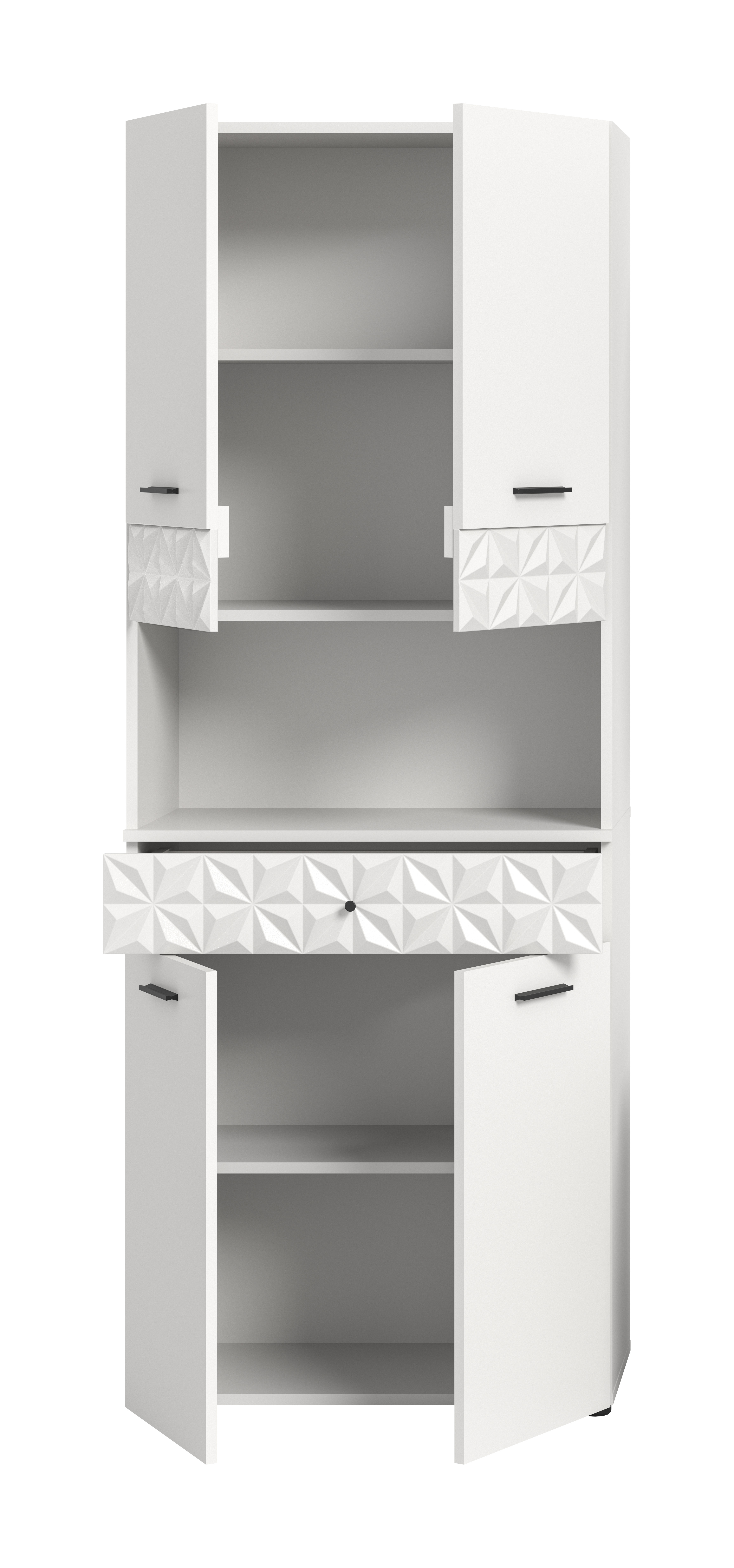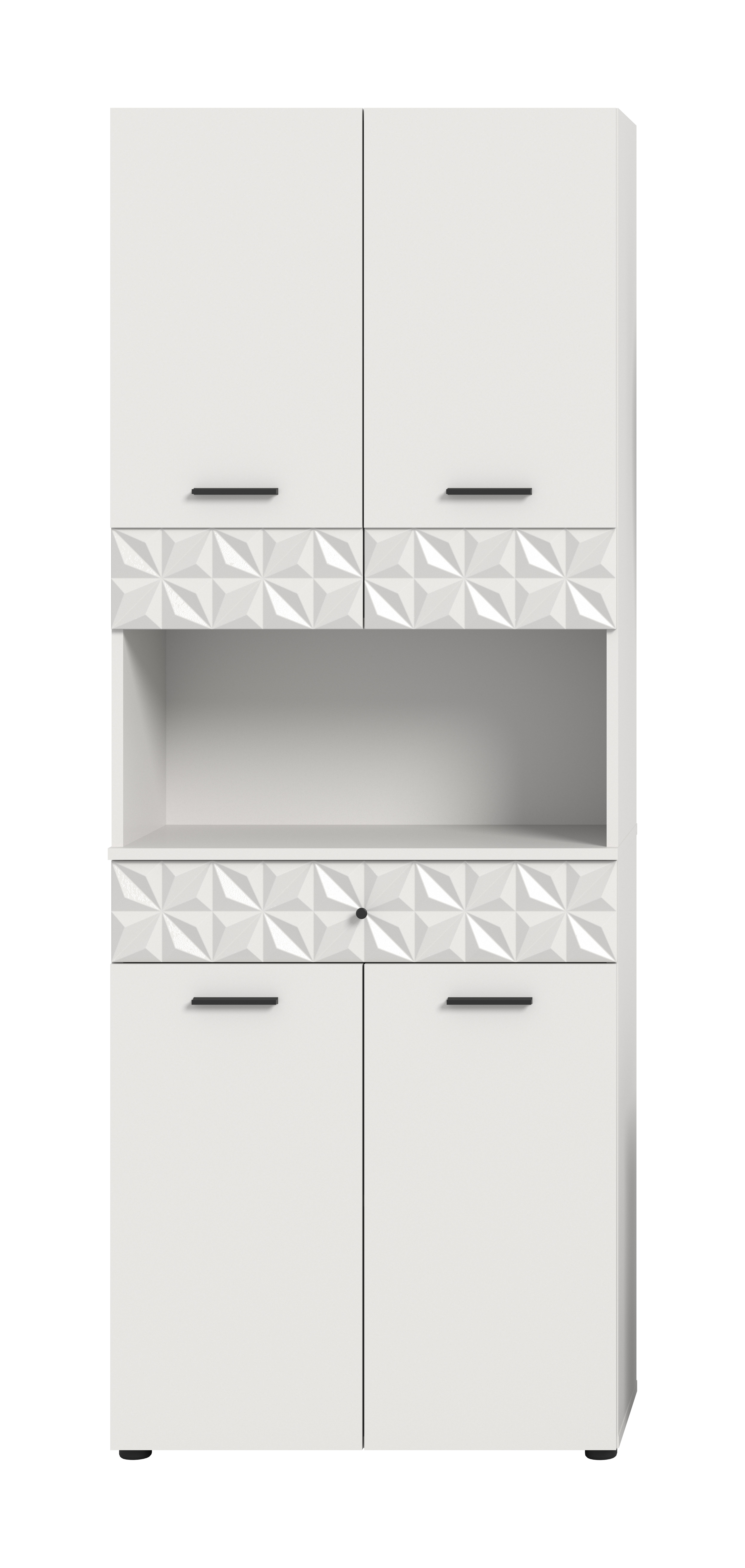 - Design/Stil: Die moderne weiße Front harmoniert perfekt mit den schwarzen Metall-Griffleisten, die einen stilvollen Kontrast und ein edles Design schaffen.
