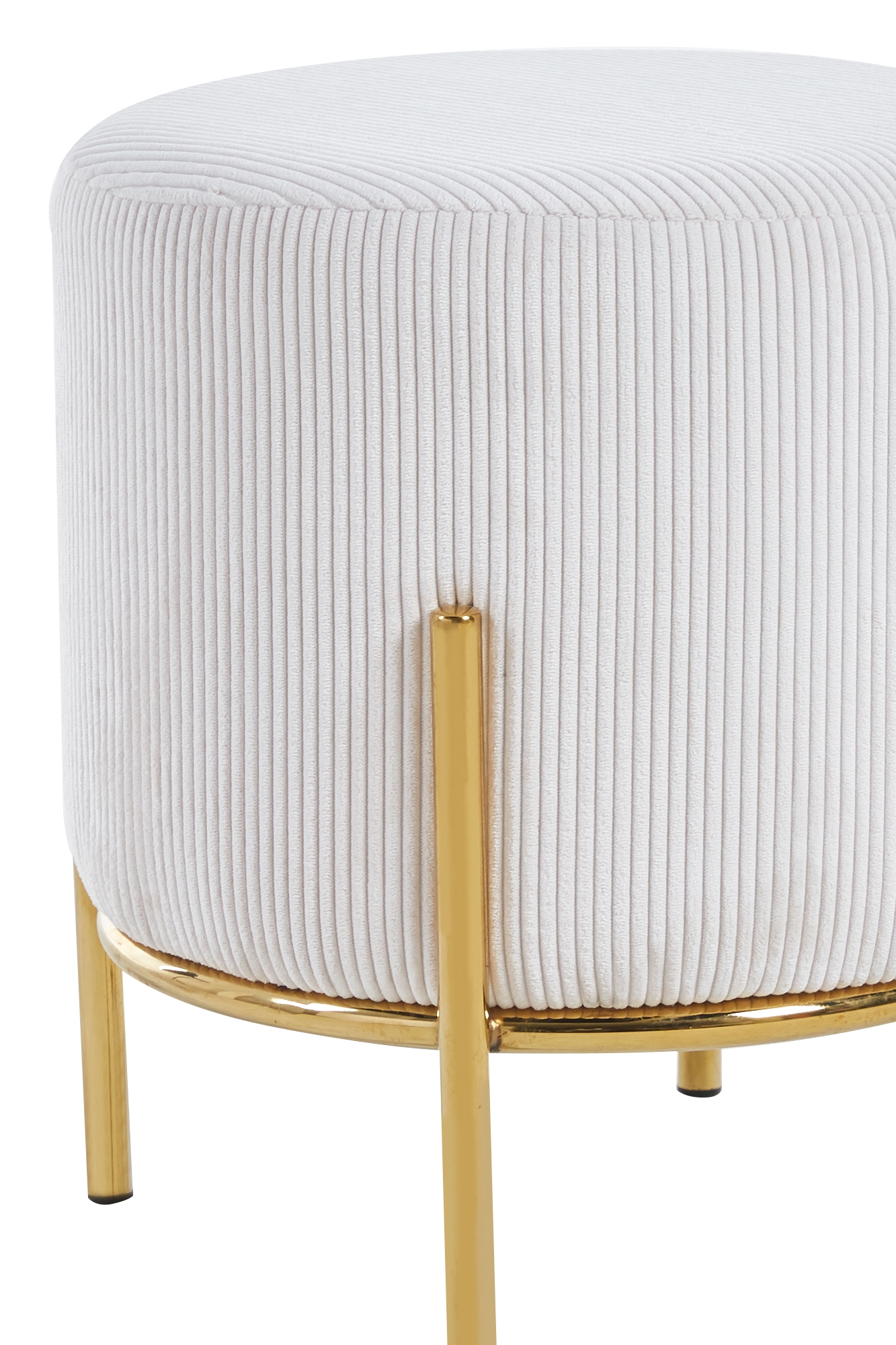 Wenn sich spontan Gäste ankündigen, sind zusätzliche Sitzgelegenheiten immer ein willkommener Segen. Wenn diese dann auch noch stylisch aussieht und platzsparend Nutzen schafft, dann hat man einen idealen Design-Kompagnon für Sofa und Sitzecke. Der Hocker in Cord-Optik mit einem Durchmesser der Sitzfläche von 35 cm bietet genau diese Kombination aus ansprechender Optik und funktionalem Nutzen. Hier können Sie zusätzliche Gäste platzieren oder aber ganz entspannt die Füße hochlegen. Der weiche Cord-Stoff verleiht dem Sitzhocker einen modernen Look und sorgt mit seinen charakteristischen Nähten für eine interessante Optik. Das Design-Gestell mit hohen Füßen besteht aus goldfarbenem Metall und rundet den Look ab.