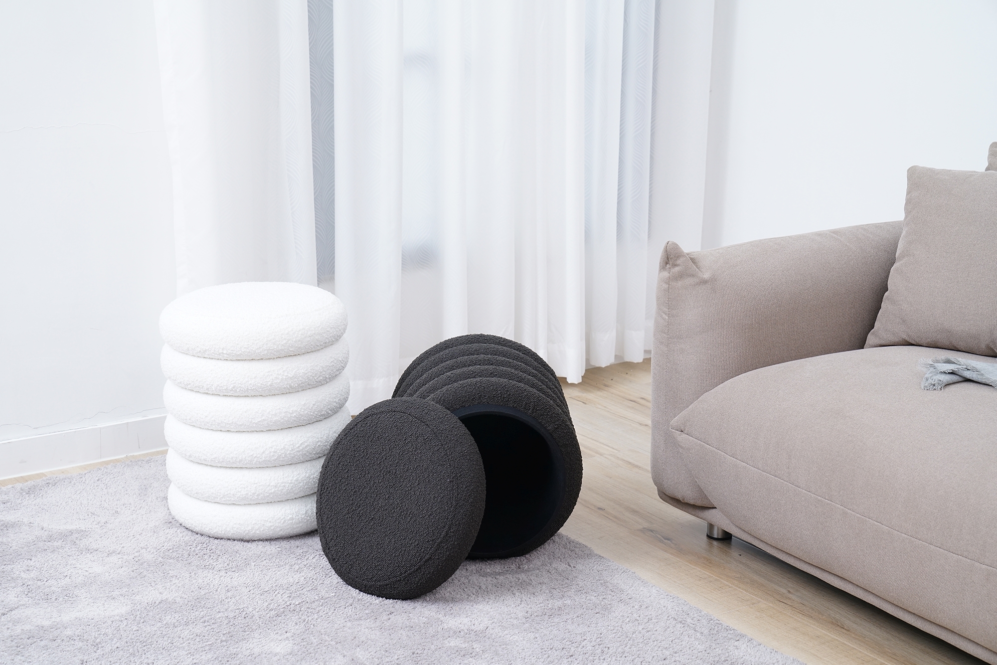 Clevere Stauraumlösung in topaktuellem Design. Dieser Sitzhocker im modernen Bouclé Gewand macht nicht nur optisch eine gute Figur. Das obere Element des Hockers lässt sich abnehmen, sodass das Innere des Polsters zur praktischen Stauraumlösung wird. Mit diesem Hocker schaffen Sie somit nicht nur eine zusätzliche Sitzgelegenheit, sondern schaffen ebenso stilvoll Ordnung in Ihrem Wohn- und Schlafbereich. Vor allem als Design-Kompagnon am Sofa platziert macht das angesagte Bouclé-Highlight im 70er Jahre Retro-Design etwas her. Die Lieferung erfolgt völlig unkompliziert – Der Artikel wird bereits fertig montiert geliefert. Nur noch auspacken, hinstellen und am neuen Lieblingsstück erfreuen.