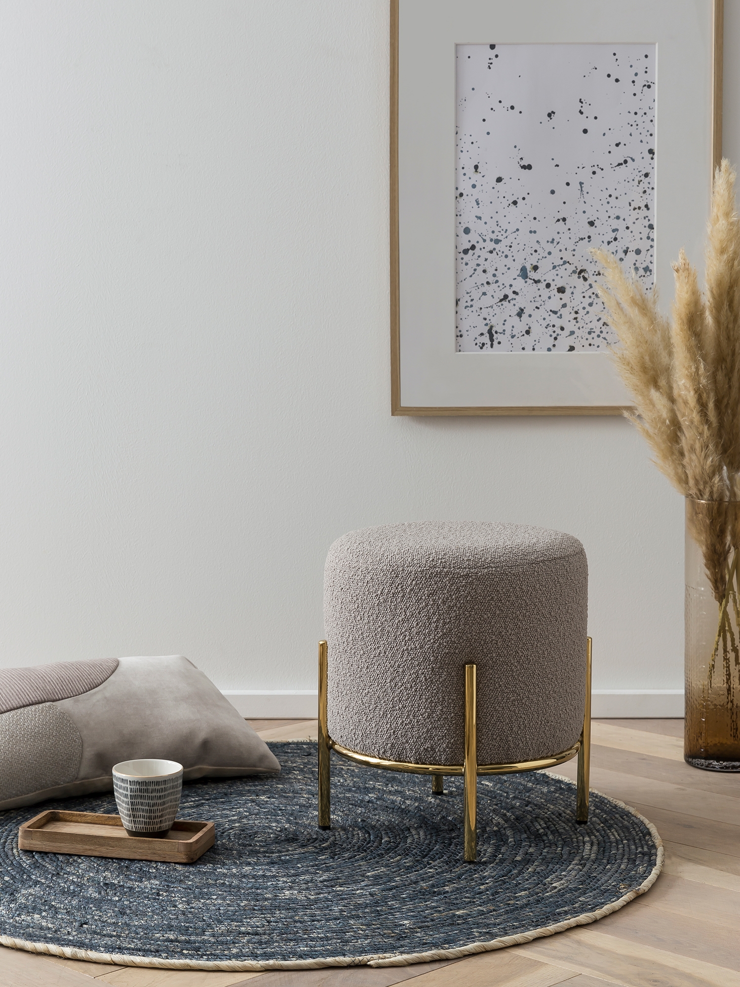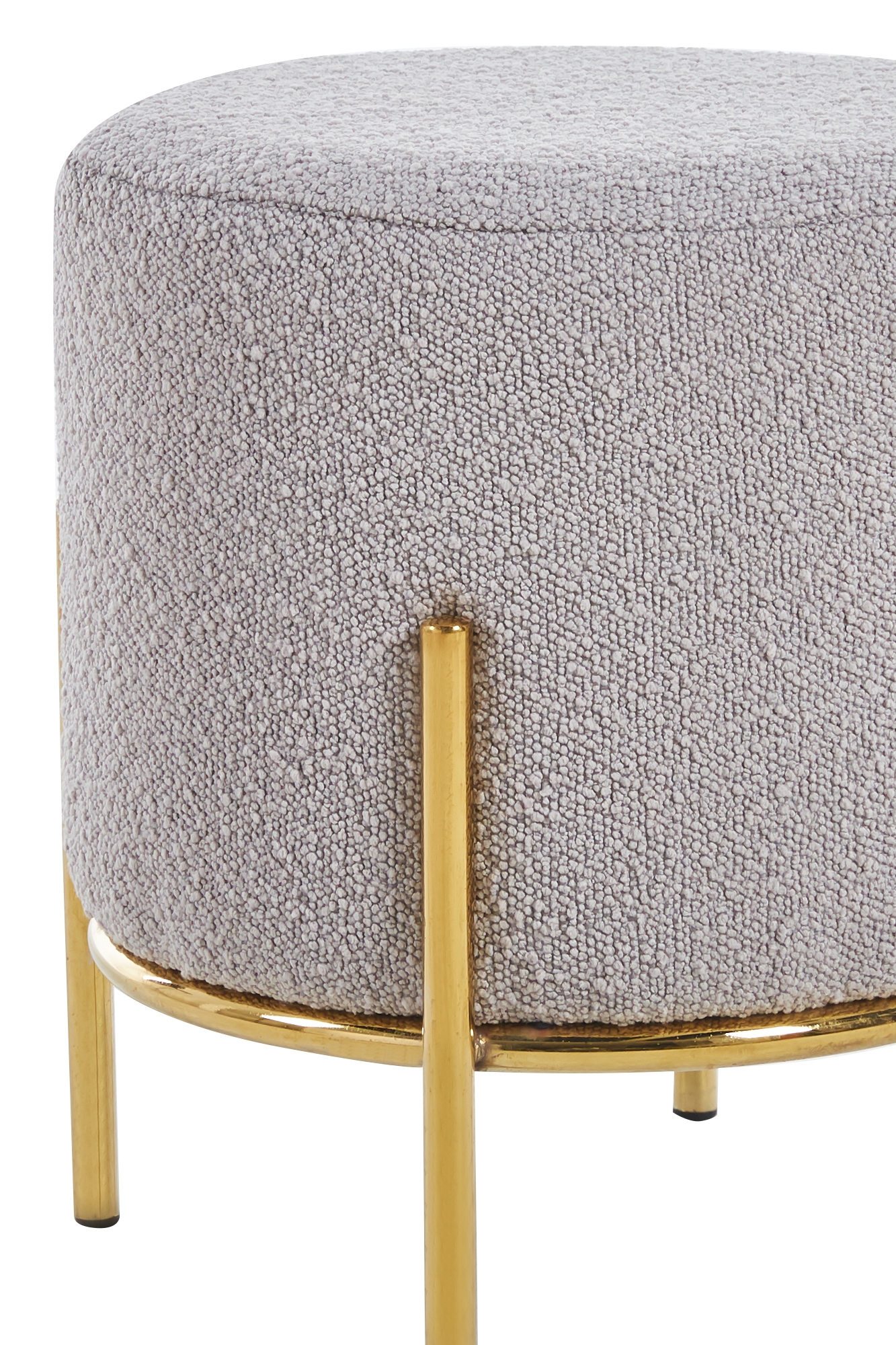 Wenn sich spontan Gäste ankündigen, sind zusätzliche Sitzgelegenheiten immer ein willkommener Segen. Wenn diese dann auch noch stylisch aussieht und platzsparend Nutzen schafft, dann hat man einen idealen Design-Kompagnon für Sofa und Sitzecke. Der Hocker in Bouclé-Optik mit einem Durchmesser der Sitzfläche von 35 cm bietet genau diese Kombination aus ansprechender Optik und funktionalem Nutzen. Hier können Sie zusätzliche Gäste platzieren oder aber ganz entspannt die Füße hochlegen. Der Bouclé Stoff, der schon lange Einzug in unsere Wohn- und Schlafzimmer gehalten hat, vermittelt Wärme und Geborgenheit. Außerdem spiegelt der Stoff mit seiner wolligen Optik die Essenz des beliebten Scandi Styles gekonnt wider. Das Design-Gestell mit hohen Füßen besteht aus goldfarbenem Metall und rundet den Look ab.