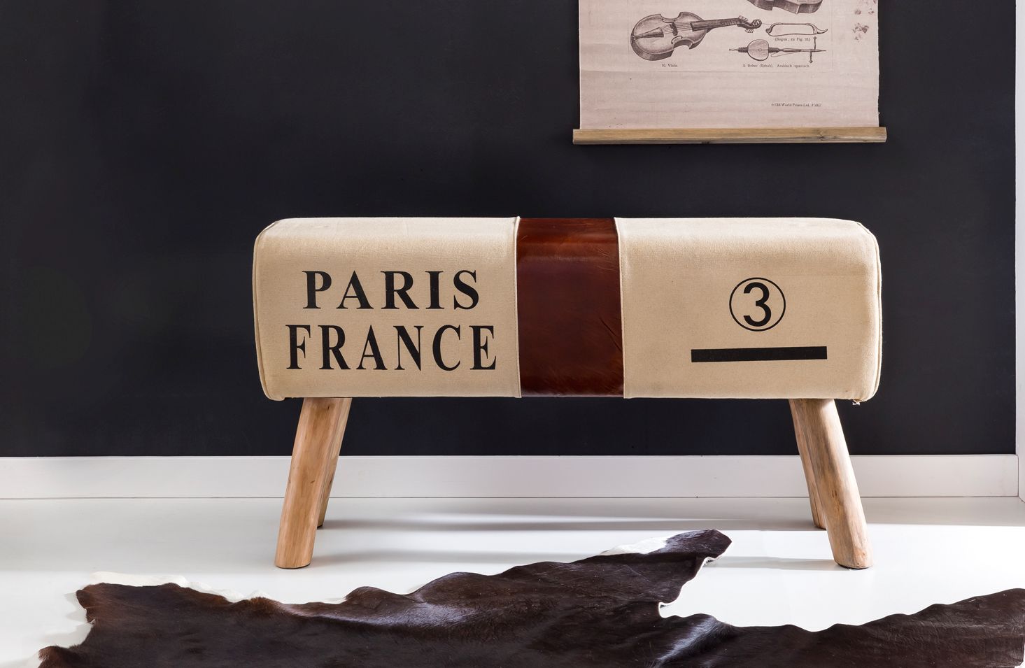 - DESIGN ✔ Sitzbank im Sportlichen \\"Turnbock\\" Design // Kultige Retro-Sitzbank mit Aufdruck // Vier massive Holzbeine // Polsterüberzug aus Leinen und Leder