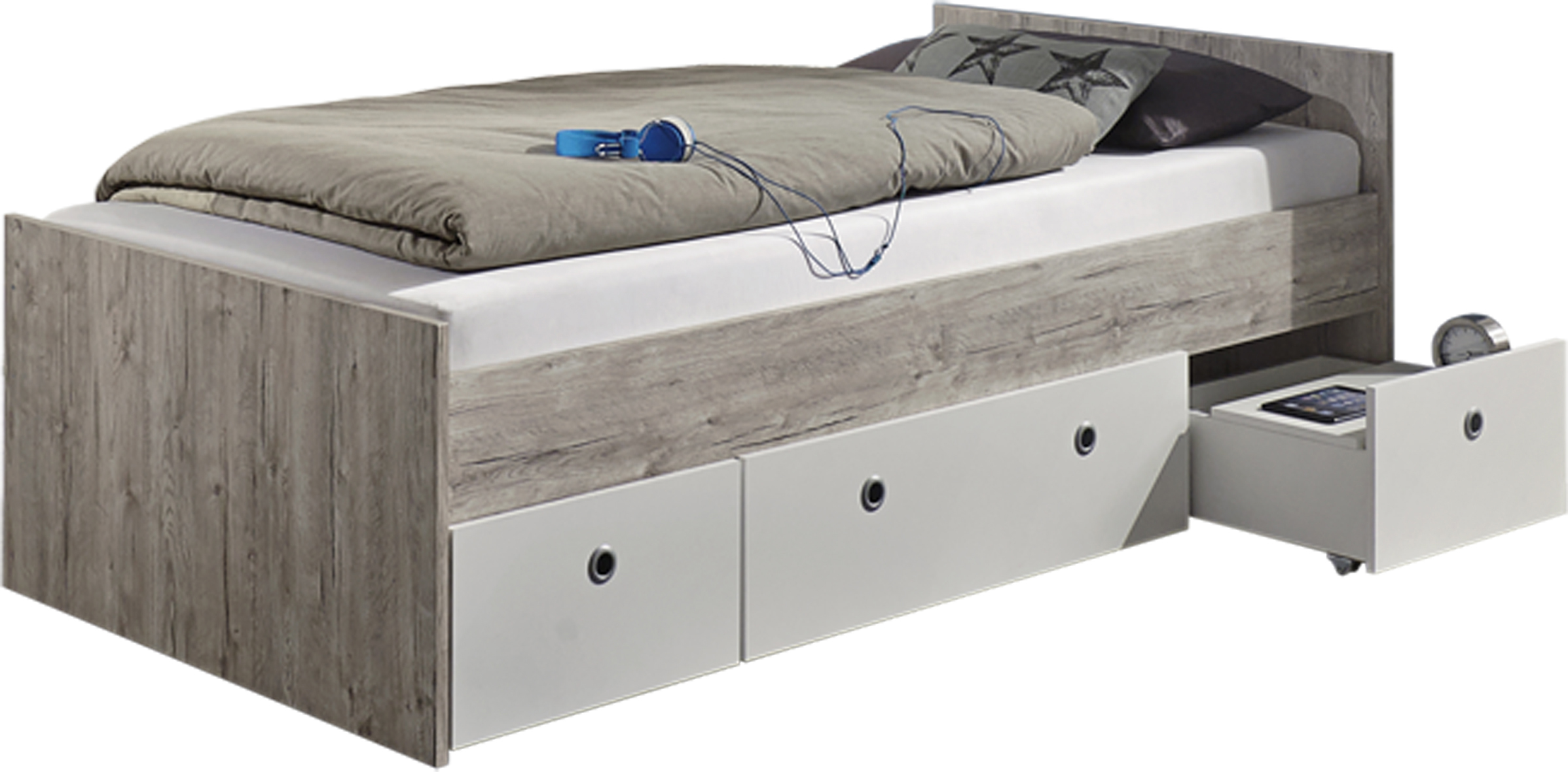 1 Jugendbett mit 3 Rollkästen, davon einer mit flexibler Abdeckung; nutzbar als Nachtschrank-Ablage