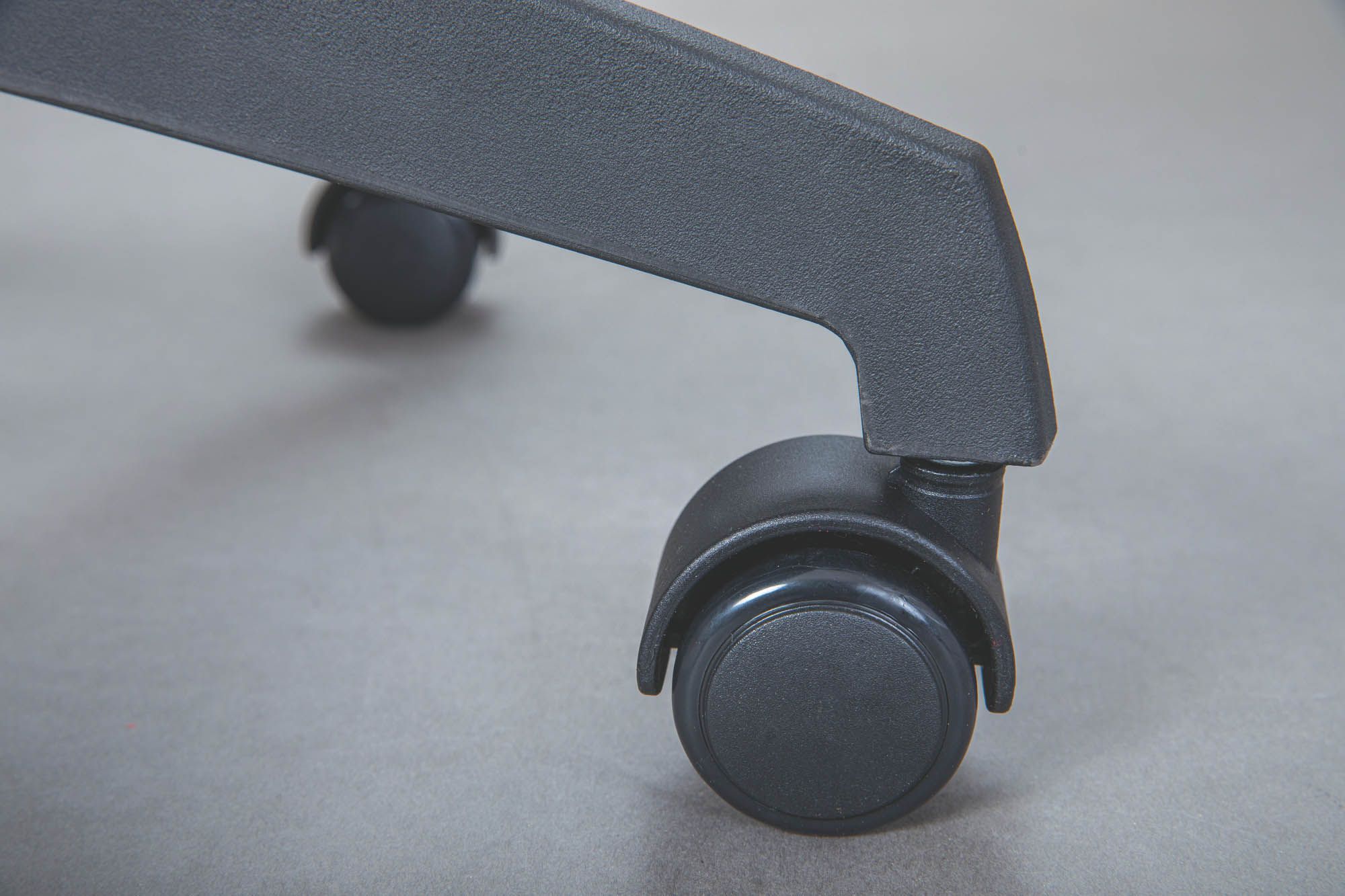 Das schwarze Kunststoffgestell ist mit lastabhängig gebremsten Sicherheitsrollen ausgestattet, die für sicheren Halt sorgen.