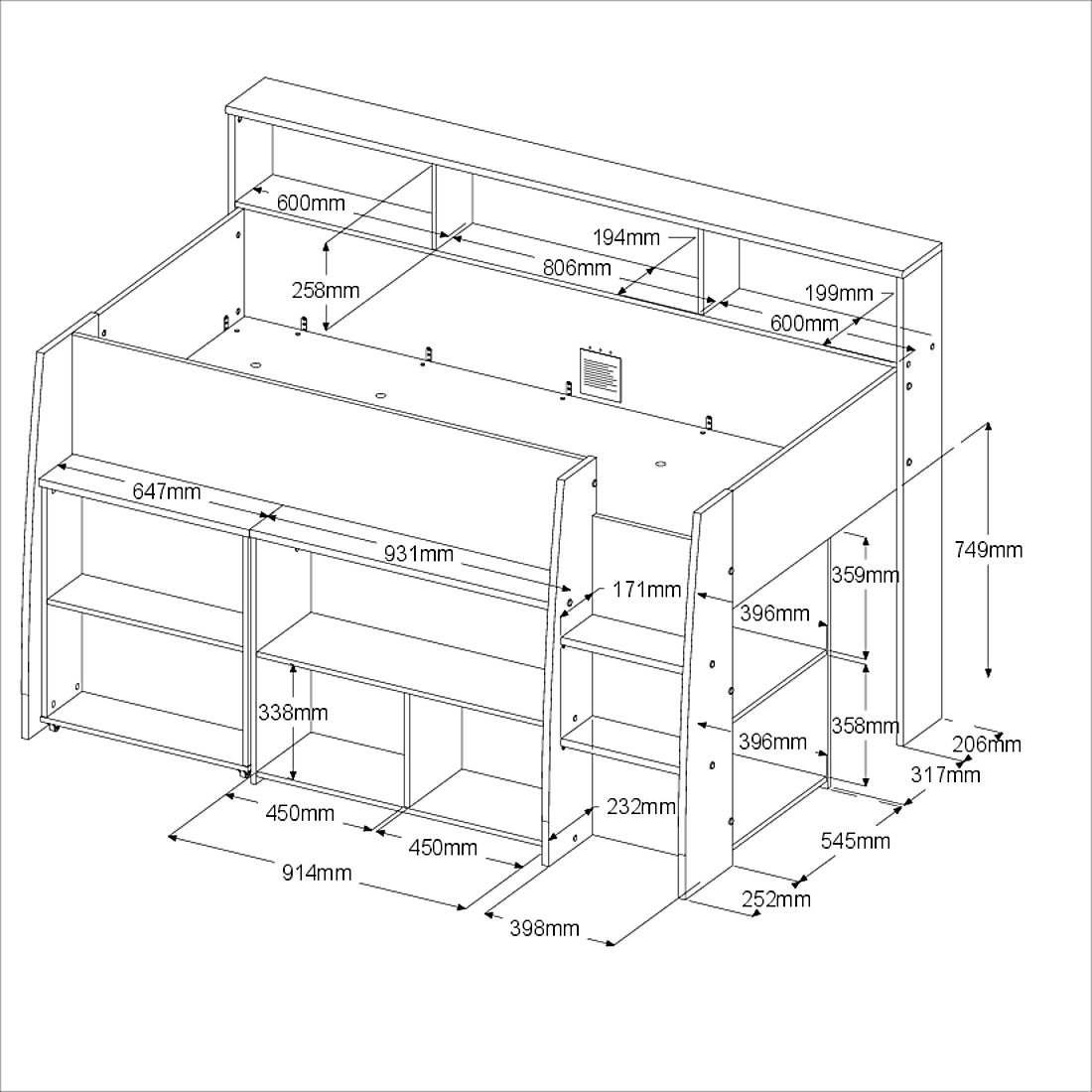| Hochbett mit ausgezogenem Schreibtisch | 209 | 140 | 210 |