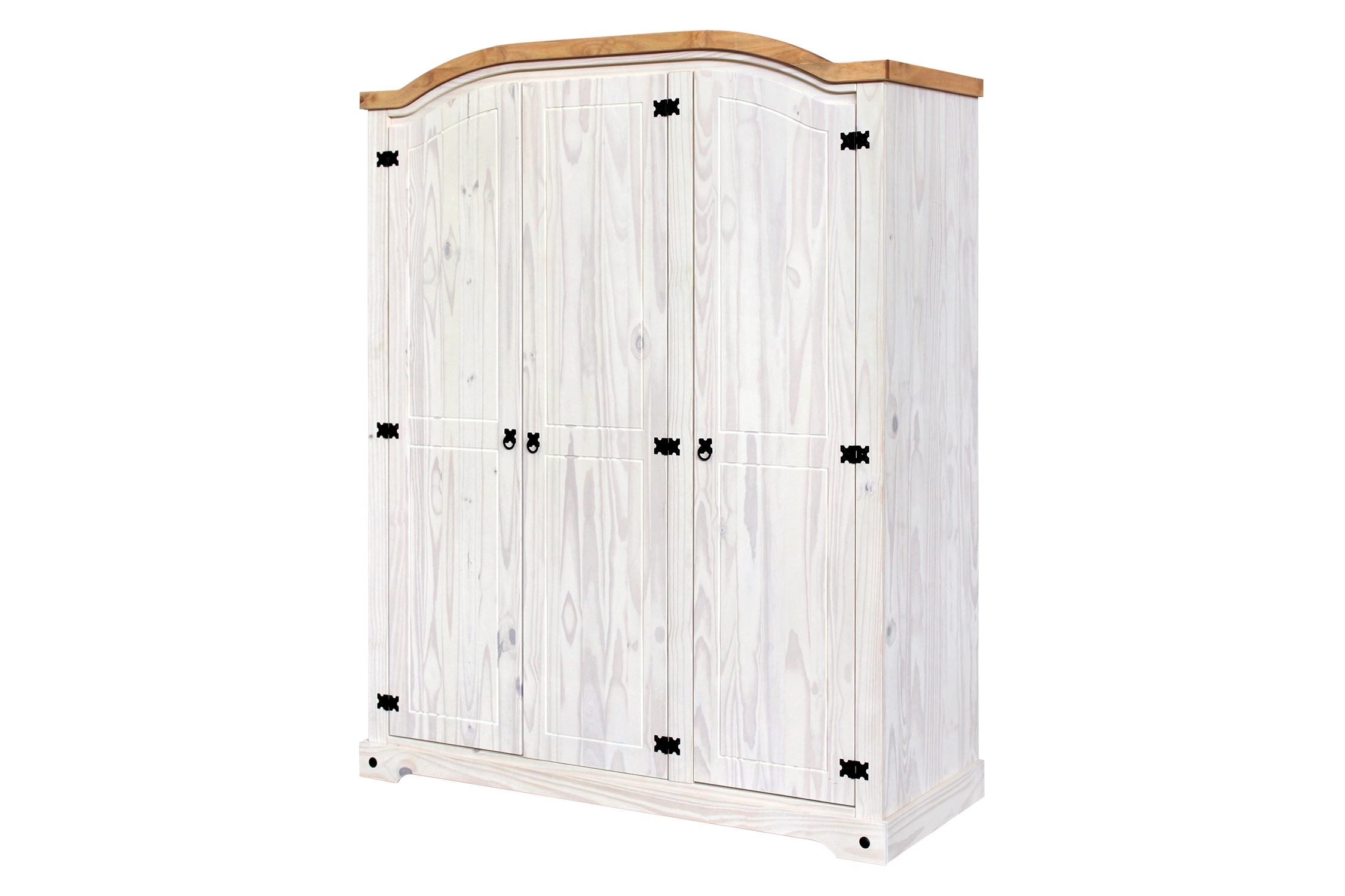 Dieser 3-türige Kleiderschrank sorgt stilvoll für Ordnung in Ihrem Wohnraum. Er wurde aus massivem Kiefernholz gefertigt und bietet hinter drei Türen, mit einer Kleiderstange und Einlegeböden genügend Platz, um viele Kleidungsstücke übersichtlich zu verstauen. Ein weiterer Hingucker ist die geschwungene, honigfarbene Deckplatte. Der Kleiderschrank passt perfekt ins Schlaf- oder Kinderzimmer, macht sich aber auch gut im Flur oder Eingangsbereich. Die massive Kiefer bringt einen Hauch von Landleben ins Heim. Die Oberfläche wurde lackiert, so dass das Möbel unempfindlich ist.