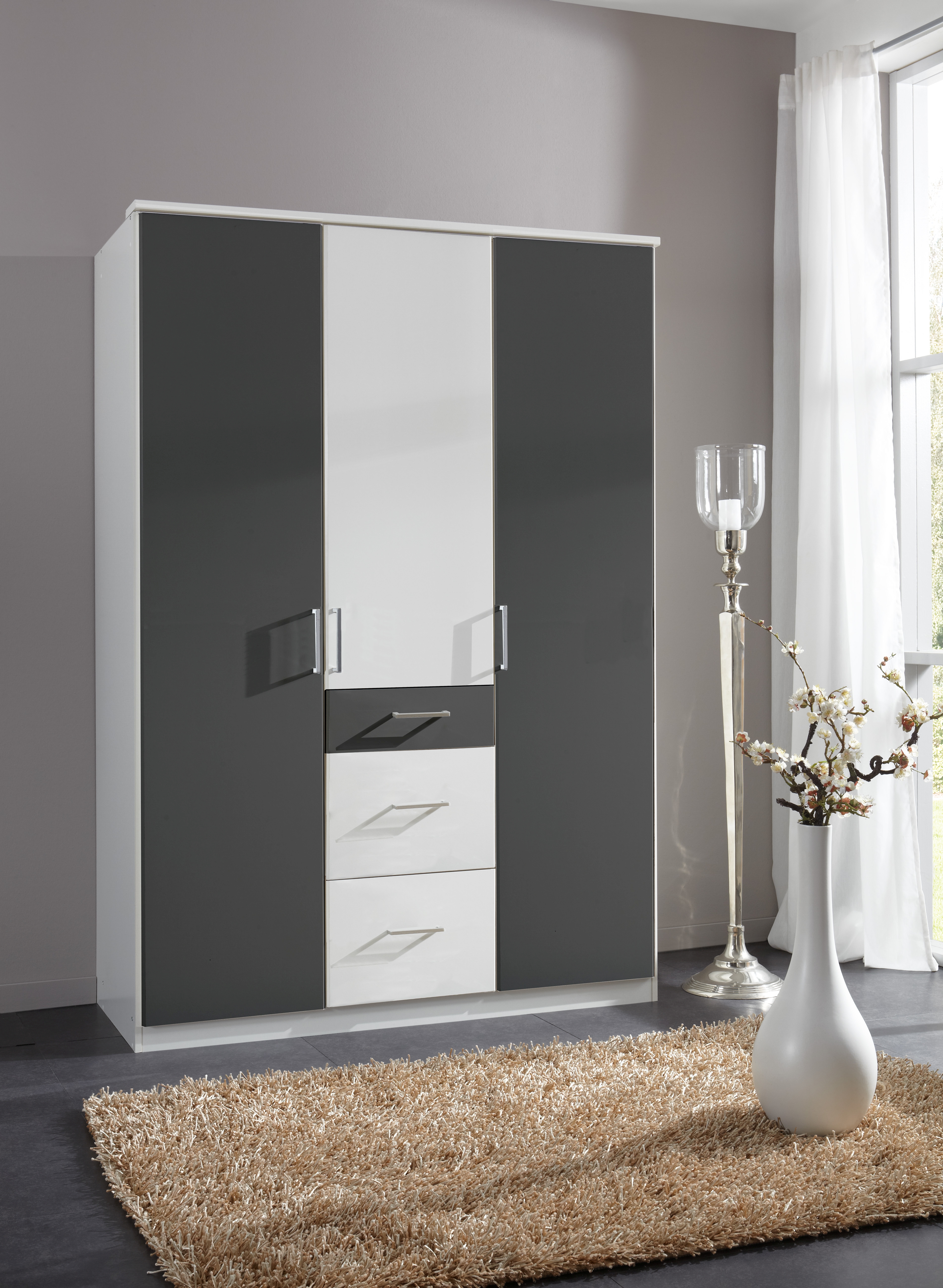 Front und Korpus: Weiß mit Außentüren und Absetzungen in Graphit