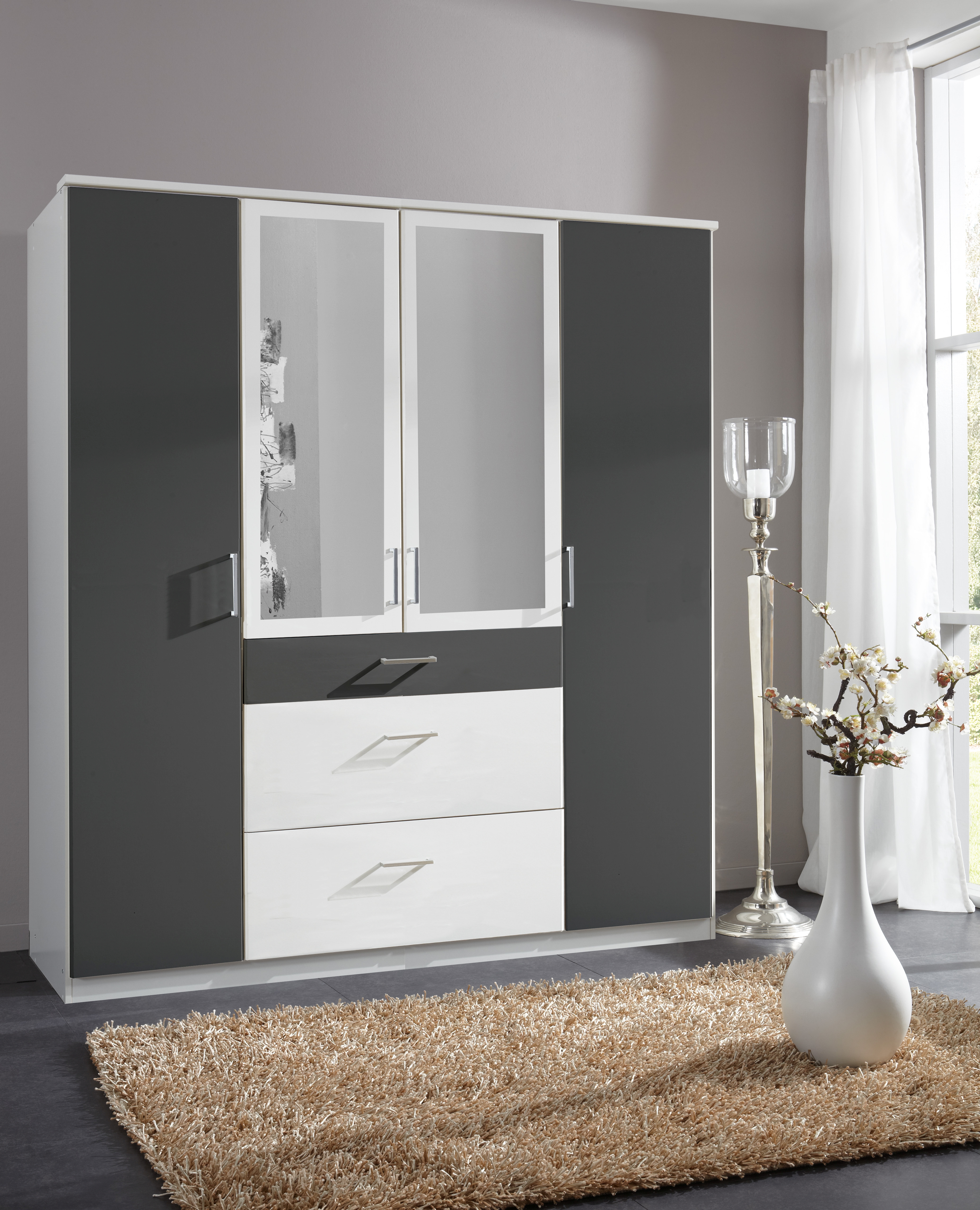 Front und Korpus: Weiß mit Außentüren und Absetzungen in Graphit / Spiegel