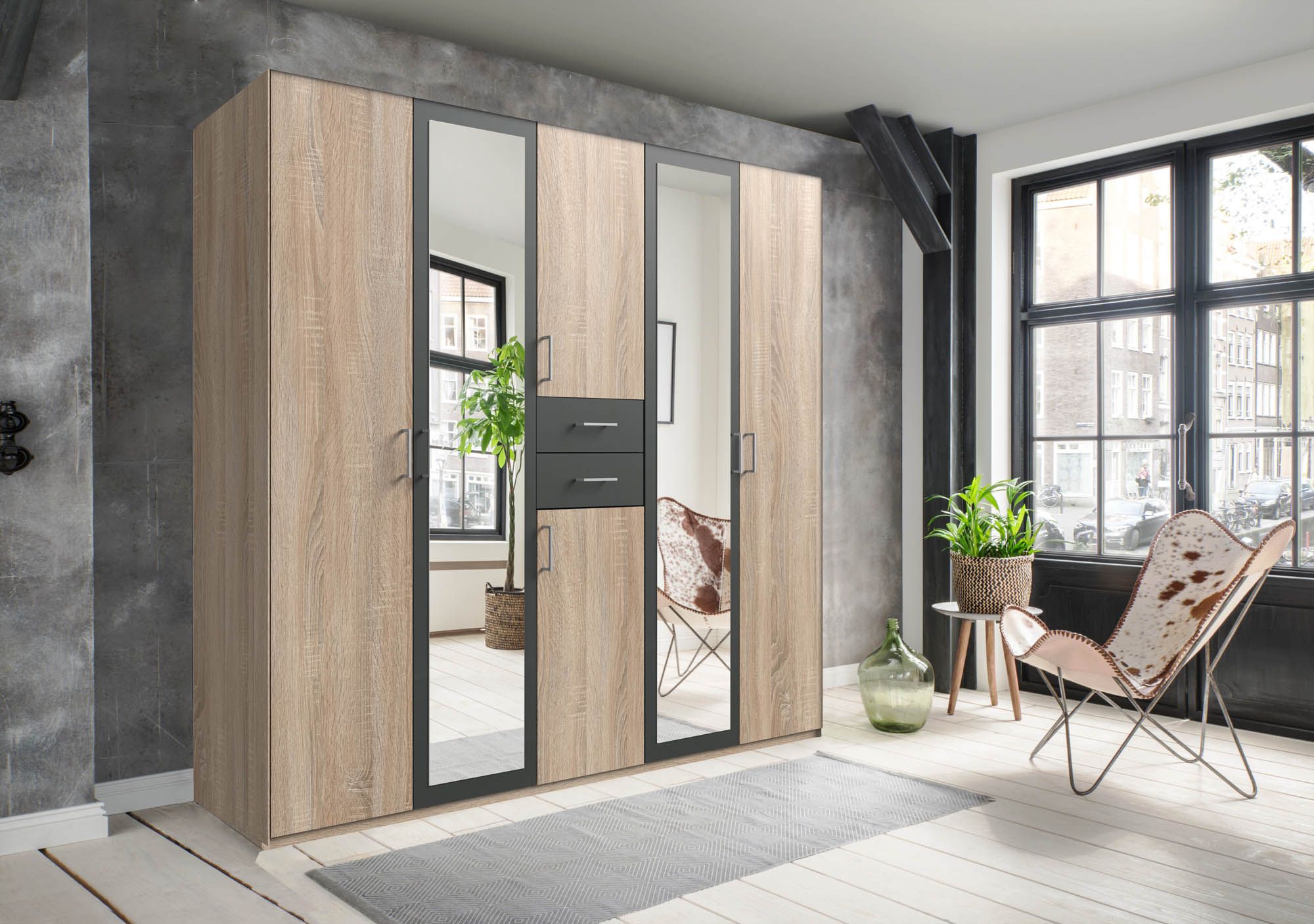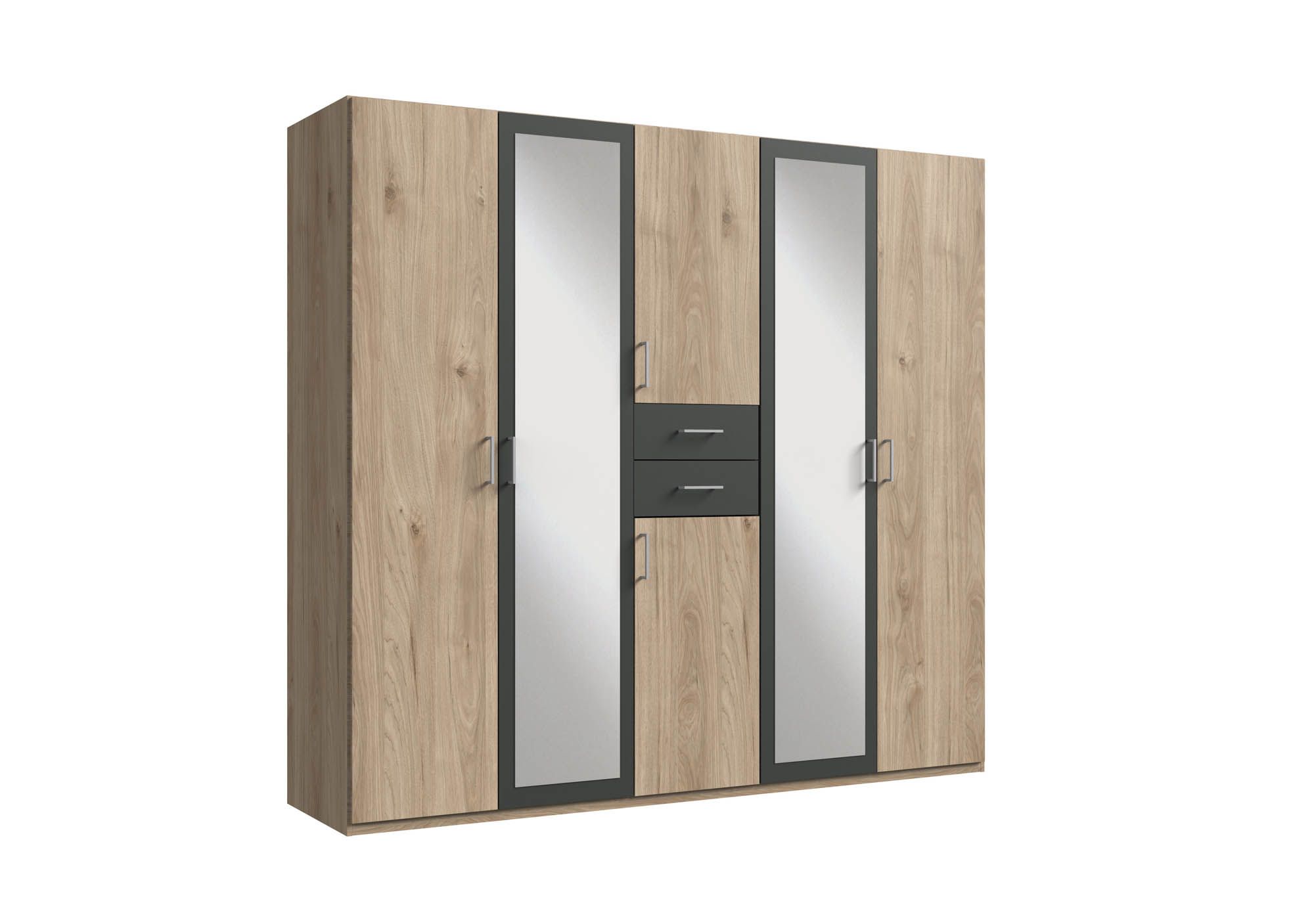 Korpus und Front: Eiche sägerau Holznachbildung kombiniert mit Absetzungen in Graphit / Spiegel