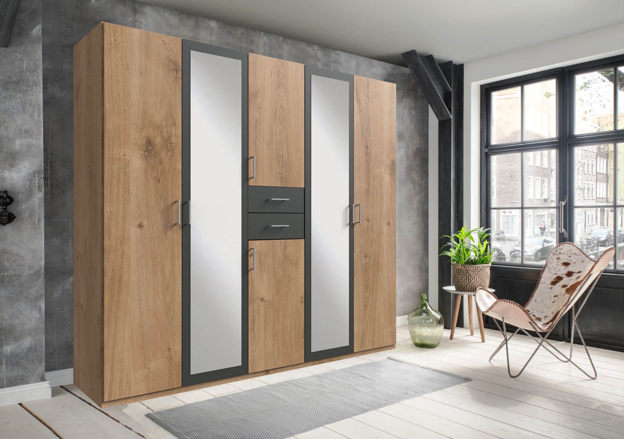 Korpus und Front: Plankeneiche Holznachbildung kombiniert mit Absetzungen in Graphit / Spiegel