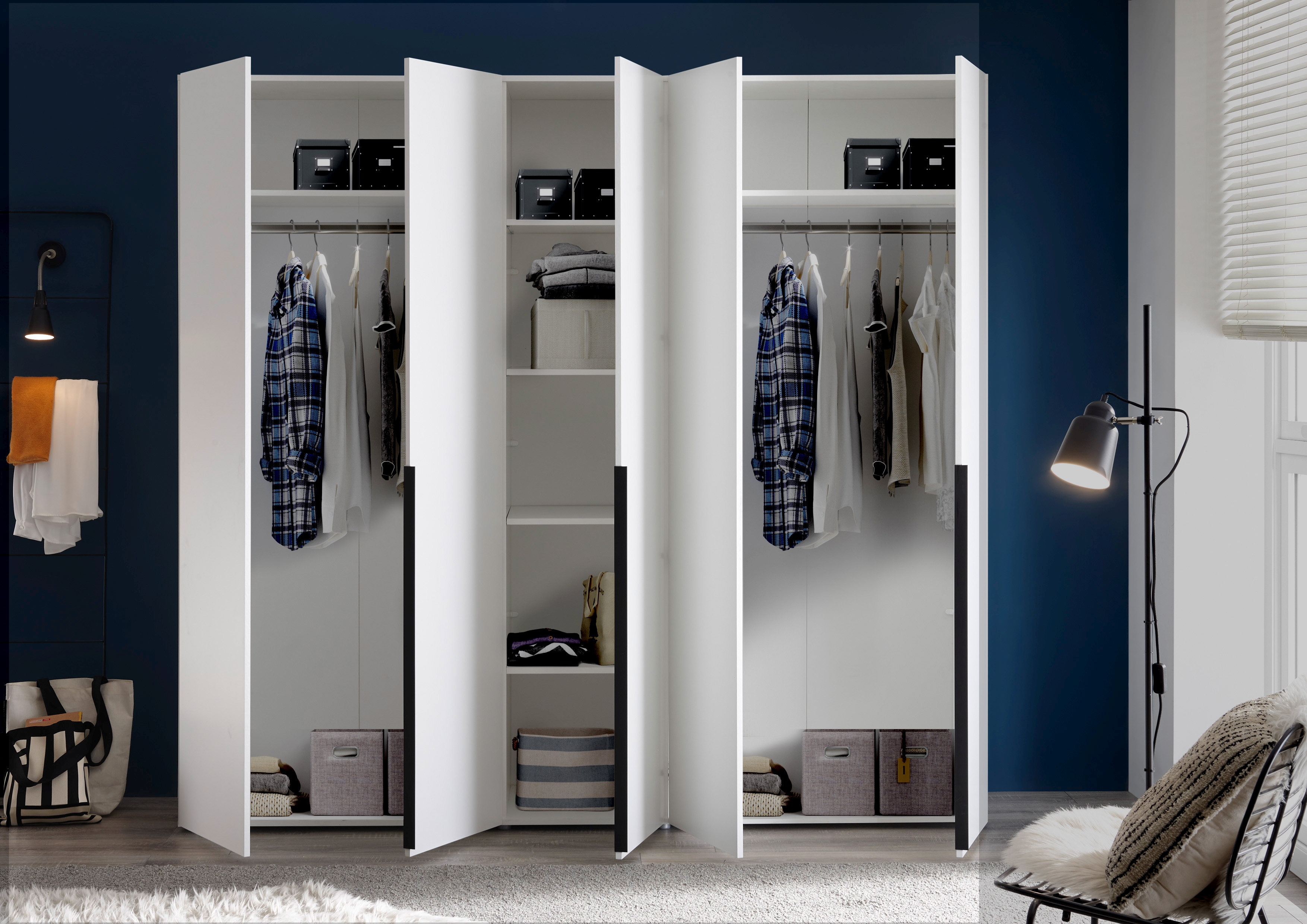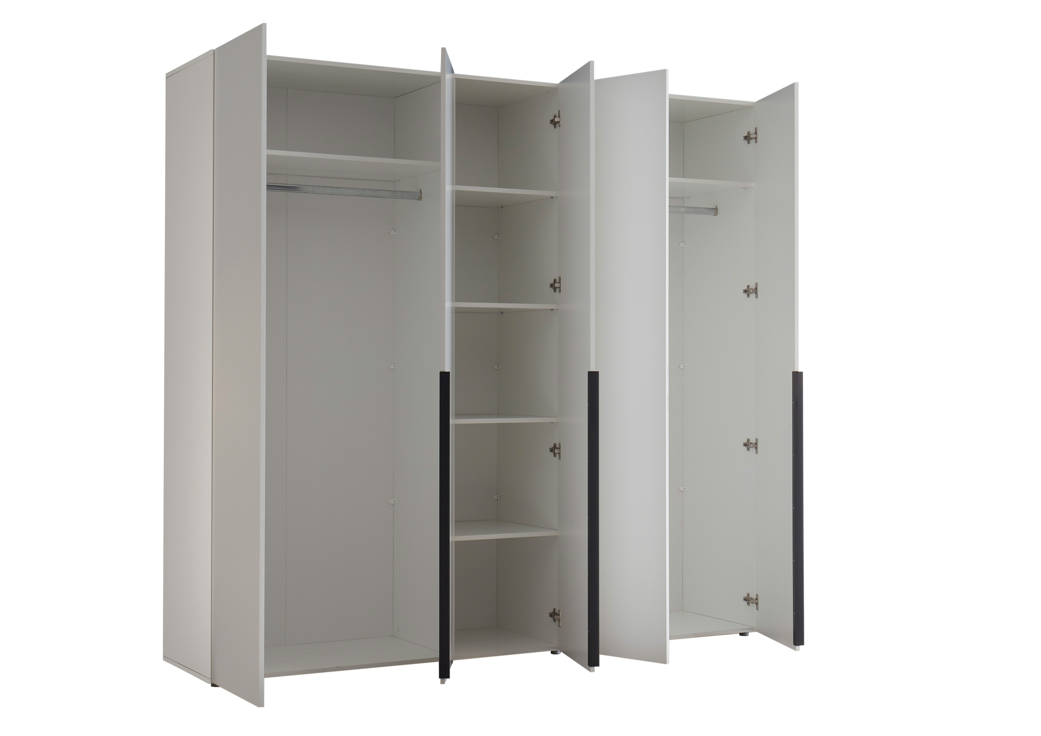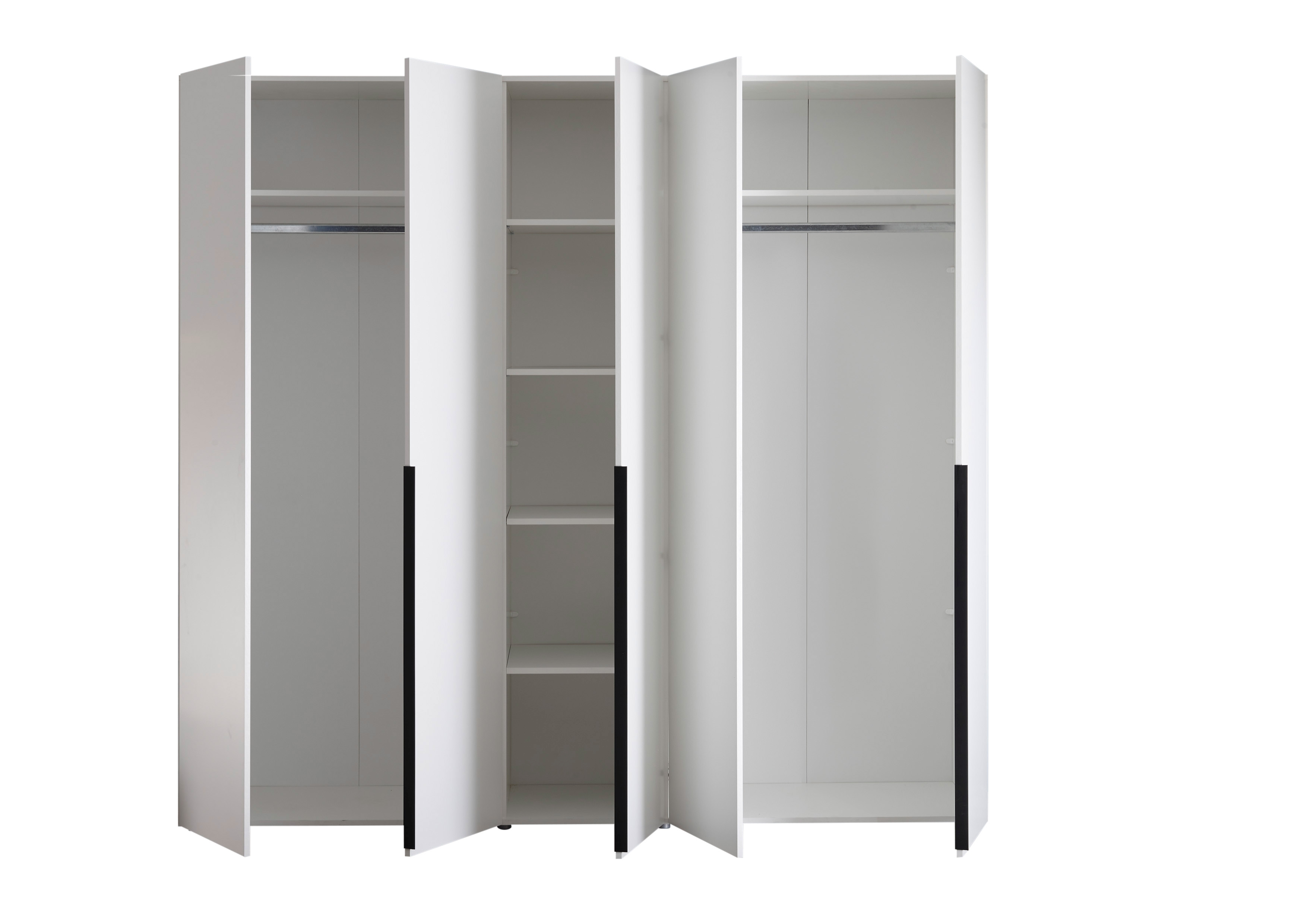 Inneneinteilung: 2 Mittelseiten, außen jeweils 1 Boden und 1 Kleiderstange, mittig 4 Böden