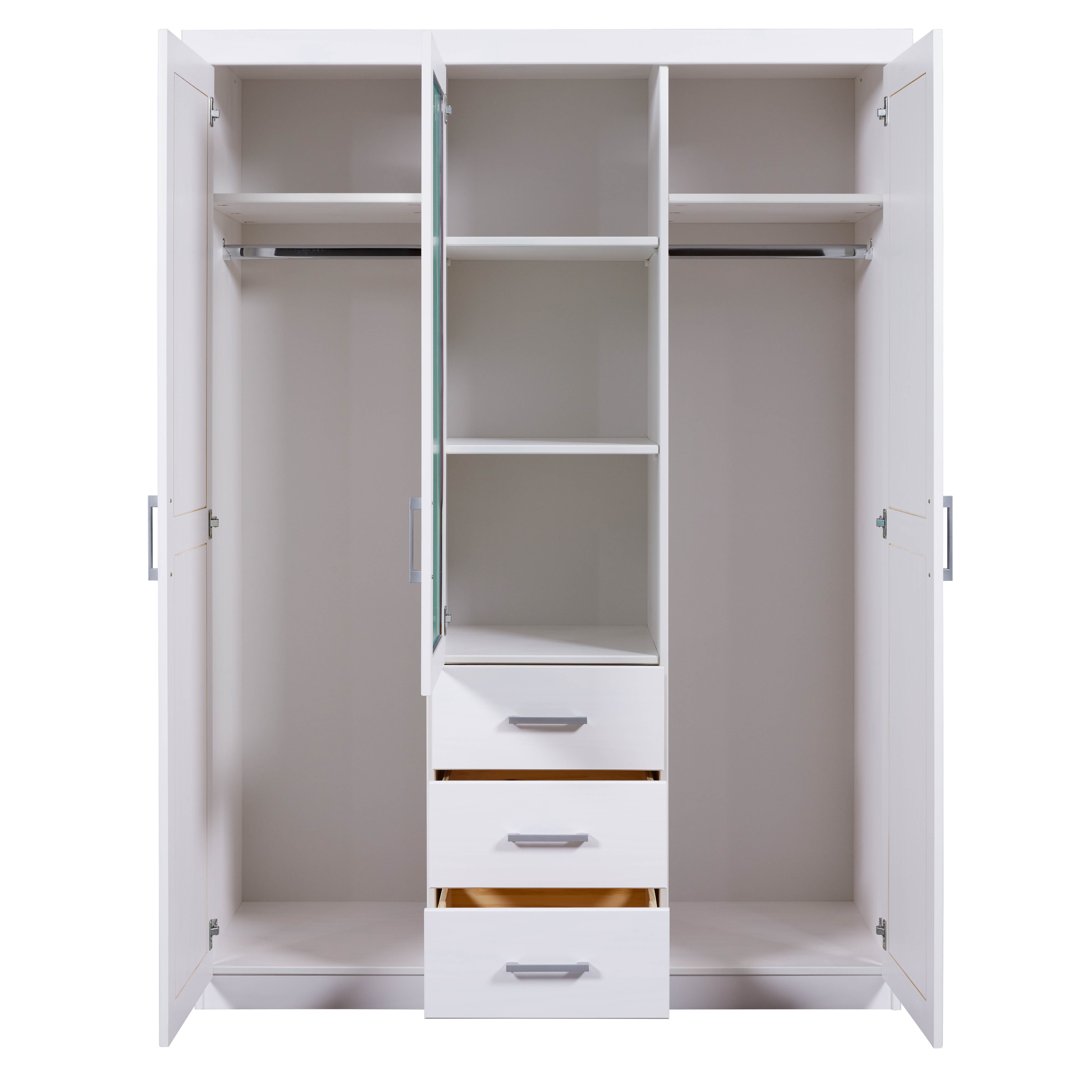 Der 3-türige Schrank besticht mit seiner weißen Oberfläche und bietet mit 5 Fachböden und zwei Kleiderstangen ausreichend Stauraum für Ihre liebsten Kleidungsstücke.
