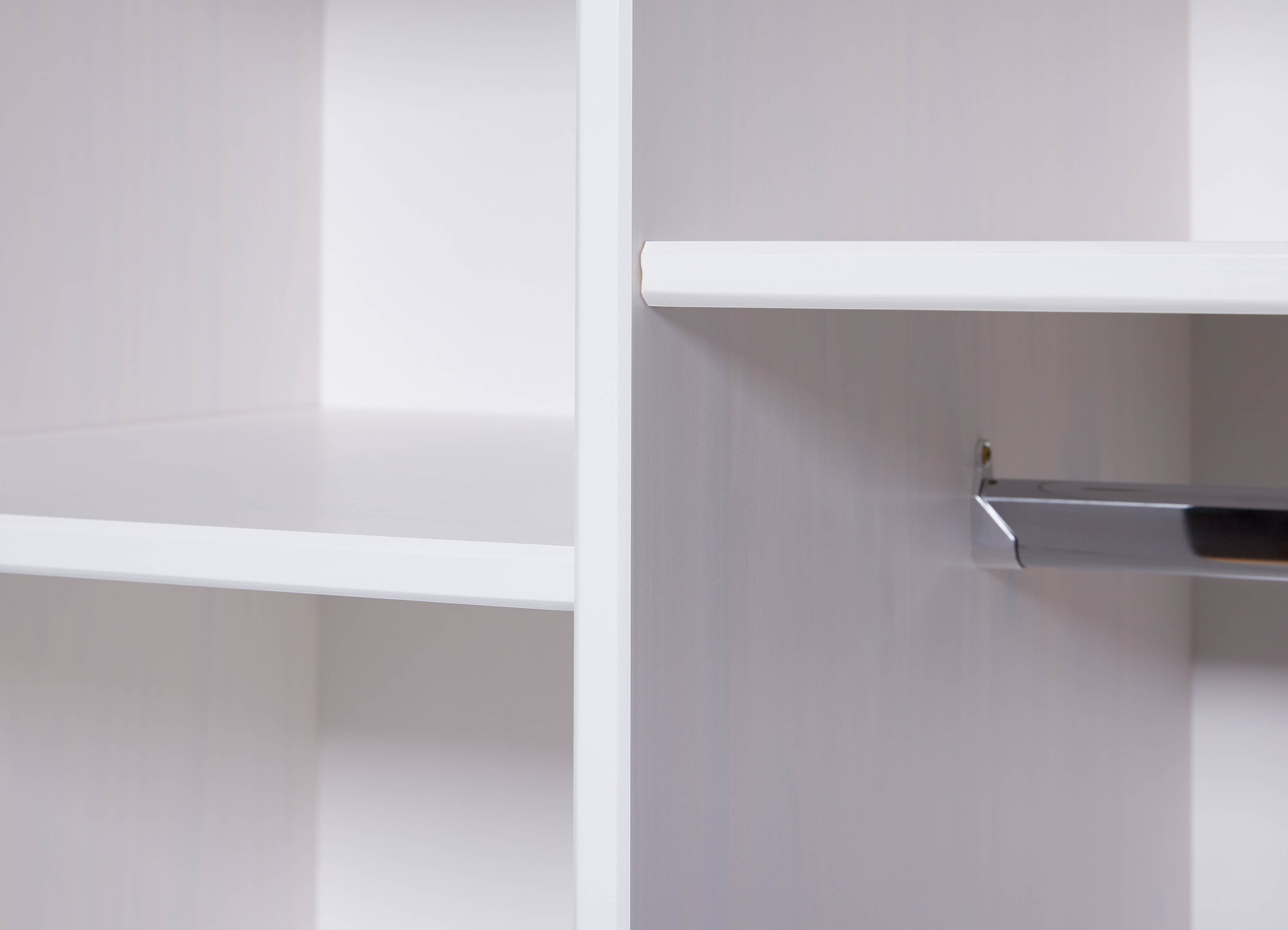 - hinter der rechten und linken Türe befinden sich jeweils ein Fachboden und eine Kleiderstange