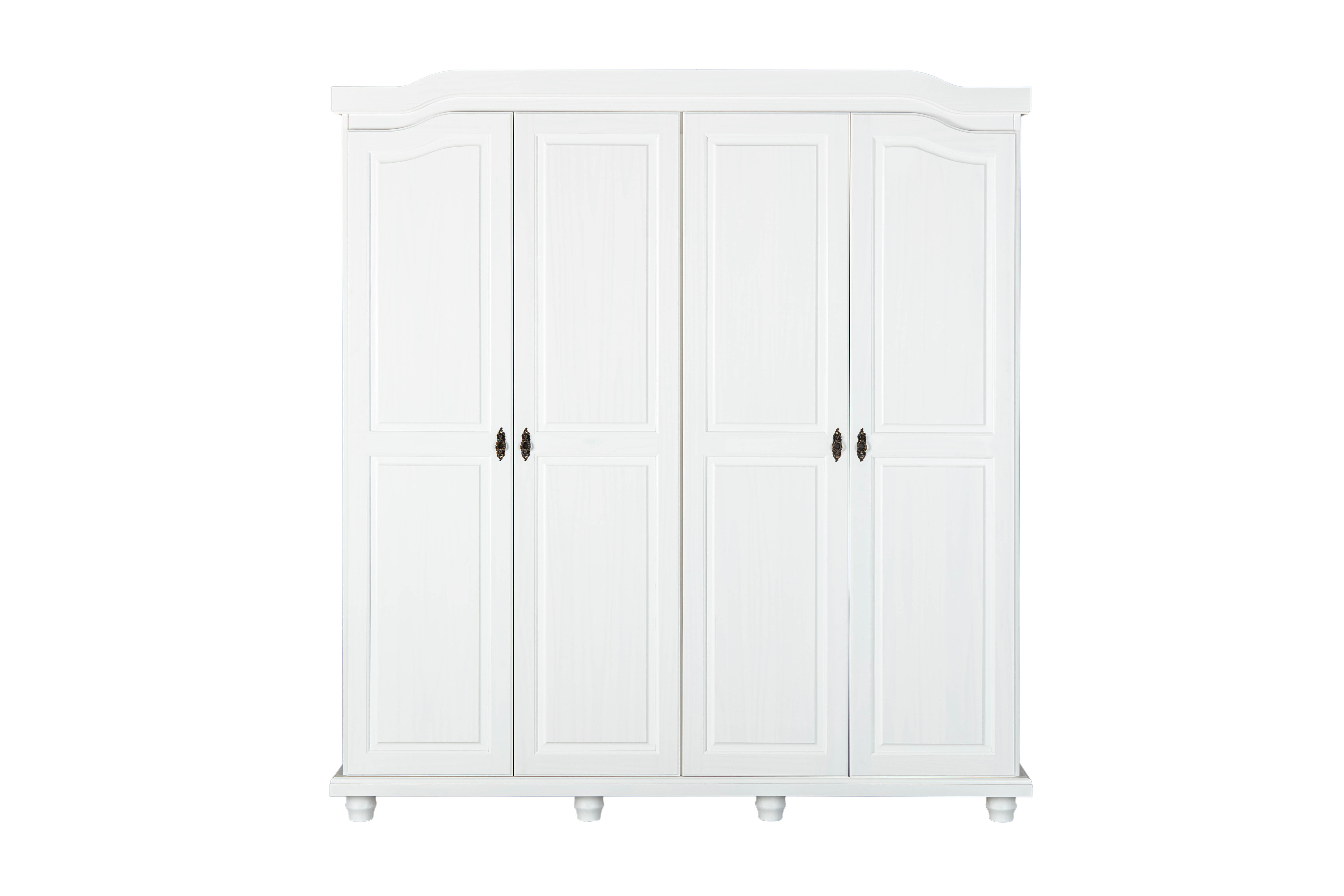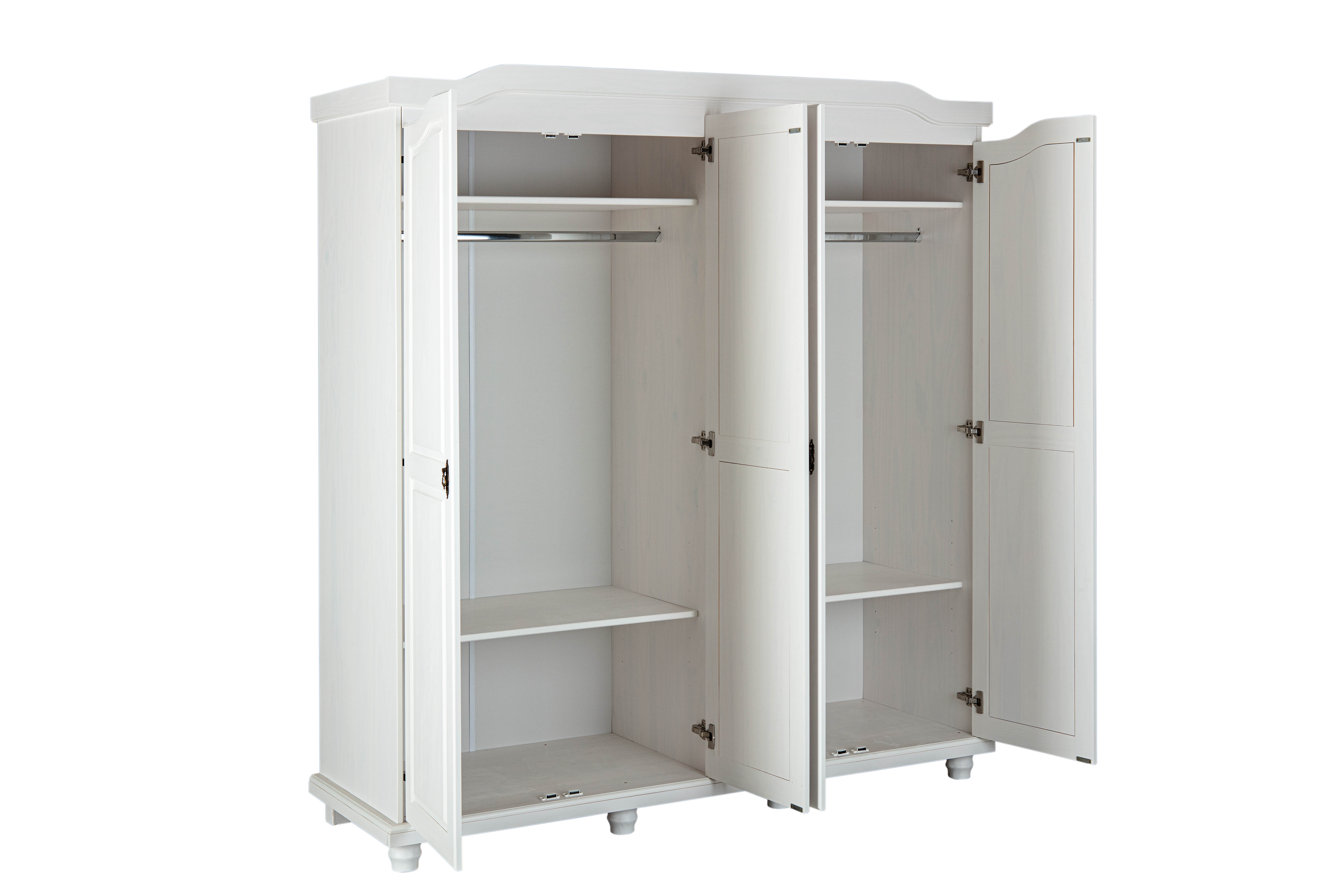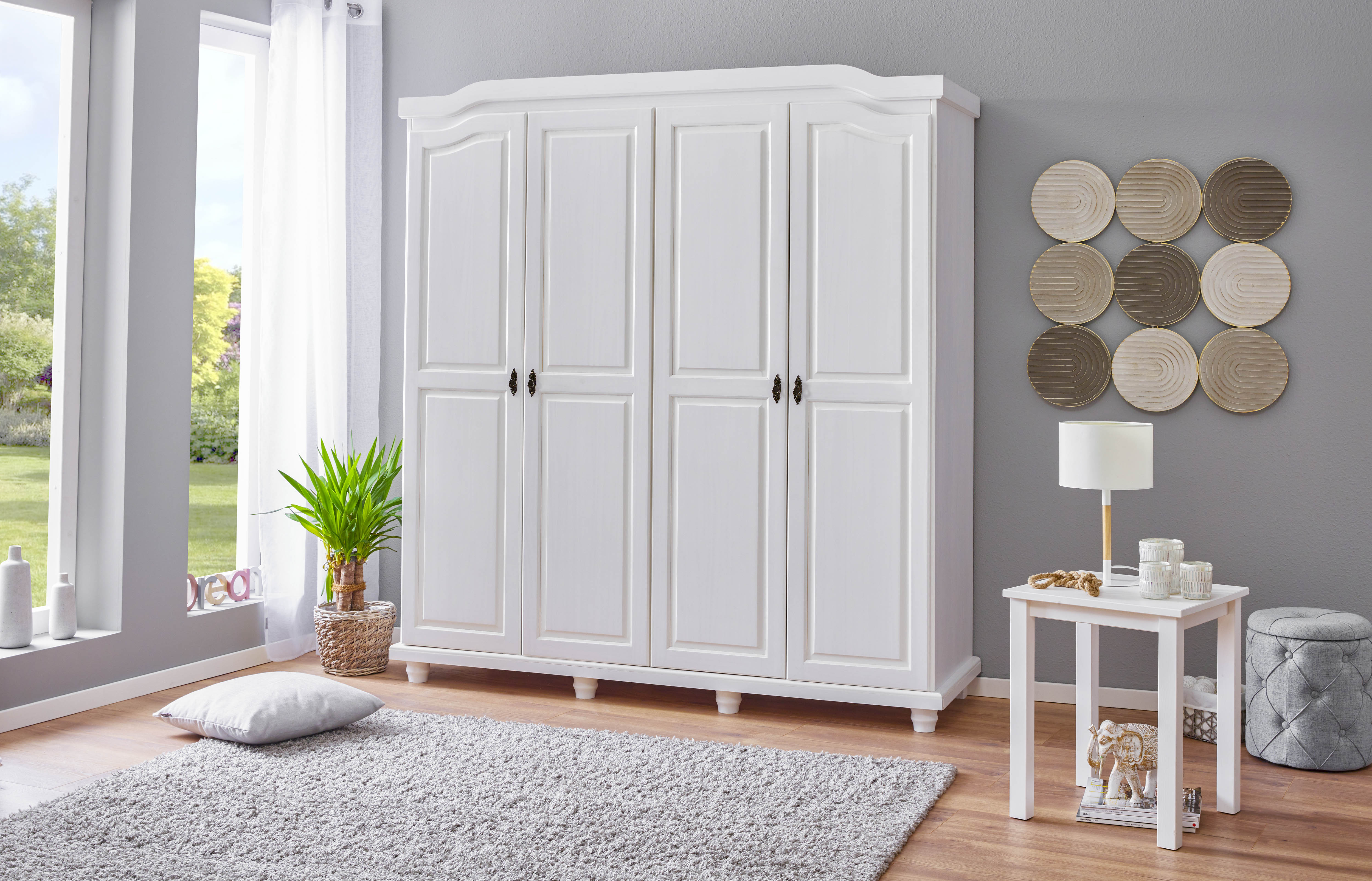 Die weiße, transparente Lackierung des 4-türigen Schranks lässt natürliche Massivholzmaserungen in der Oberfläche erkennen. Durch 4 Fachböden und zwei Kleiderstangen bietet er ausreichend Stauraum für Ihre liebsten Kleidungsstücke!