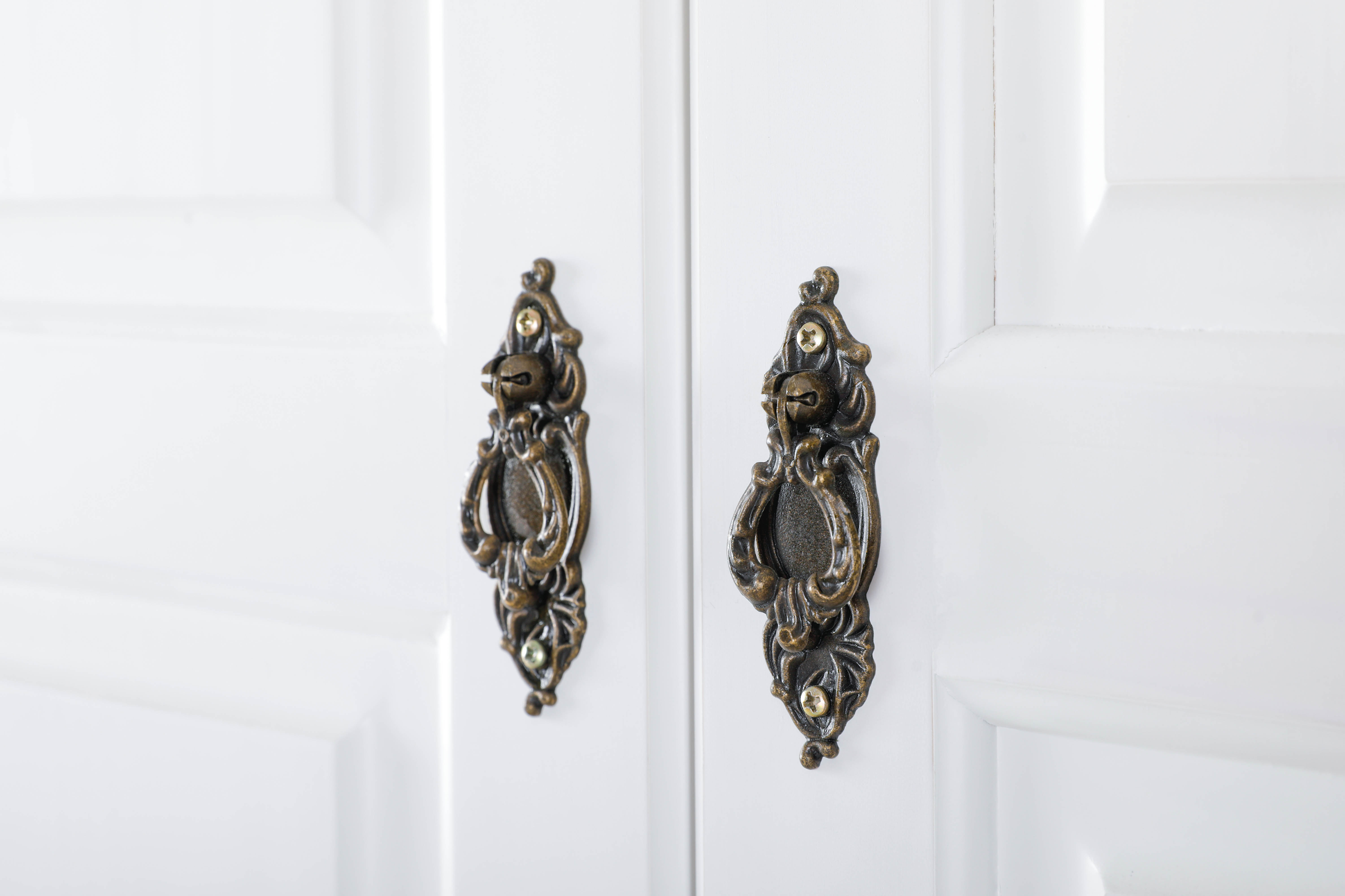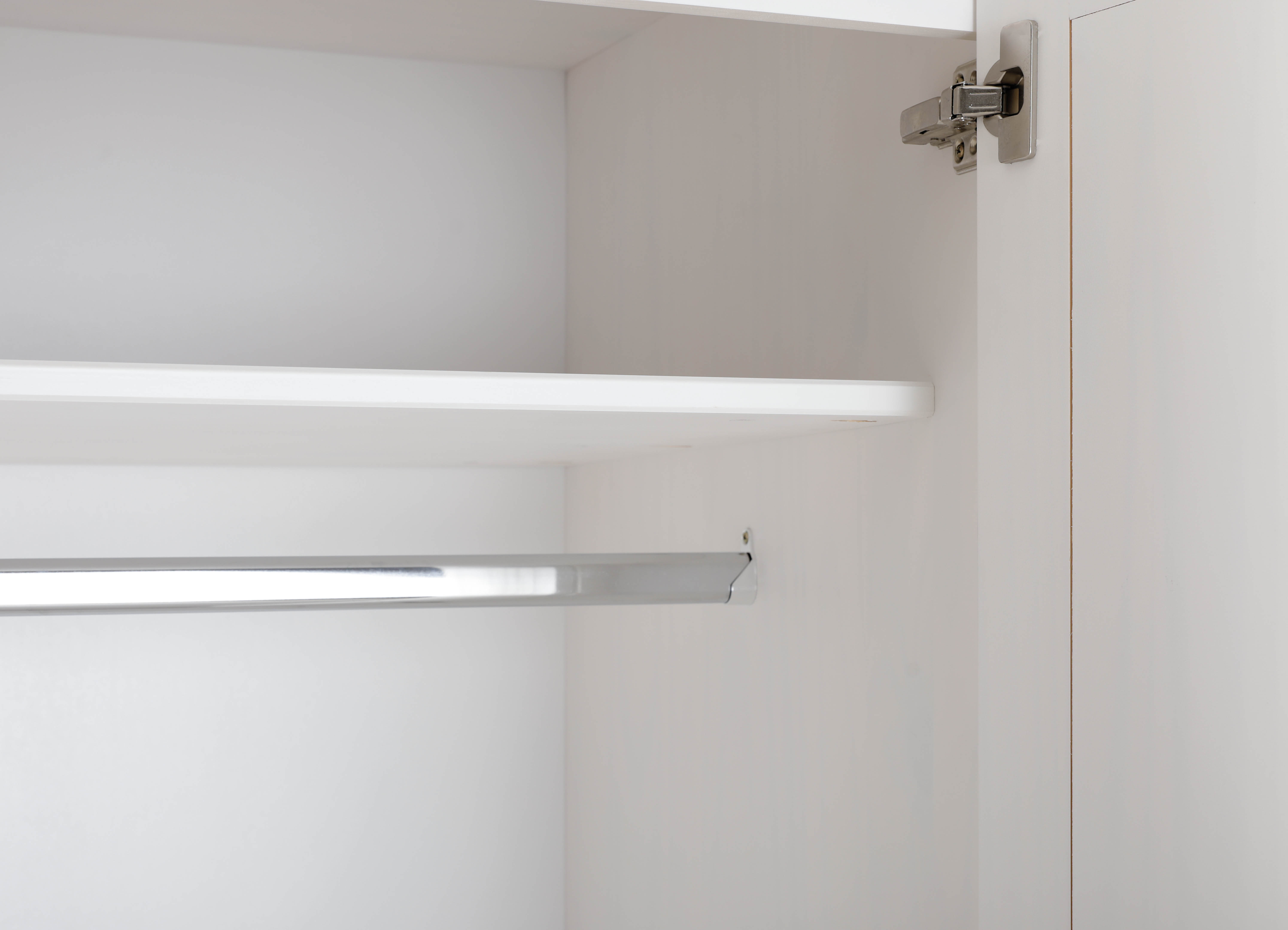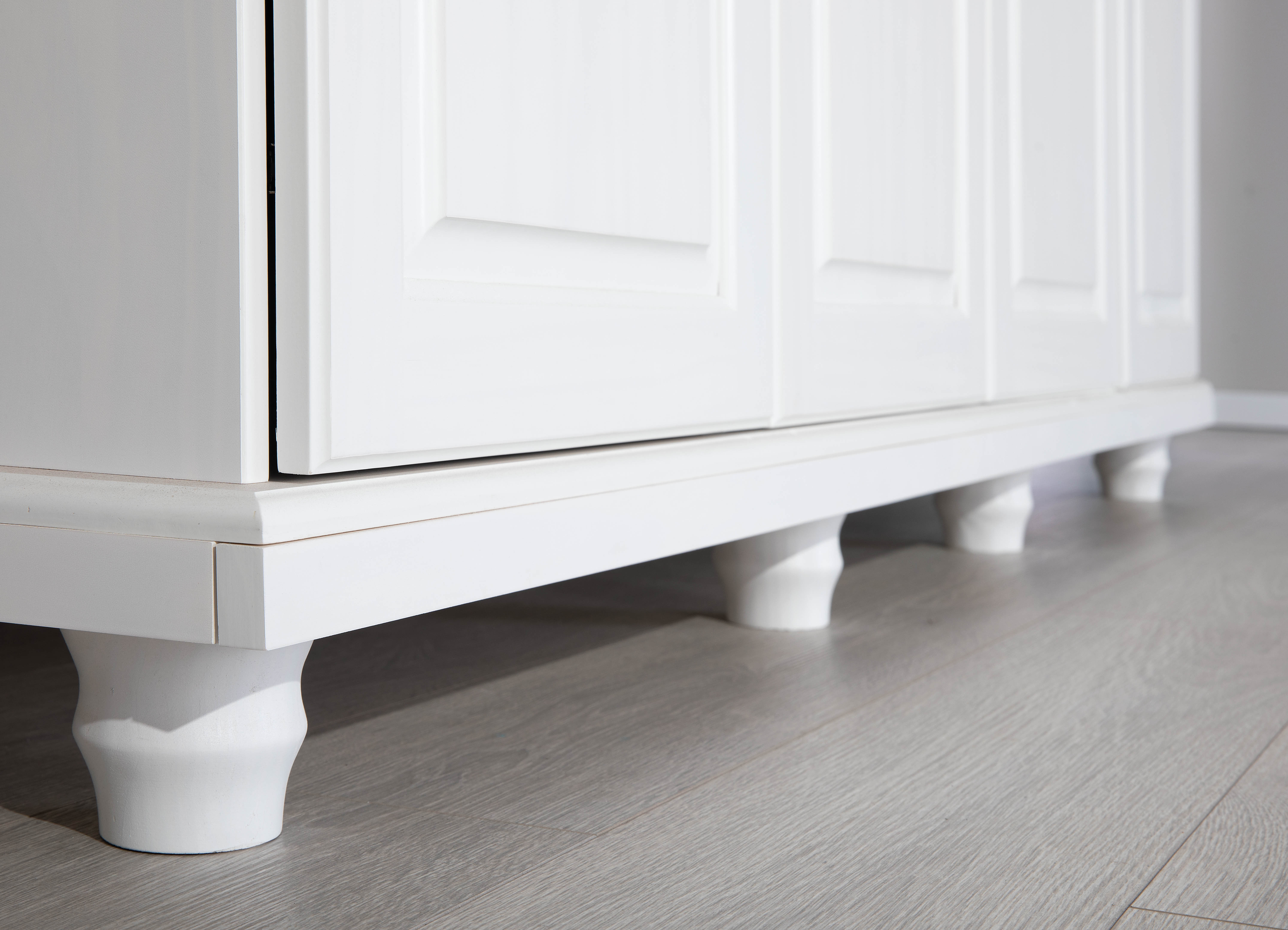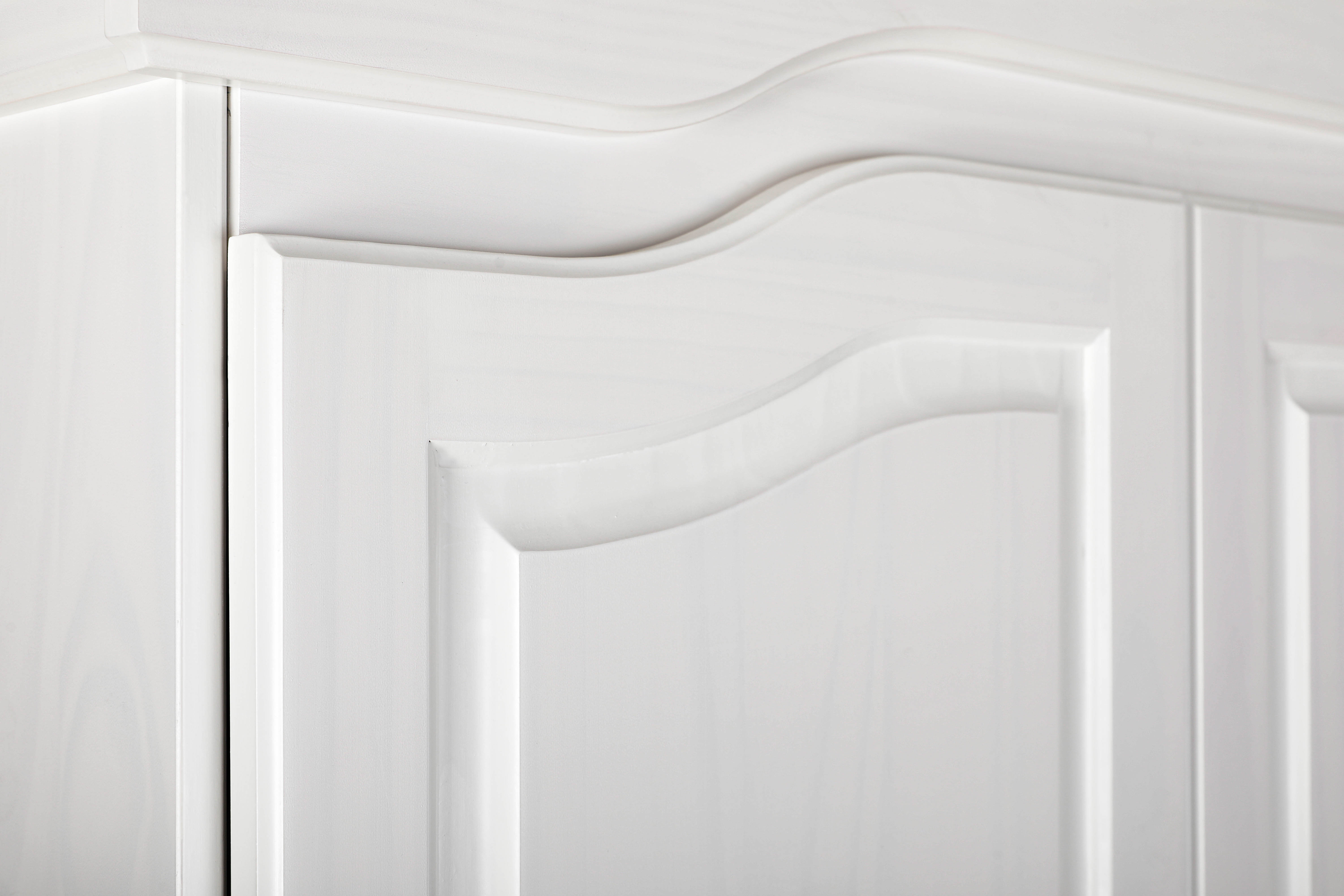 Die weiße, transparente Lackierung des 4-türigen Schranks lässt natürliche Massivholzmaserungen in der Oberfläche erkennen. Durch 4 Fachböden und zwei Kleiderstangen bietet er ausreichend Stauraum für Ihre liebsten Kleidungsstücke!