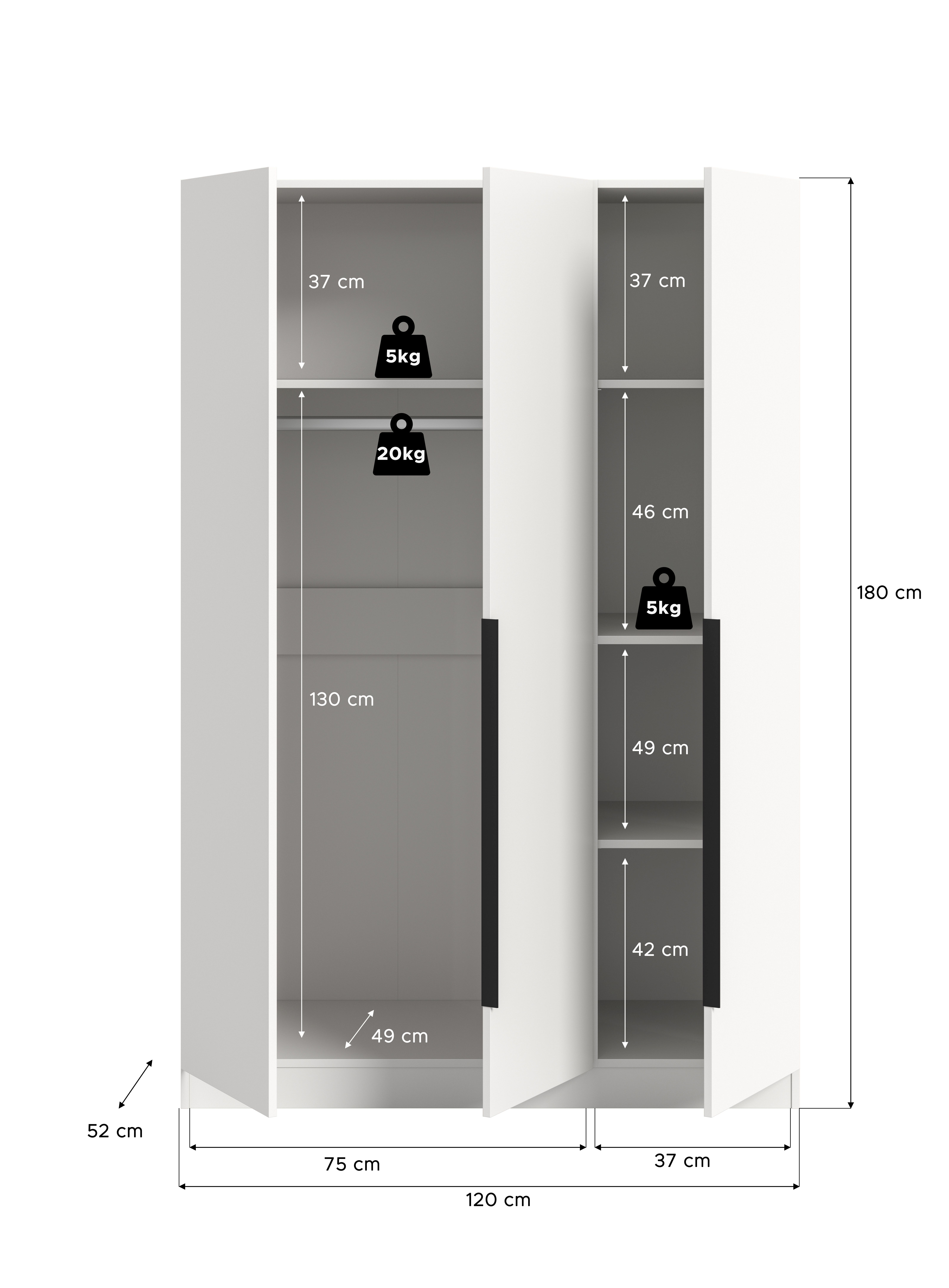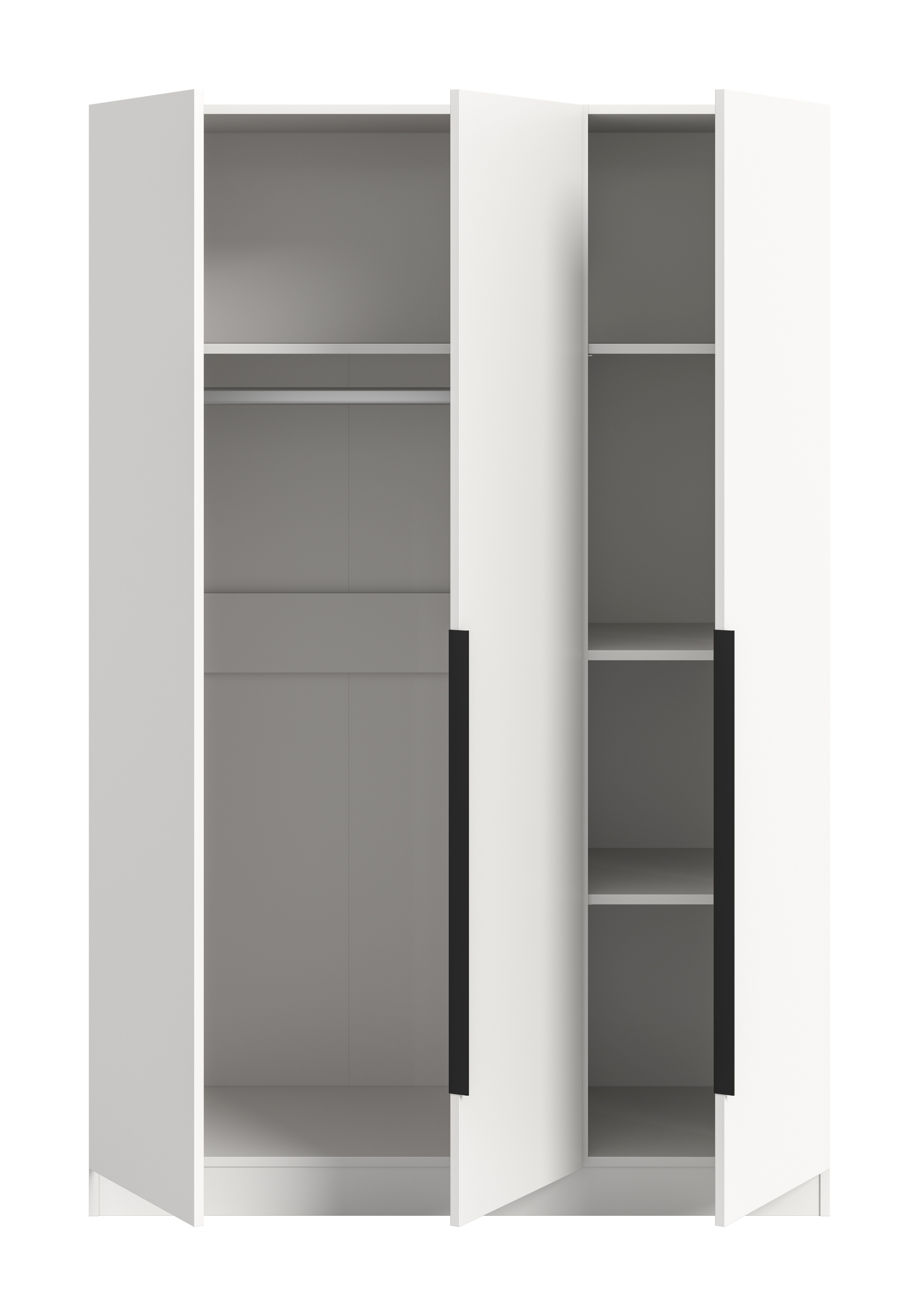 Dieser 3-türige Kleiderschrank bietet Ihnen die perfekte Lösung, um Ihre Kleidung stilvoll und ordentlich zu verstauen und so mehr Ordnung und Ruhe in Ihr Zuhause zu bringen. Stellen Sie sich vor, wie angenehm es ist, morgens schnell das passende Outfit zu finden und dabei den Überblick zu behalten – ein Gefühl von Leichtigkeit und Struktur, das Ihren Alltag erleichtert. Mit seinem modernen Design fügt sich der Schrank elegant in jeden Raum ein und überzeugt durch seine hochwertige Verarbeitung. Die praktische Kleiderstange sorgt für ausreichenden Platz zum Aufhängen Ihrer Lieblingsstücke, während die optionalen Einlegeböden zusätzlichen Stauraum für gefaltete Kleidung oder Accessoires bieten. Die pflegeleichten Oberflächen lassen sich mühelos reinigen, sodass Ihr Schrank auch nach langer Nutzung stets gepflegt aussieht.