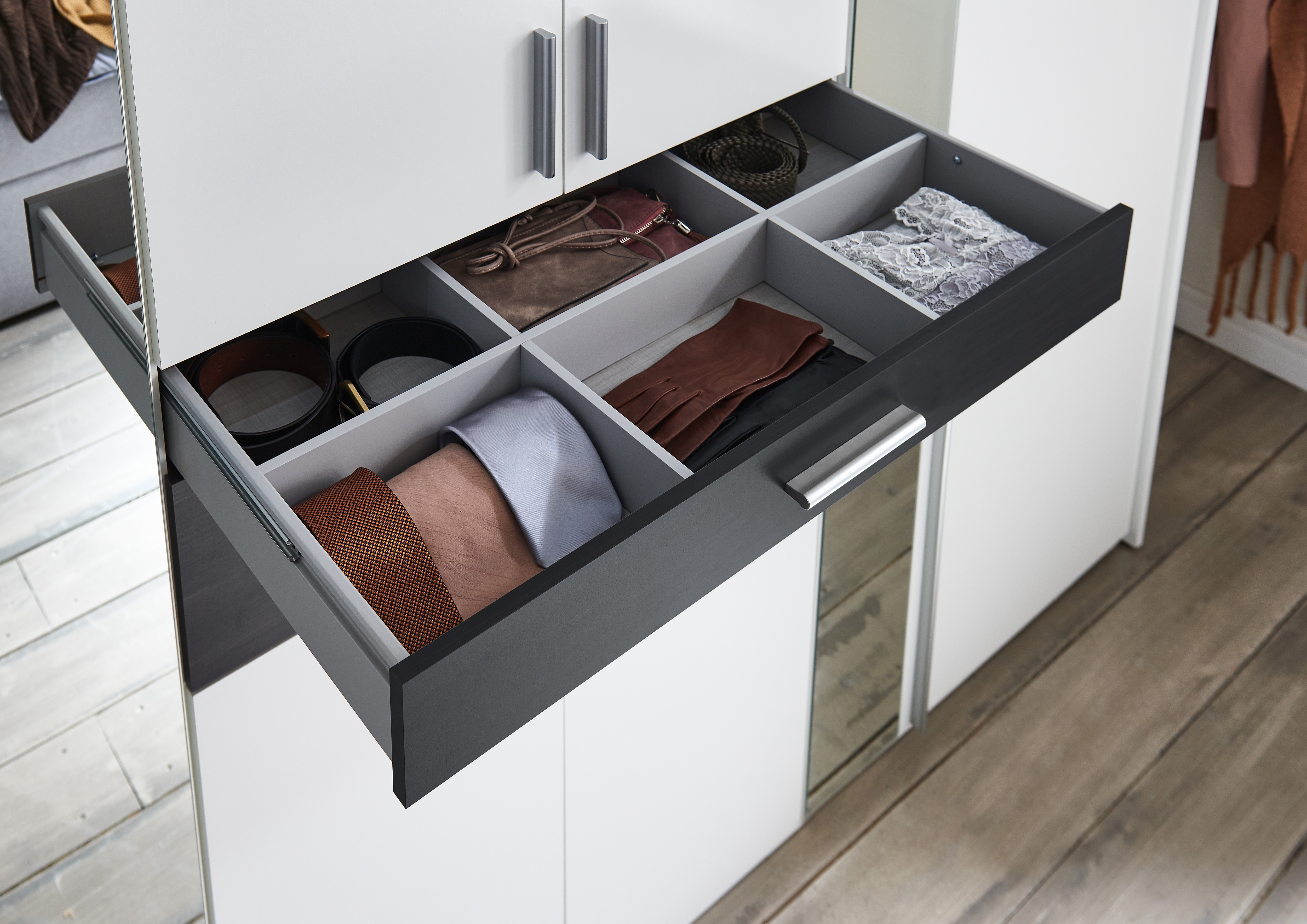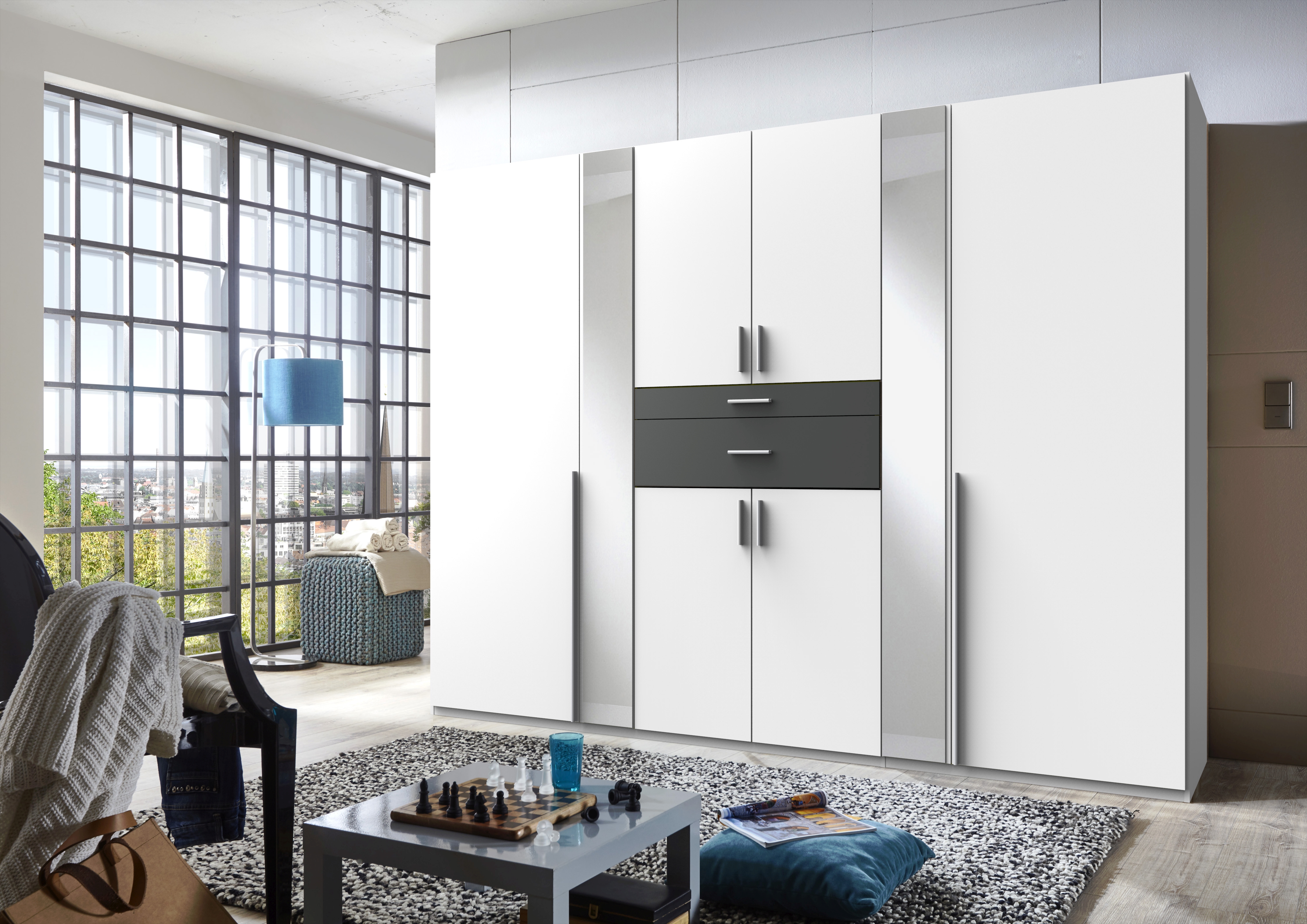 Front: Weiß mit Schubkästen in Graphit / Spiegel