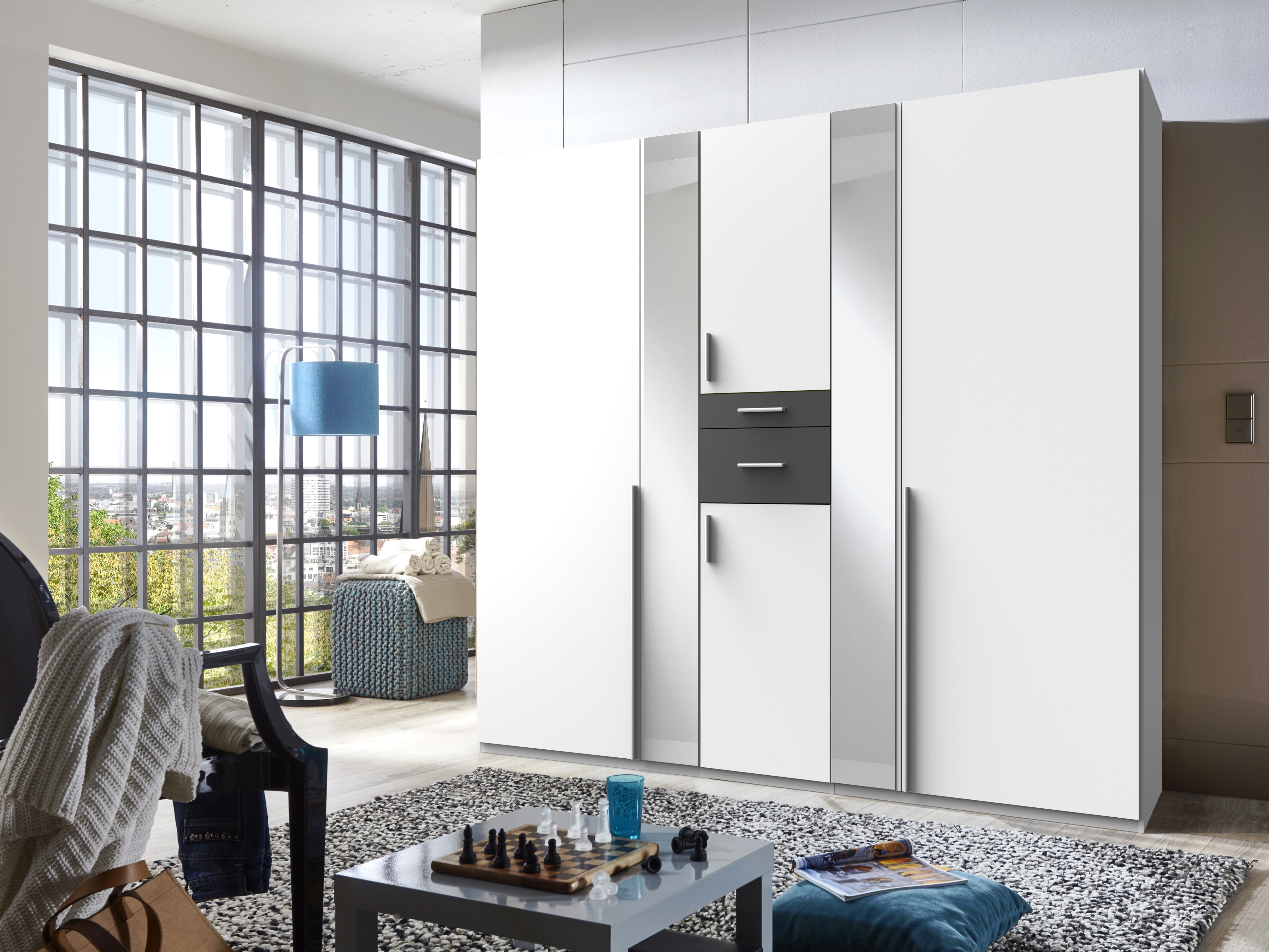 Front: Weiß mit Schubkästen in Graphit / Spiegel