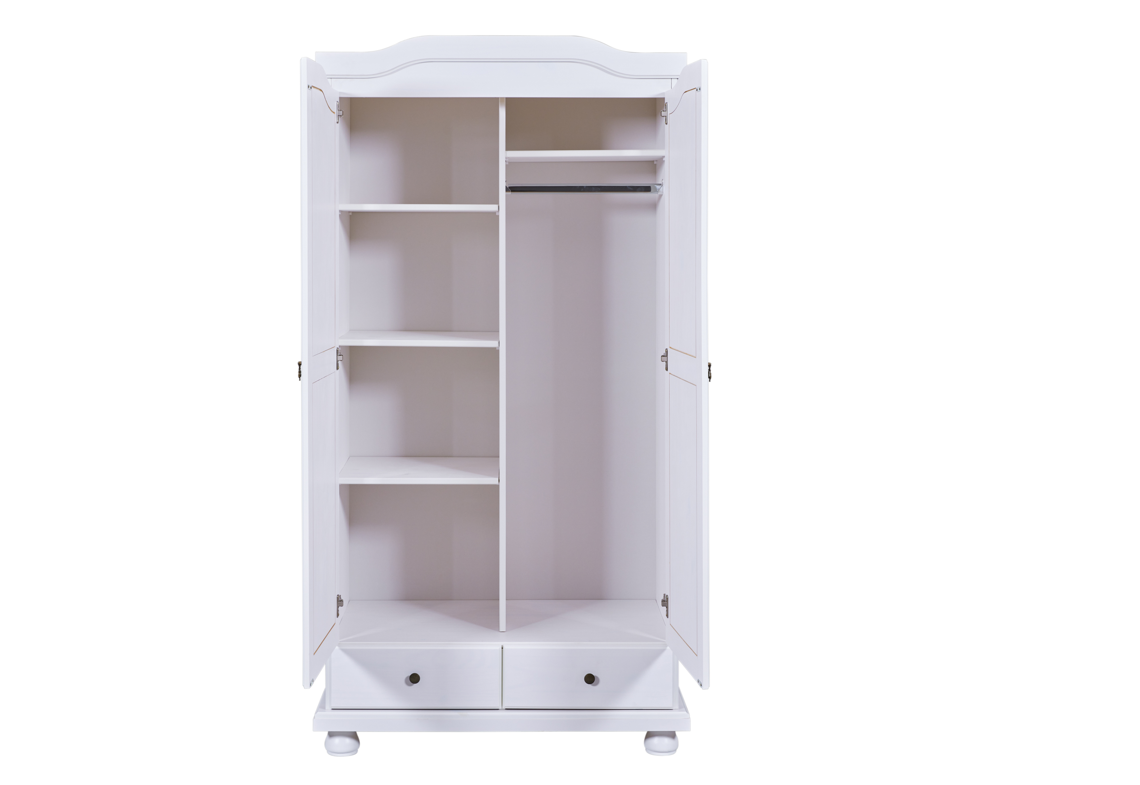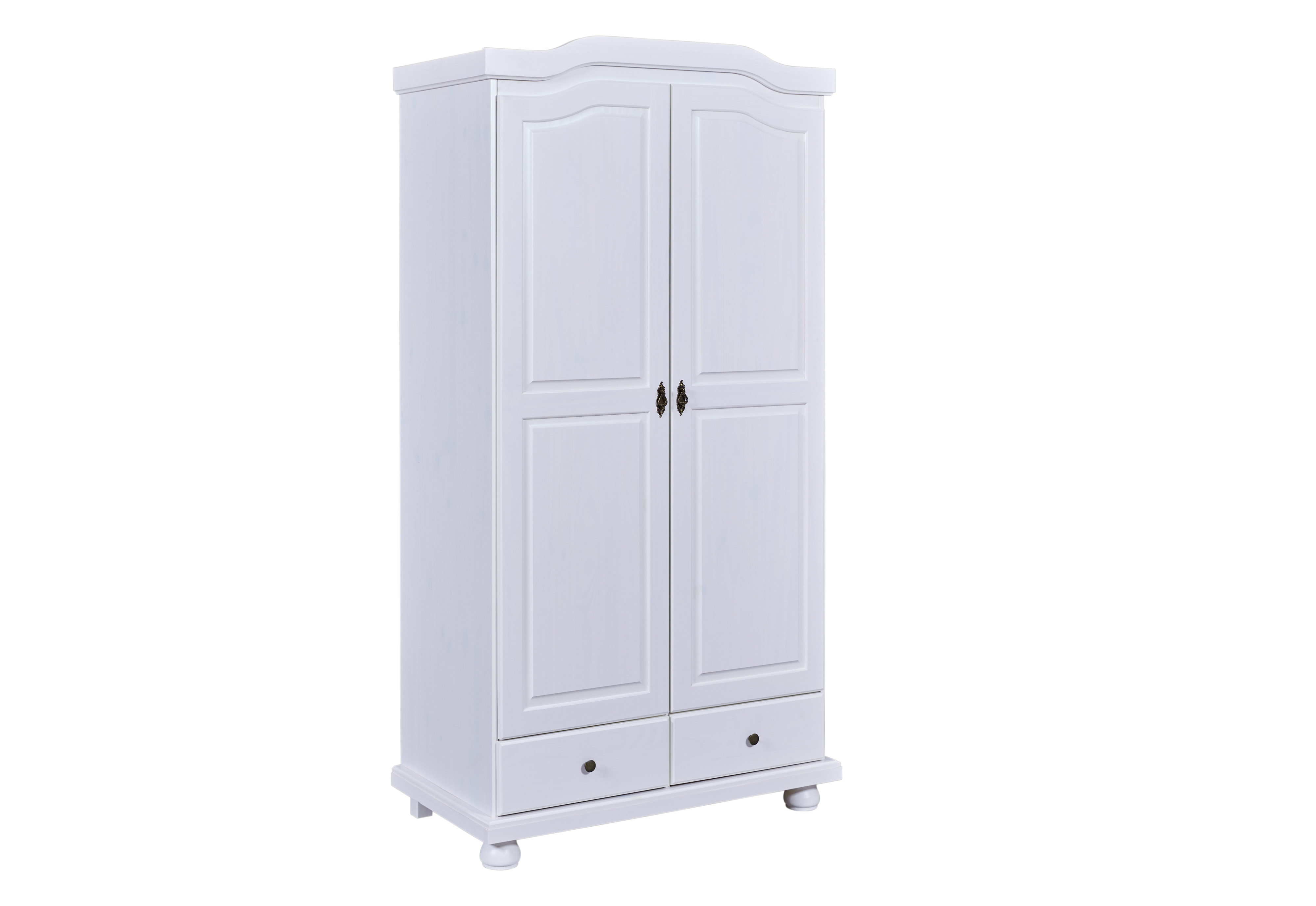 Die weiße, transparente Lackierung des 2-türigen Schranks lässt die natürlichen Massivholzmaserungen in der Oberfläche wunderbar zur Geltung kommen. Der Kleiderschrank verfügt über 5 Fachböden und eine Kleiderstange, die ausreichend Platz für Ihre Kleidungsstücke bieten.