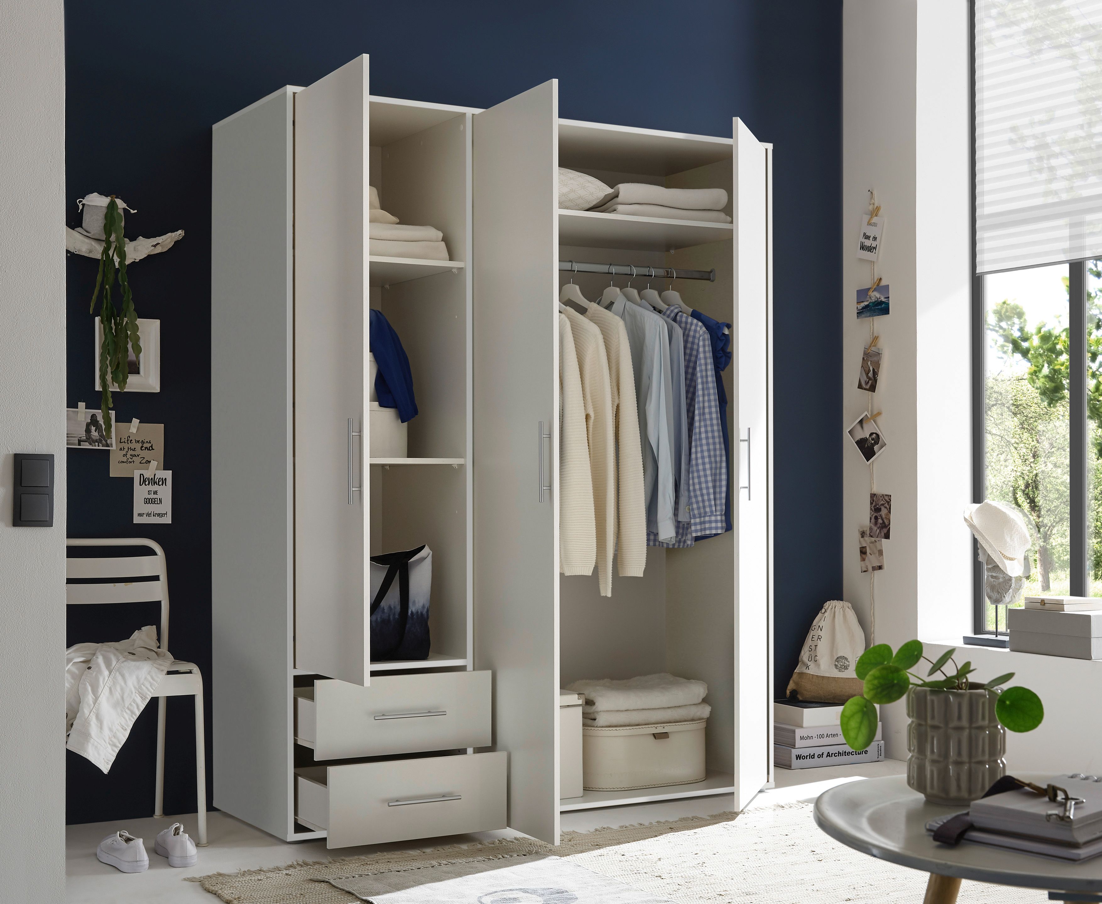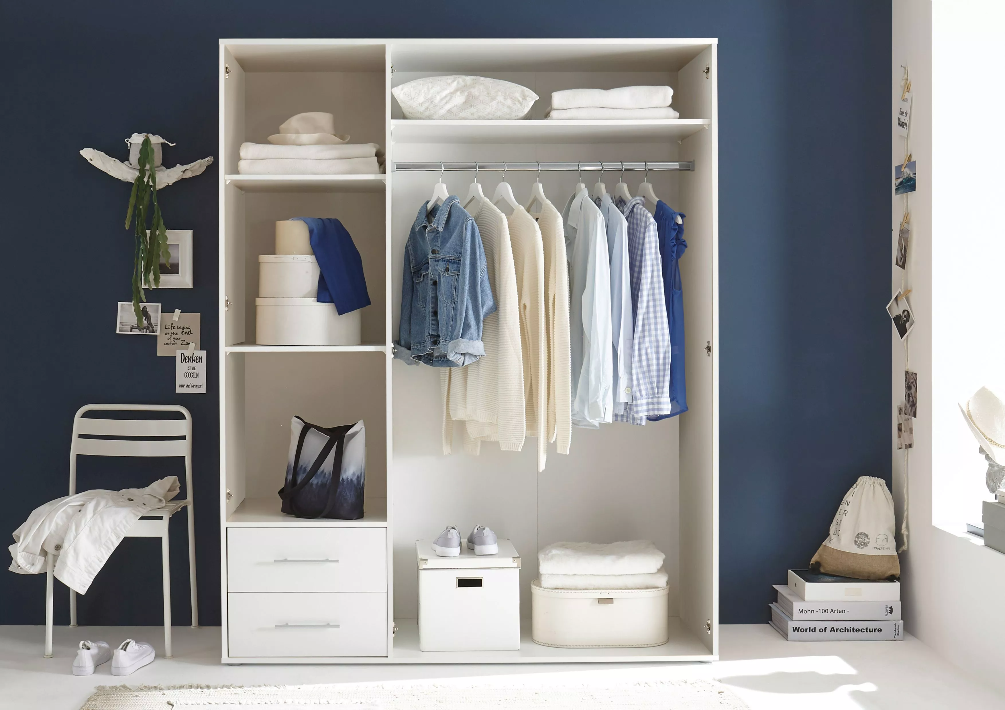 Inneneinteilung: 1 Mittelseite, links 2 Böden, rechts 1 Boden und 1 Kleiderstange