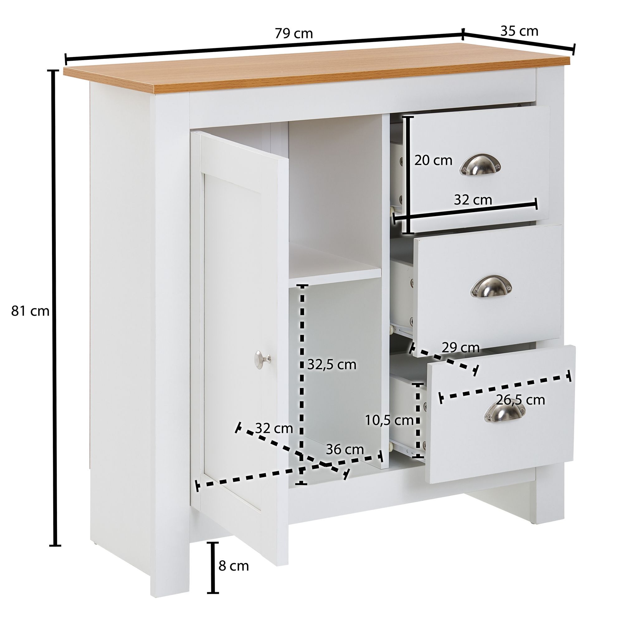 ABMESSUNGEN ✔ Breite: 79 cm // Höhe: 81 cm // Tiefe: 35 cm // Innenabmessungen je Schublade (BxHxT): 26,5 x 10,5 x 29 cm // Innenabmessungen je Türfach (BxHxT): 36 x 32,5 x 32 cm // Materialstärke: 1,5 cm // Weitere Abmessungen finden Sie im Maßbild.