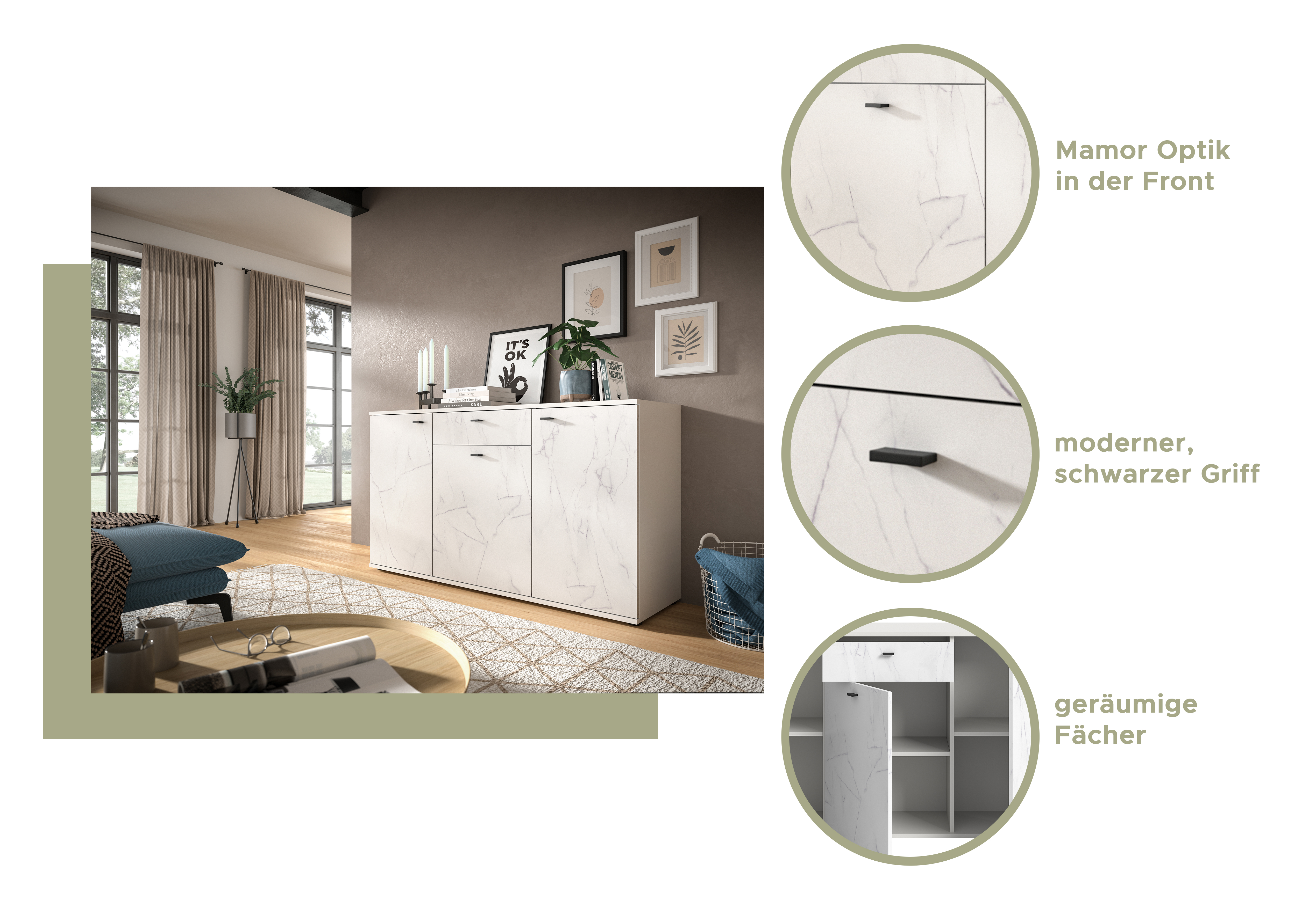 - Design/Stil: Moderne Kommode mit einer hochwertigen Mamor weiß Nachbildung mit zeitlosem und elegantem Design.