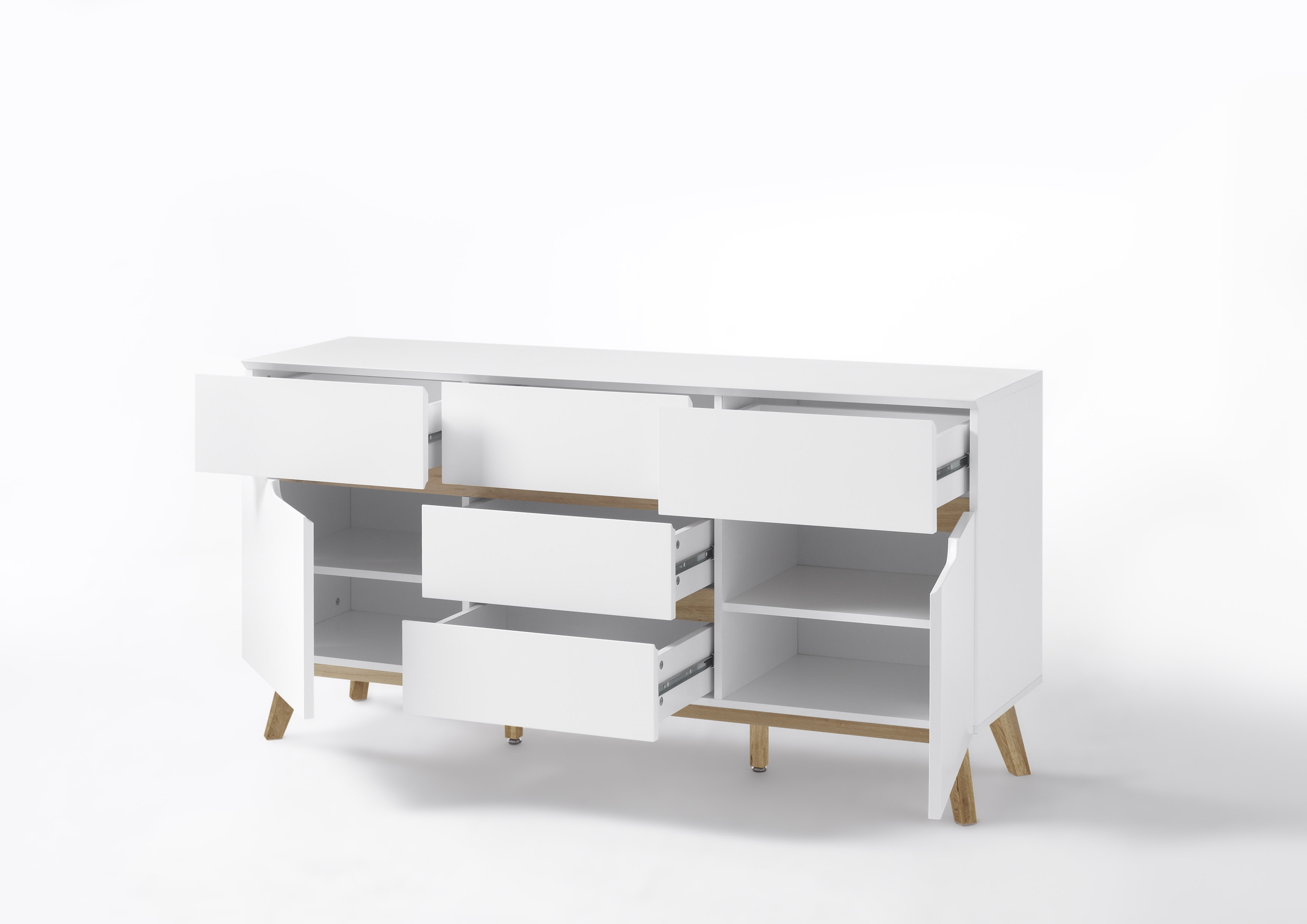 Korpus und Front: MDF (Mitteldichte Holzfaserplatte) matt weiß lackiert