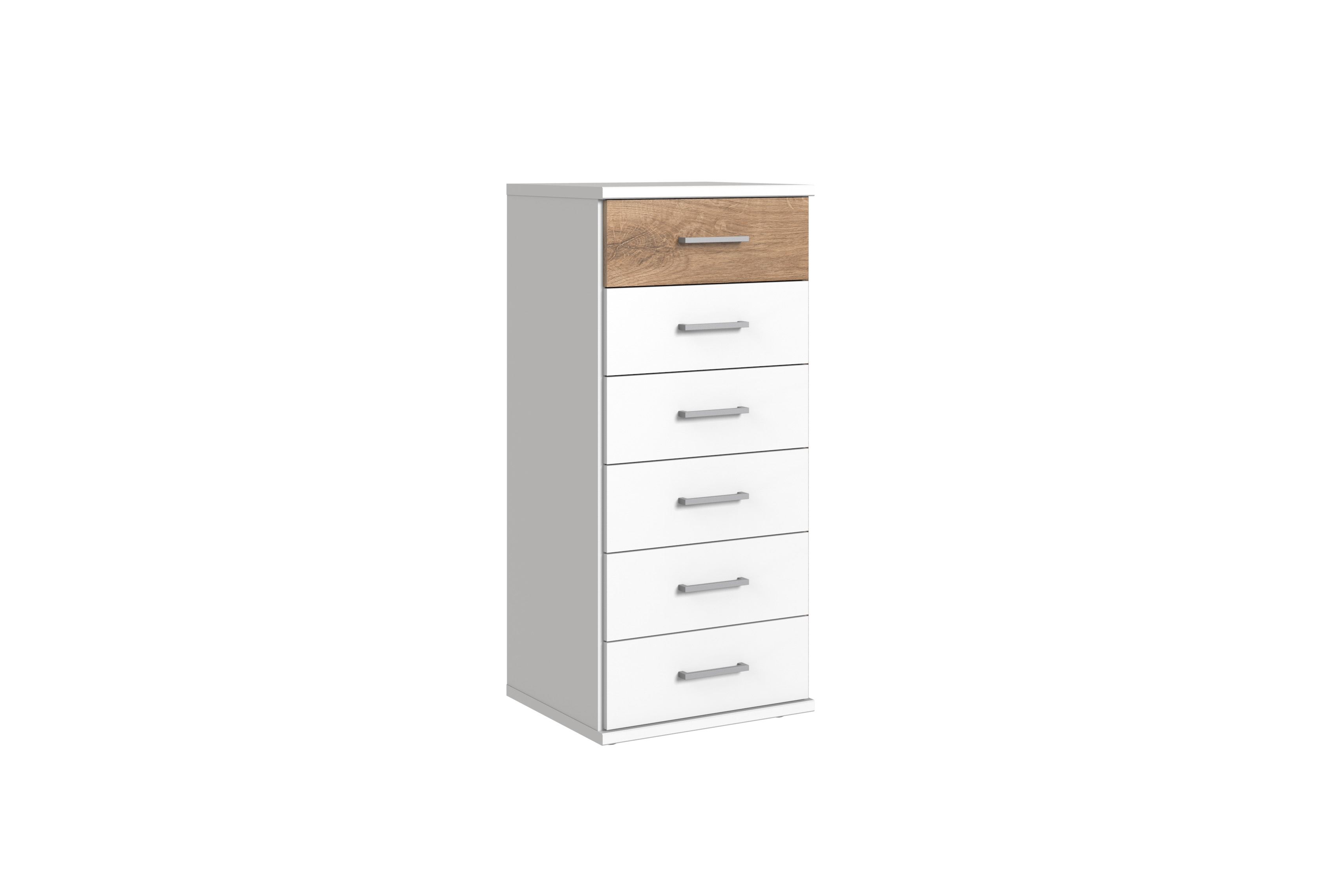Front und Korpus: Weiß mit Absetzung in Plankeneiche Holznachbildung
