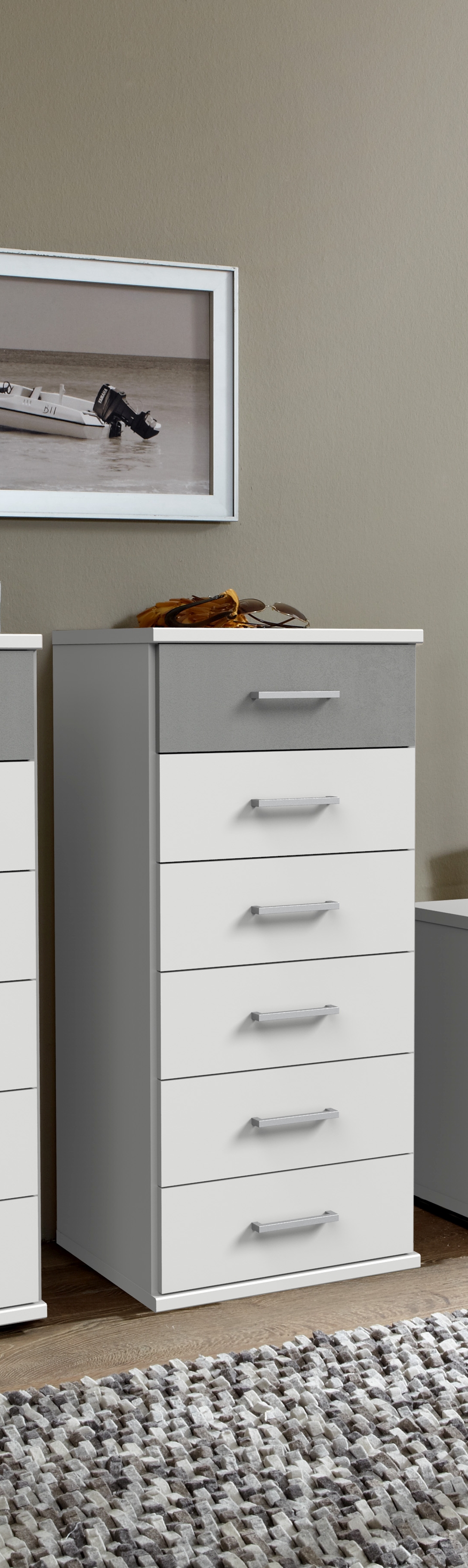 Front und Korpus: Weiß mit Absetzung in Betonoptik lichtgrau
