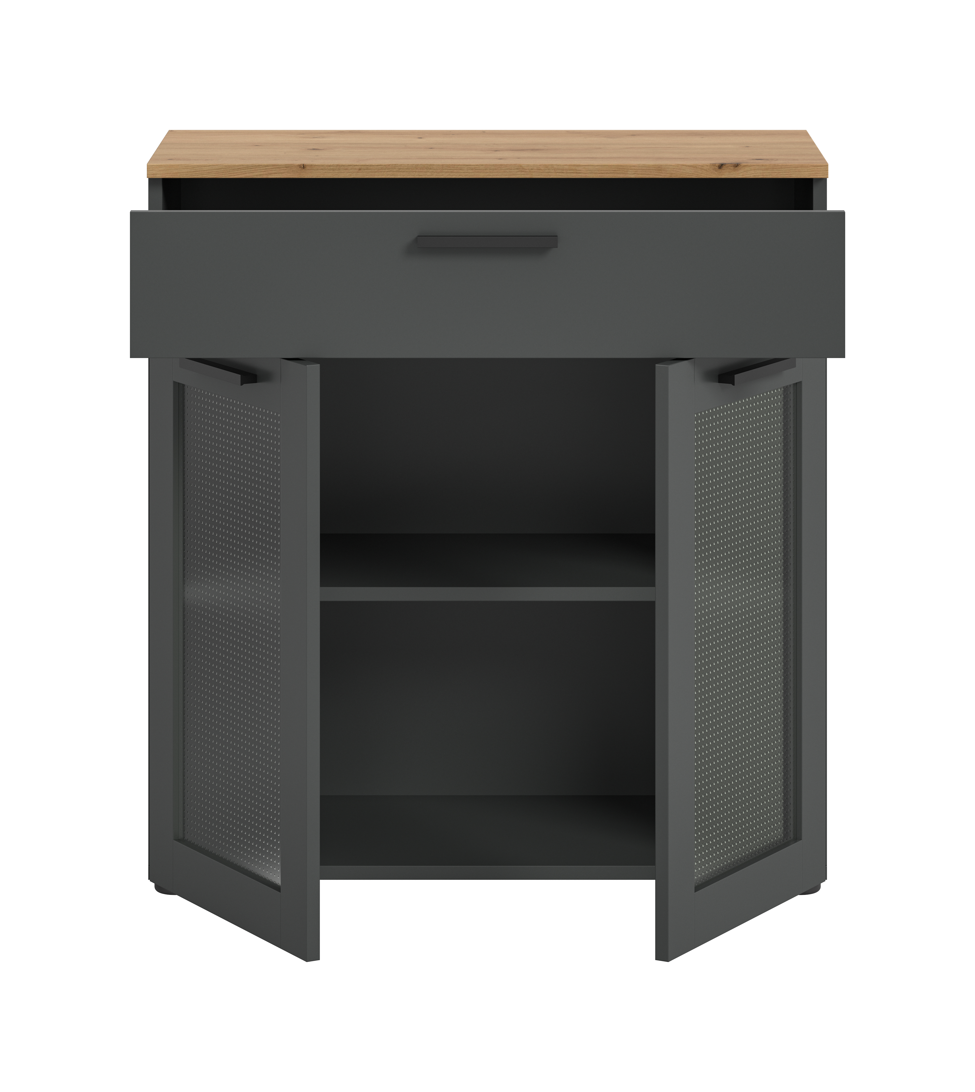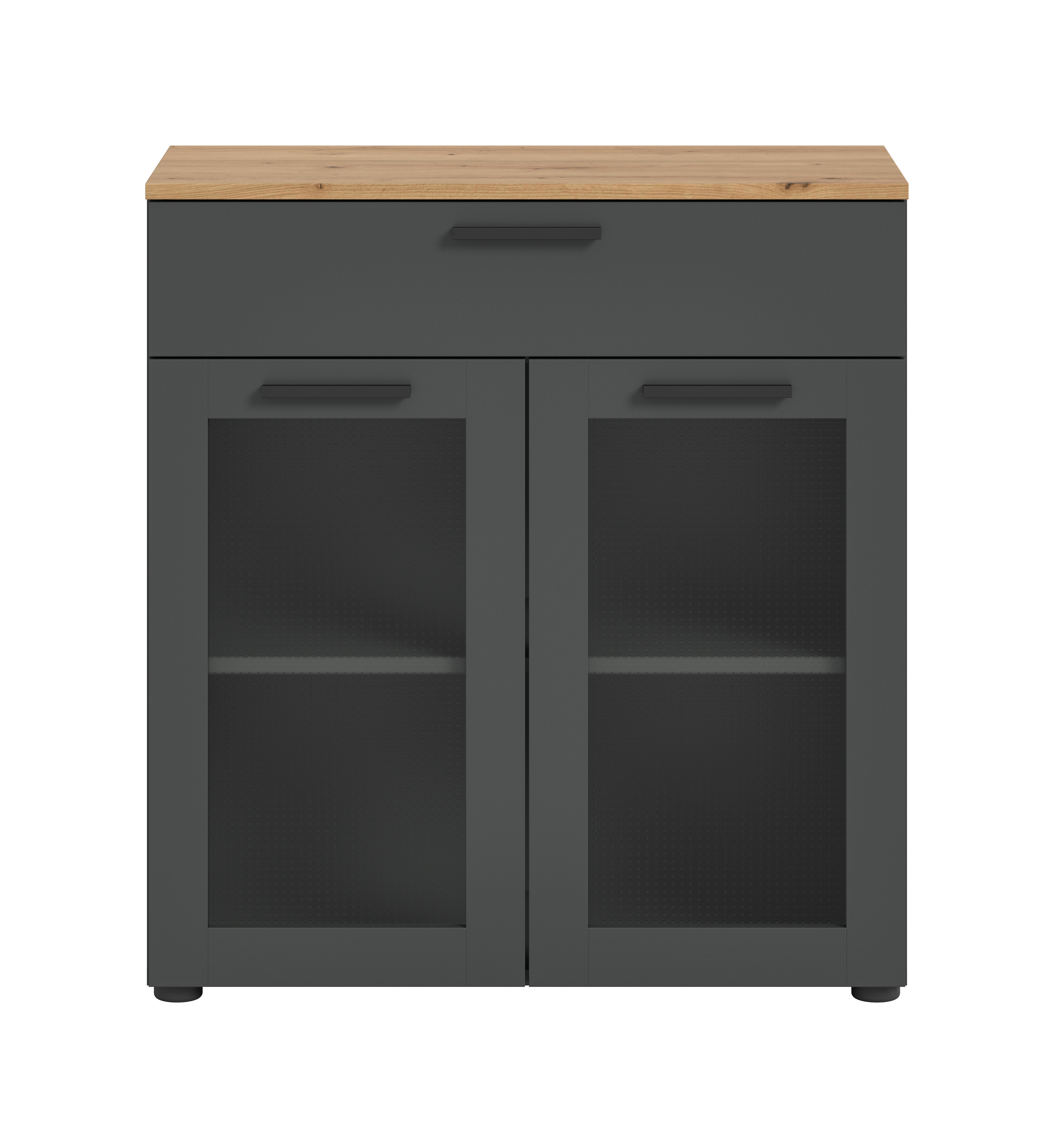 Entdecken Sie die perfekte Mischung aus Eleganz und Funktionalität mit der Kommode. Diese moderne Kommode in Basaltgrau, abgesetzt mit stilvoller Artisan Eiche und Glas und bietet reichlich Stauraum. Die beiden Schranktüren mit Glas sorgen für eine dekorative Optik, während die schlichte Schublade zusätzlichen Platz für kleinere Gegenstände bieten. Perfekt für ein minimalistisches oder zeitgenössisches Interieur.