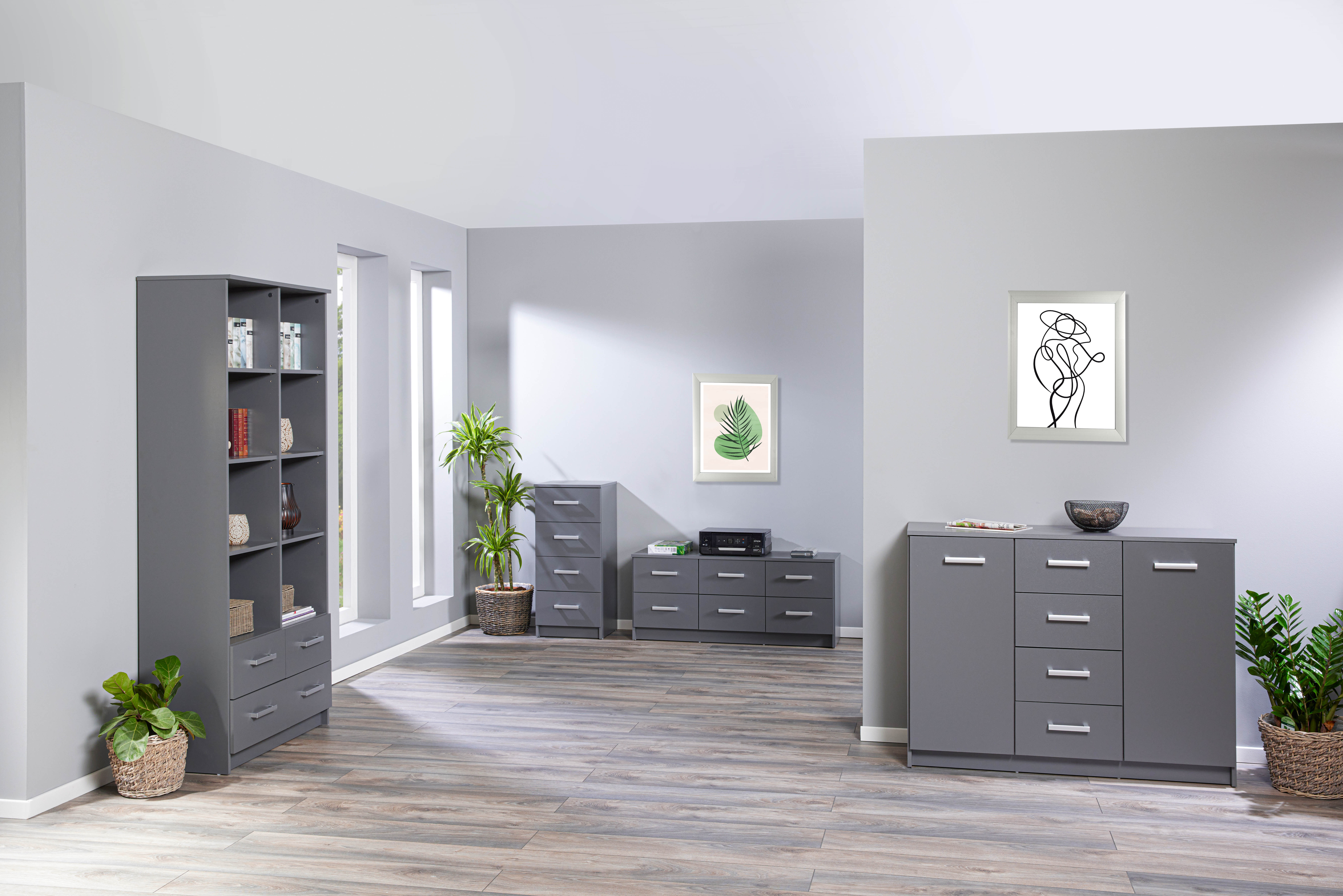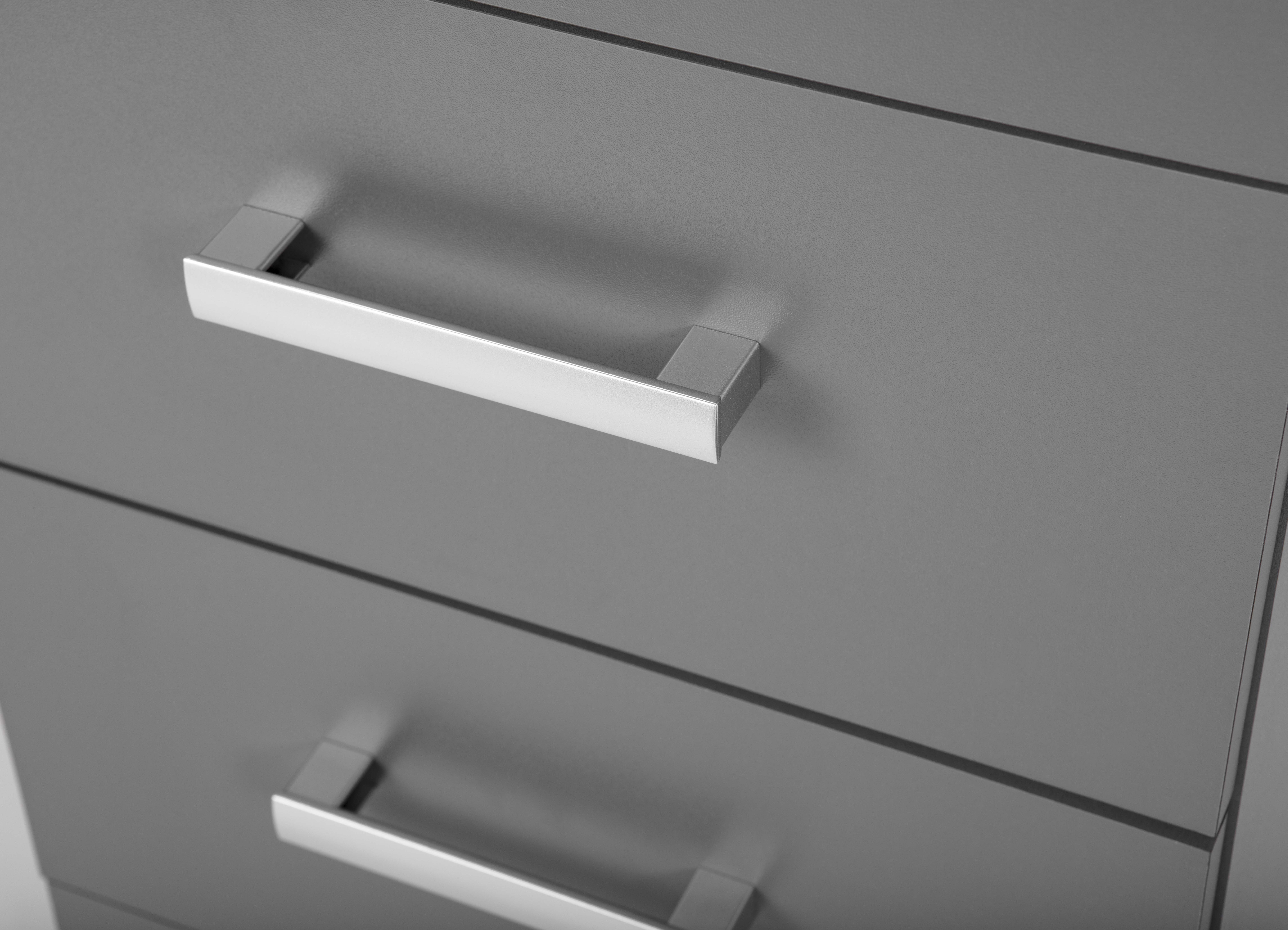 Die grau matte Oberfläche, die melaminbeschichtet ist, sorgt nicht nur für eine elegante Optik, sondern macht die Kommode auch besonders pflegeleicht.