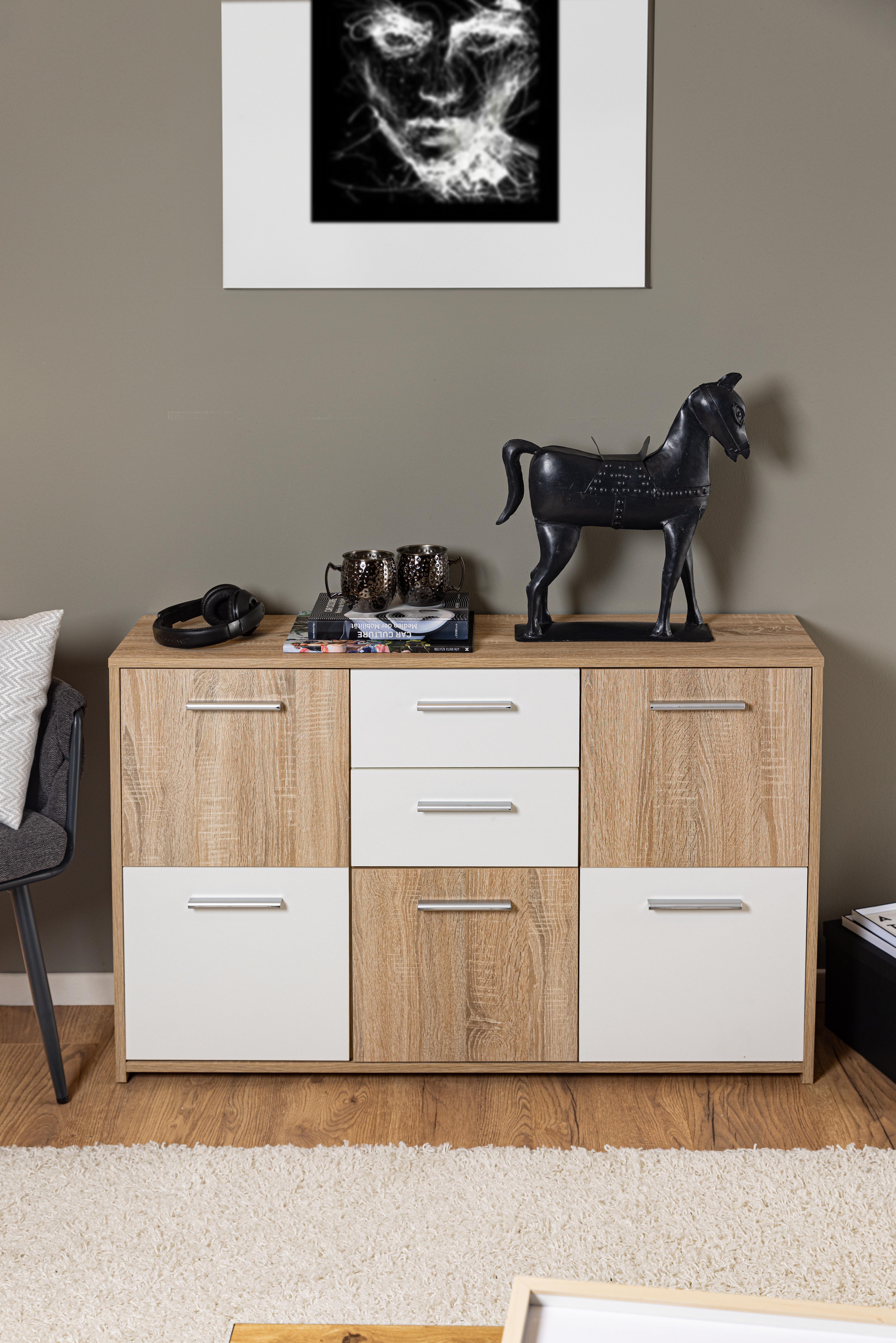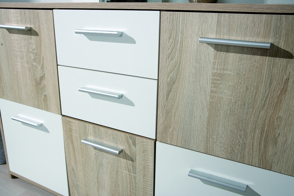 Die Oberfläche ist in den Trendfarben Sonoma-Eiche Nachbildung und Weiß kombiniert und verleiht dem Möbelstück eine moderne, zugleich warme Ausstrahlung. Dank der Melaminbeschichtung ist das Sideboard kratz- und reibungsfest und somit besonders pflegeleicht.
