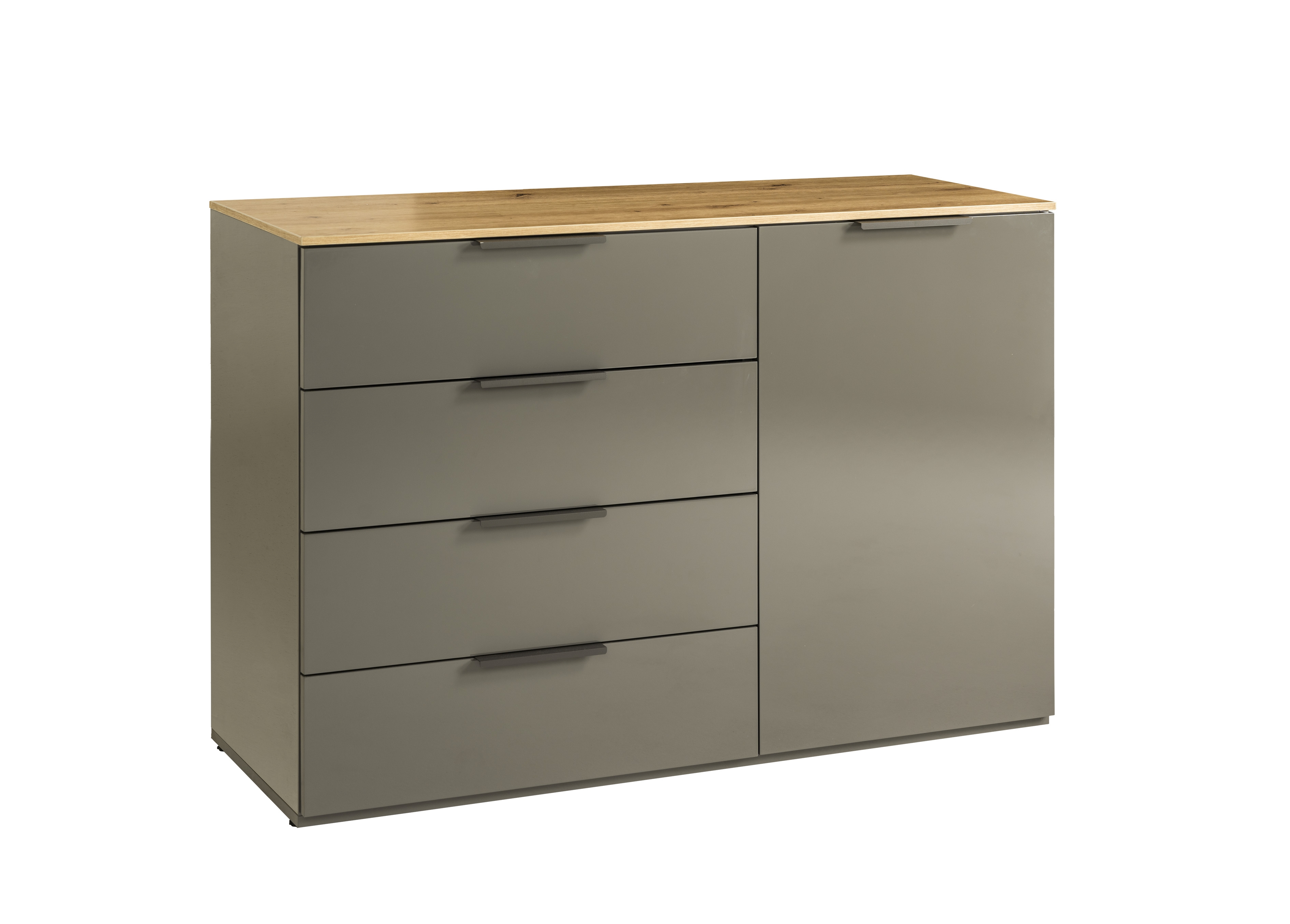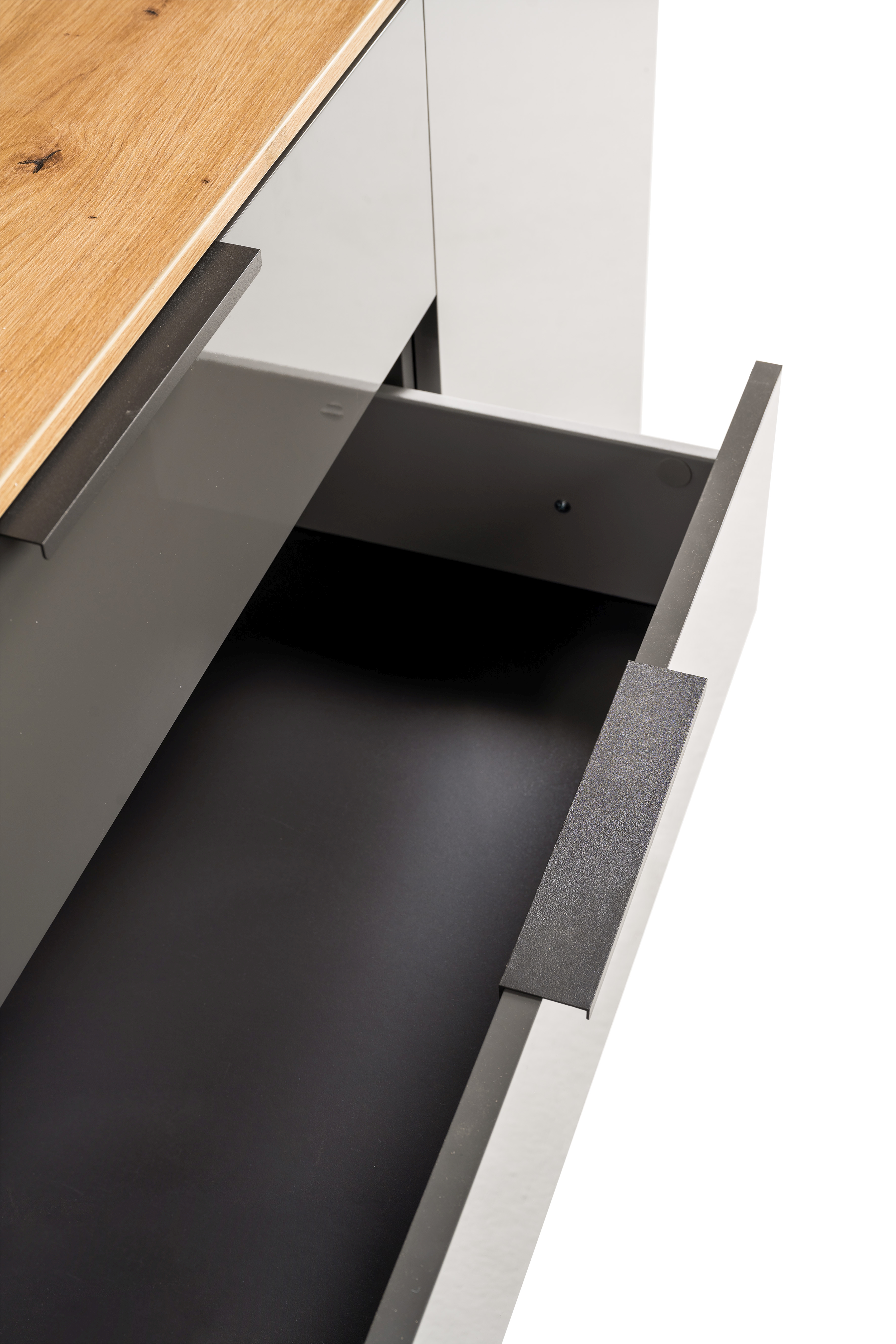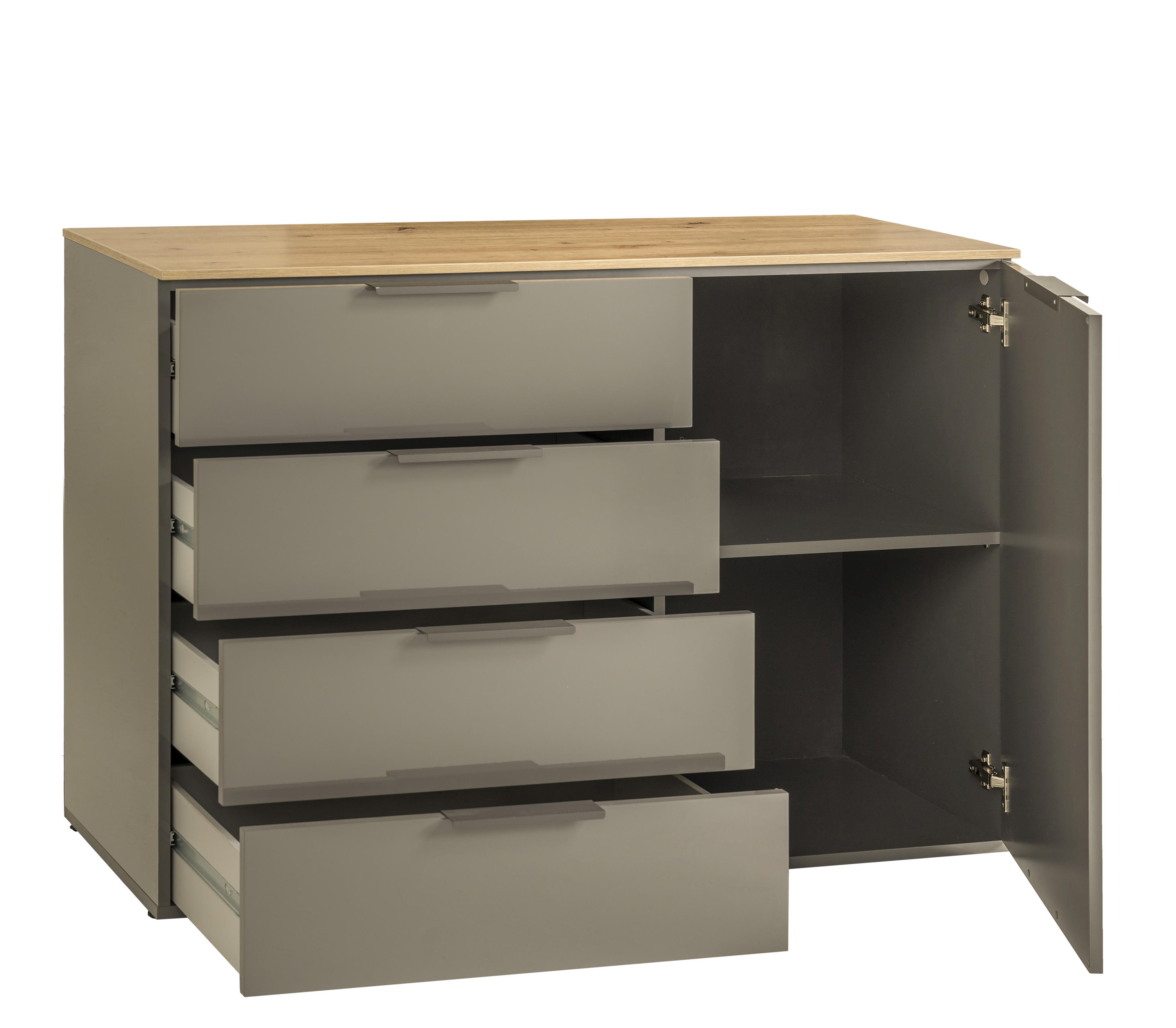 Korpus und Front: Artisan Eiche Holznachbildung kombiniert mit Hochglanz Titanium Grau
