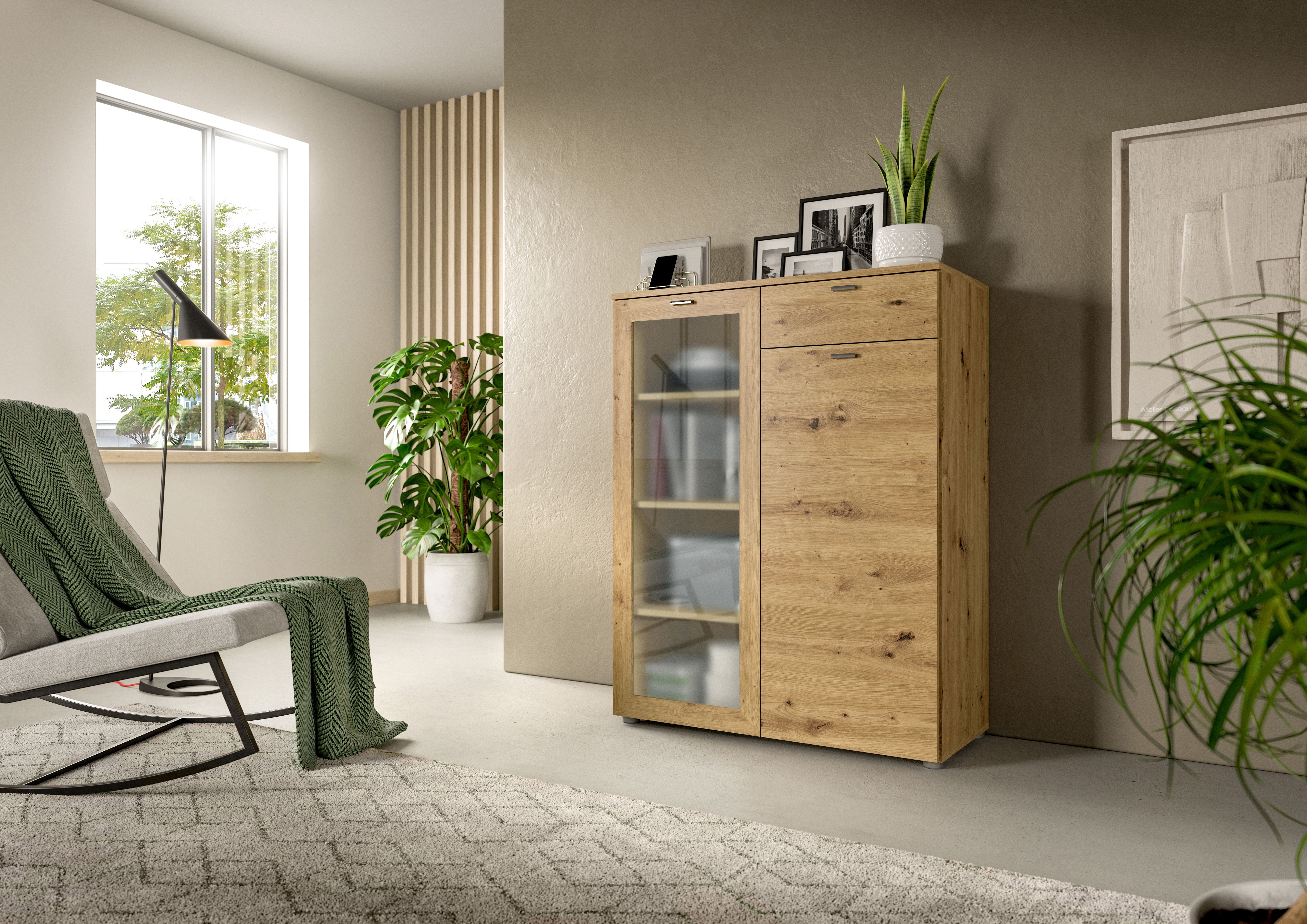 - Design/Stil: Die Kommode in Artisan Eiche Nachbildung besticht durch ein modernes und zeitloses Design mit warmen Holzfarben und natürlicher Maserung, das sich nahtlos in verschiedene Einrichtungsstile einfügt.