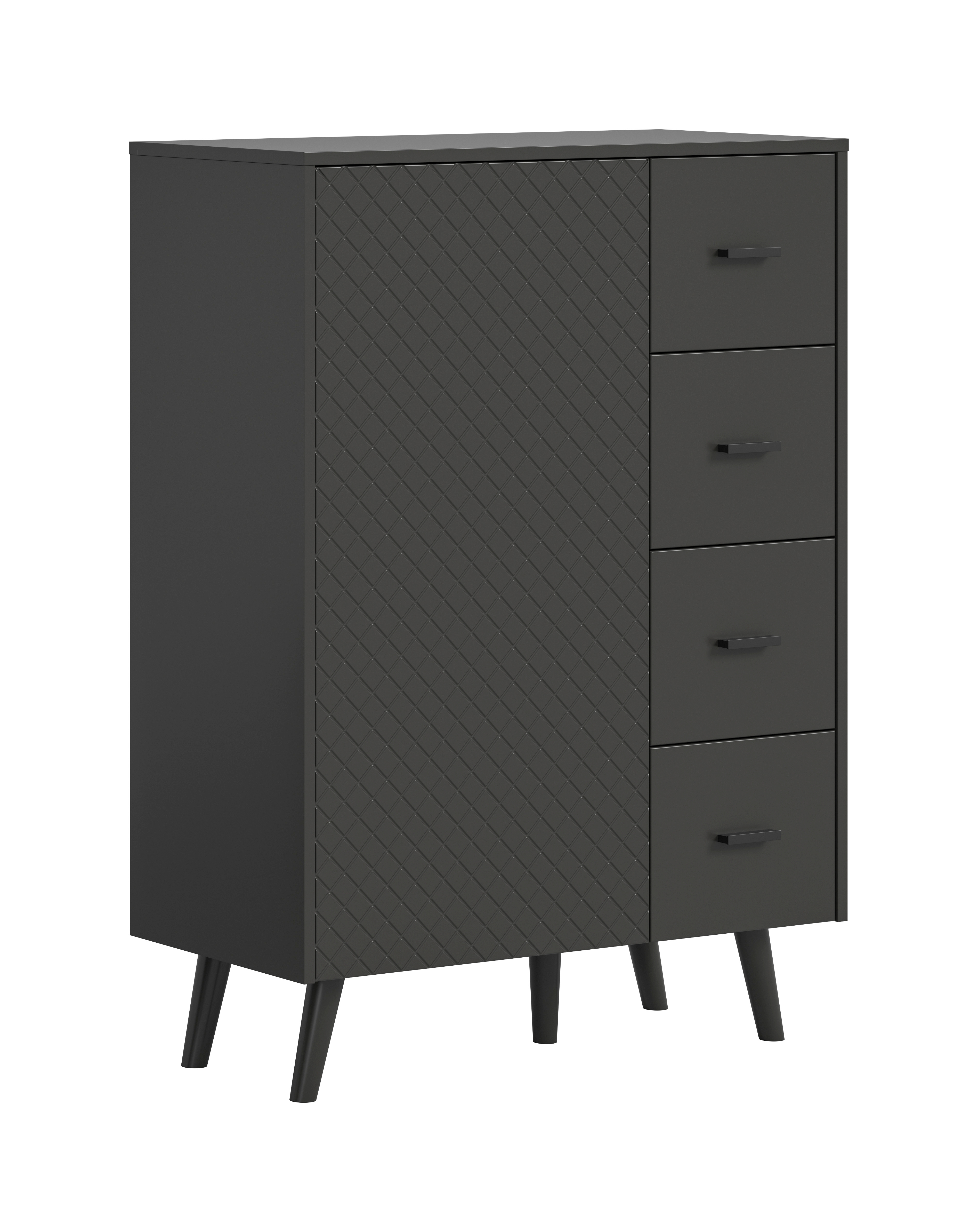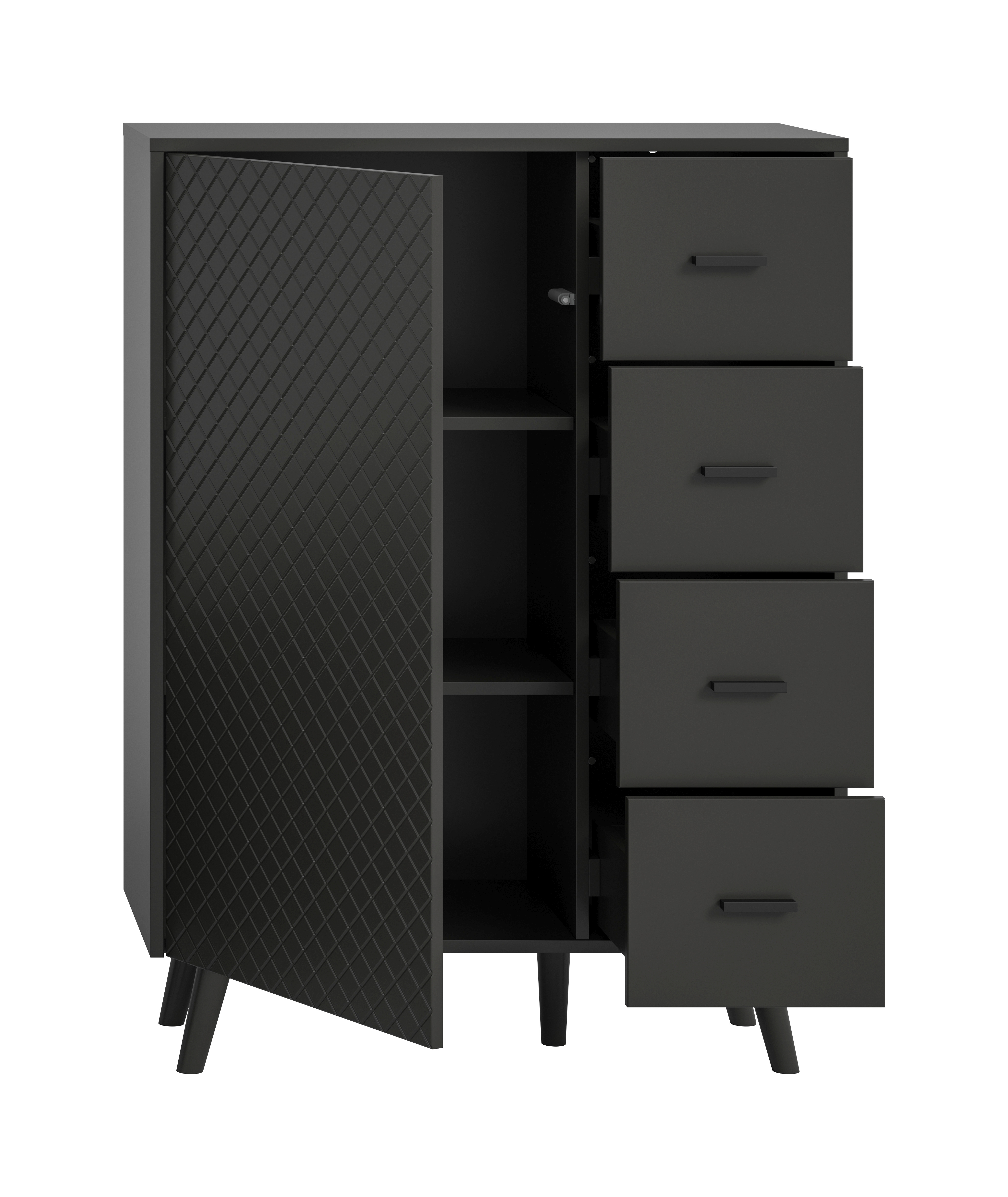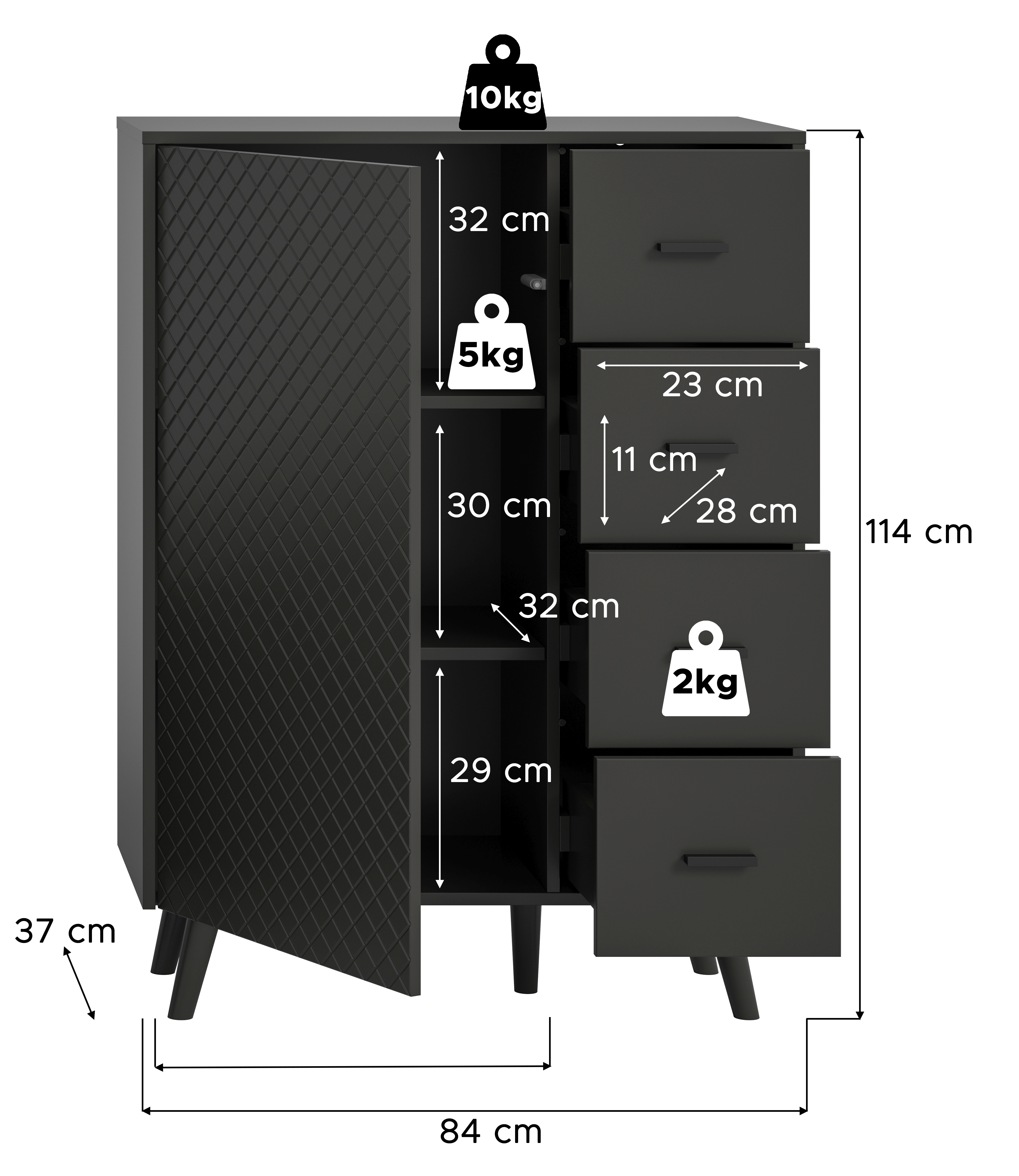 - 1 Tür, 4 Schubkästen, 2 herausnehm- & höhenverstellbare Einlegeböden, 3 Fächer