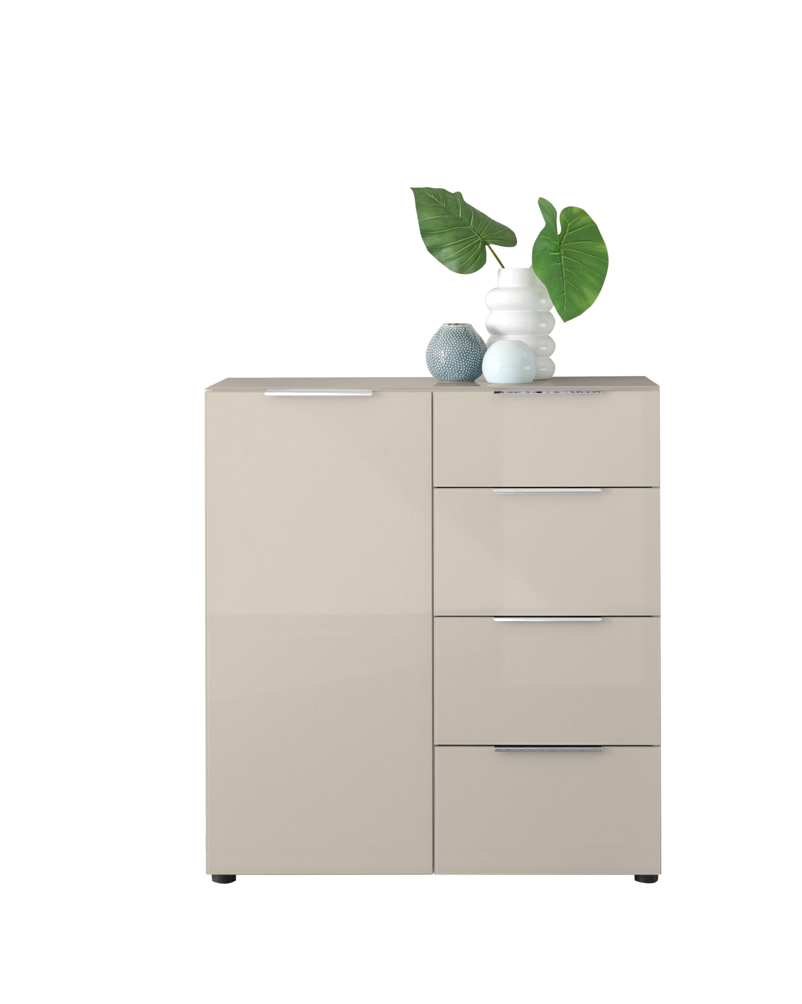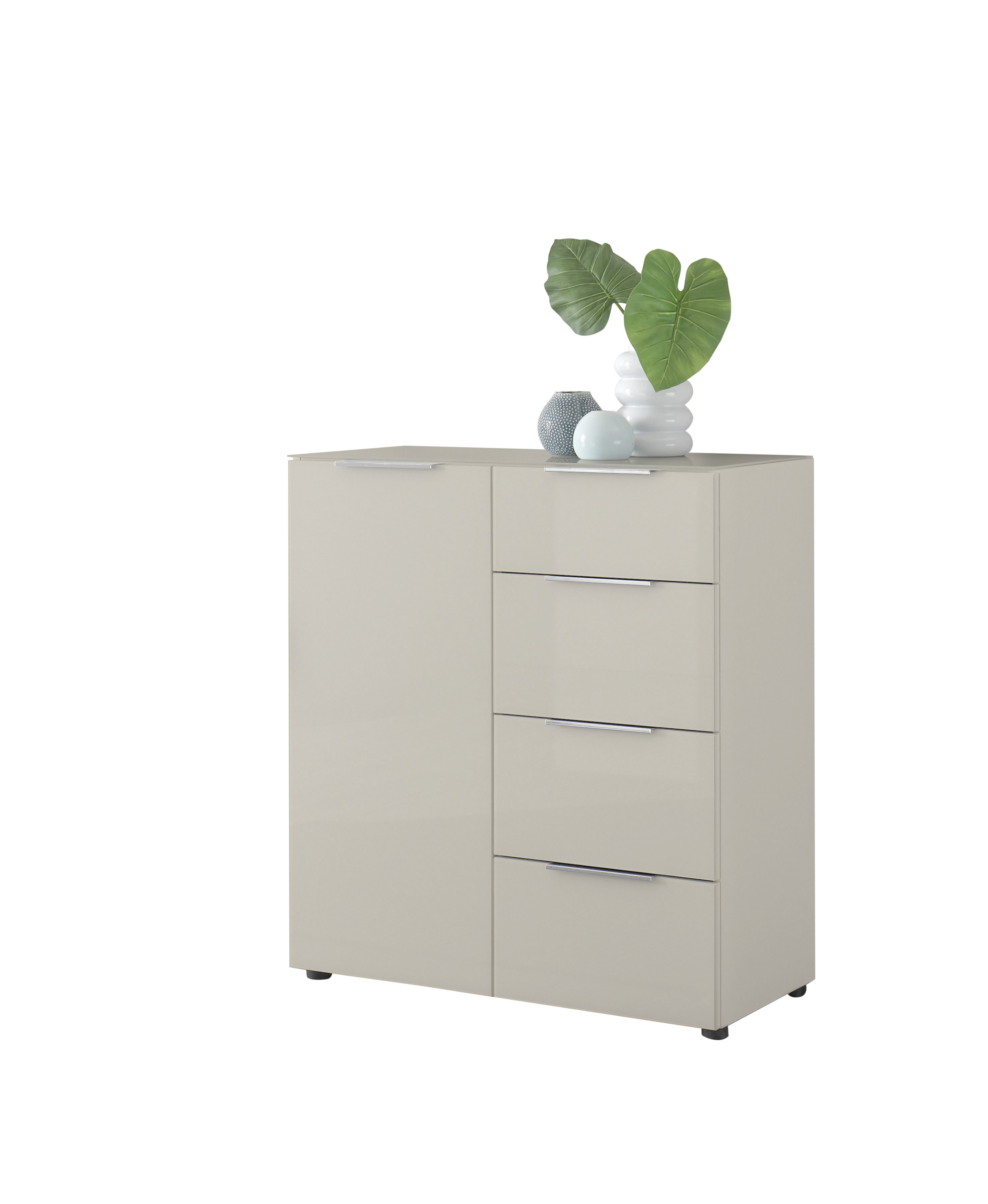 Front: Kaschmir, Spanplatte Melaminbeschichtung, Glasfronten glatt