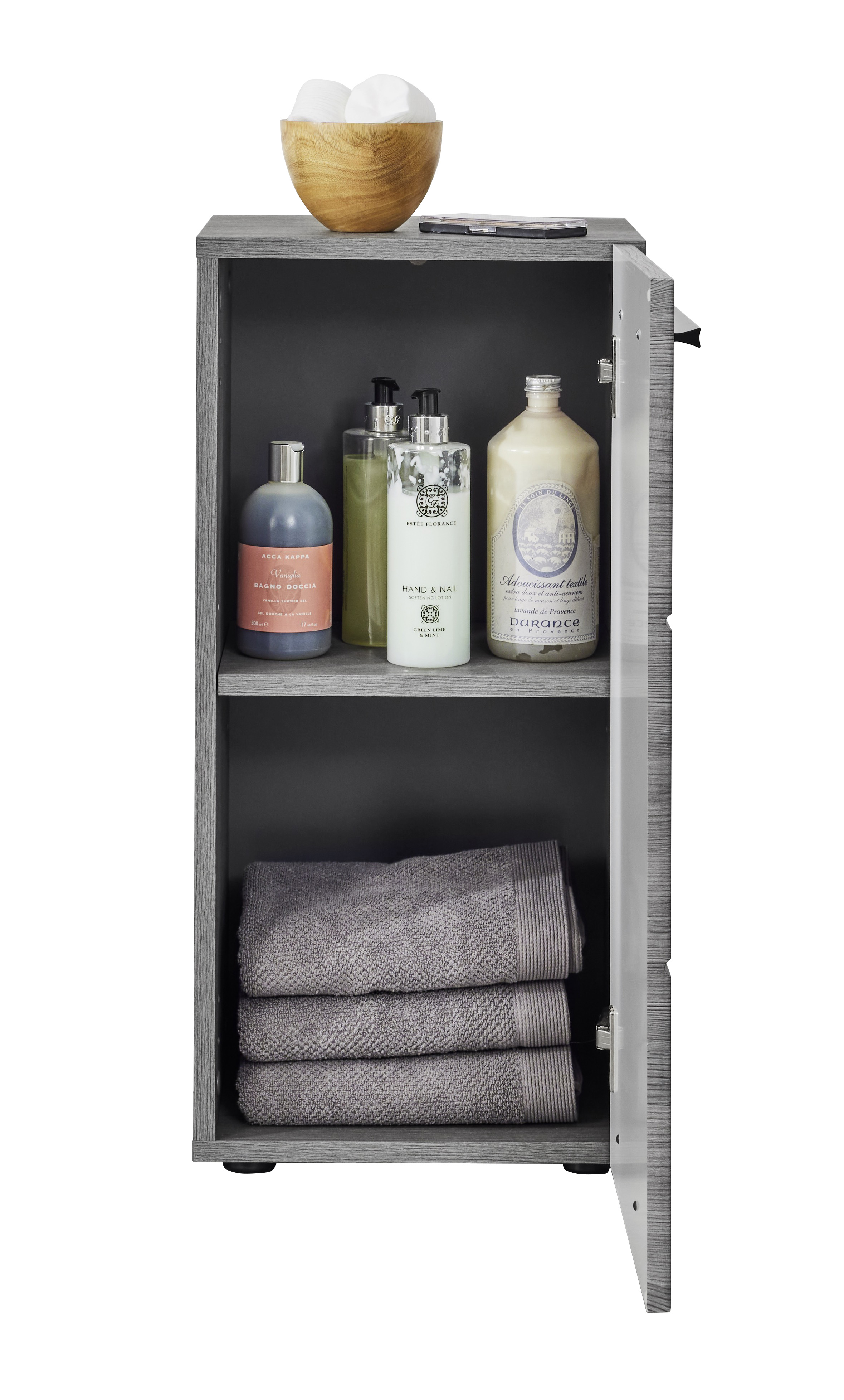 Die Tür mit Soft-Close-Funktion ermöglicht ein leises und sanftes Schließen. Im Inneren bietet ein Einlegeboden praktischen Stauraum für Badutensilien, Wohnaccessoires oder Alltagsgegenstände. Die Kommode integriert sich ideal in moderne Wohn- oder Badezimmerkonzepte.