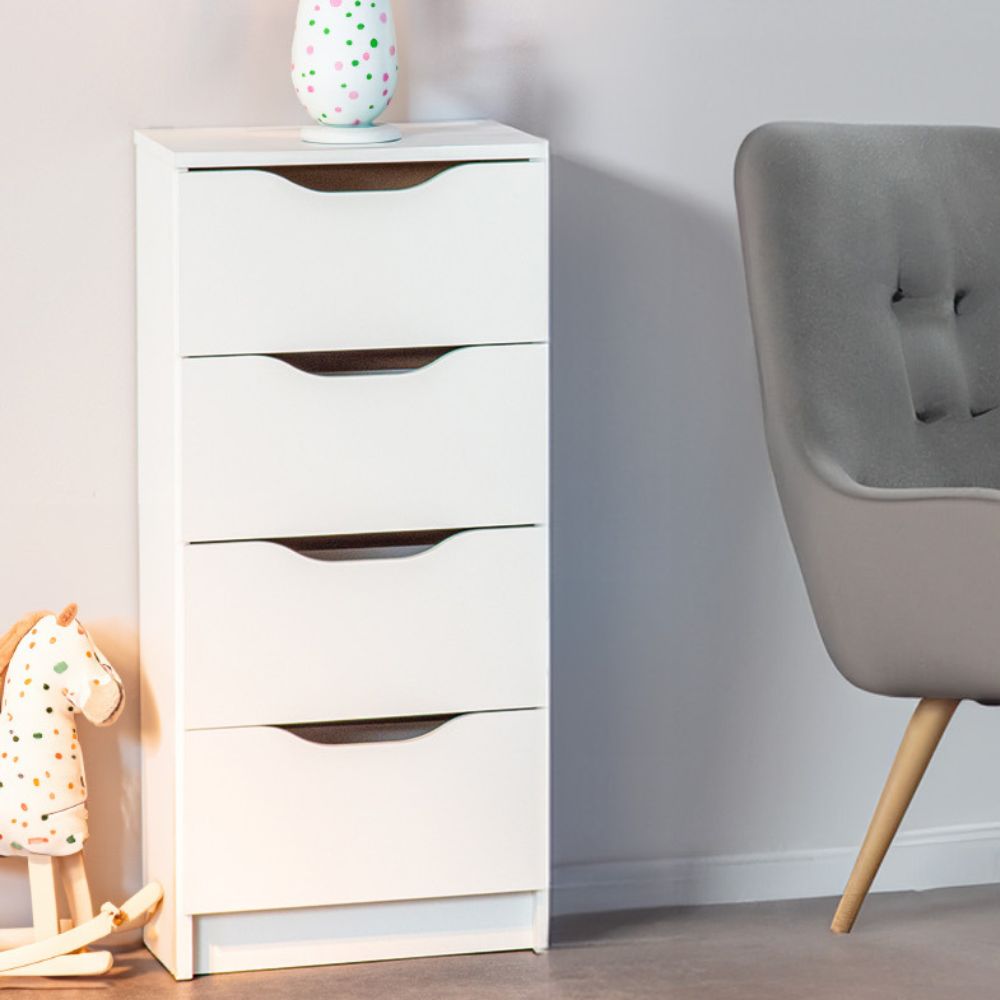Die weiße, matte Oberfläche der Kommode ist melaminbeschichtet, was sie nicht nur optisch ansprechend, sondern auch besonders kratzfest und pflegeleicht macht. Melaminbeschichtete Platten sind zudem wasser- und fettbeständig, wodurch die Kommode besonders robust und ideal für den täglichen Gebrauch im Haushalt geeignet ist.