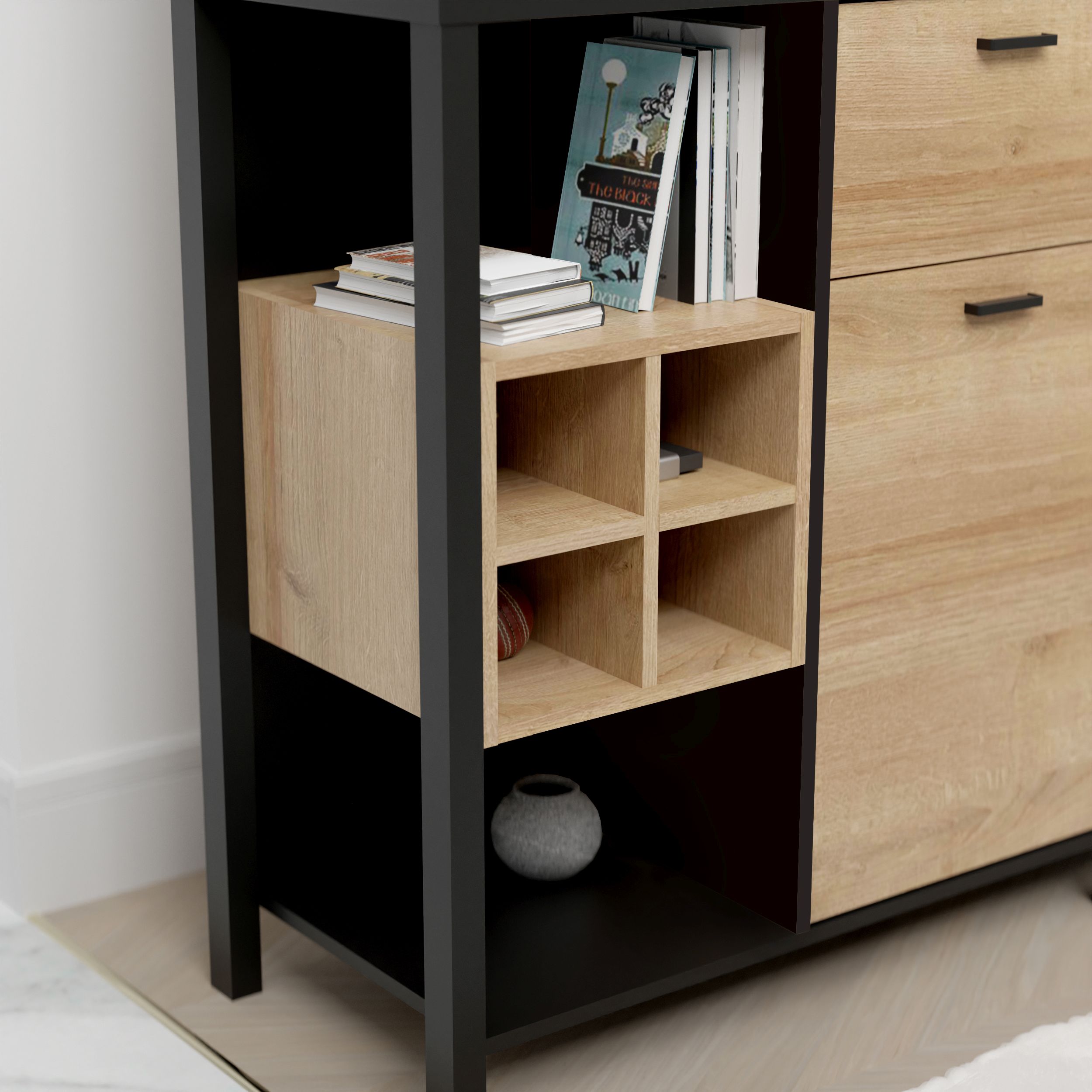 1 Element mit 2 großen und 4 kleinen offen Fächern, 1 Schubkasten und 1 Tür