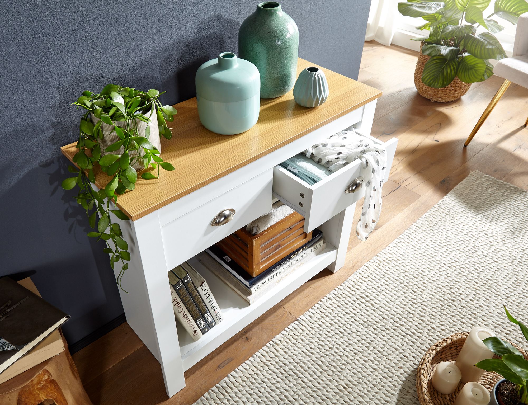 - Zwei Schubladen und ein offenes Fach sorgen für Stauraum