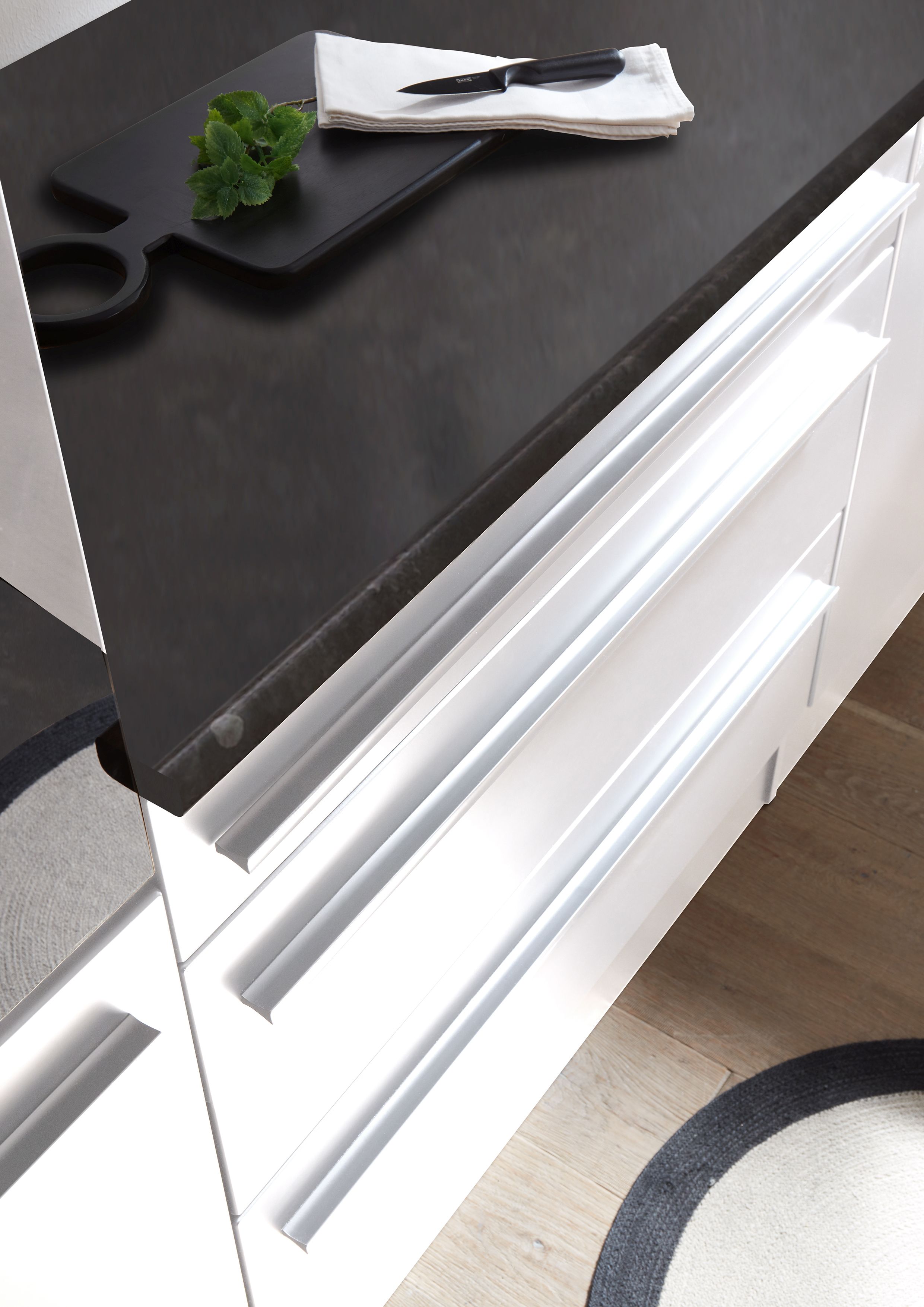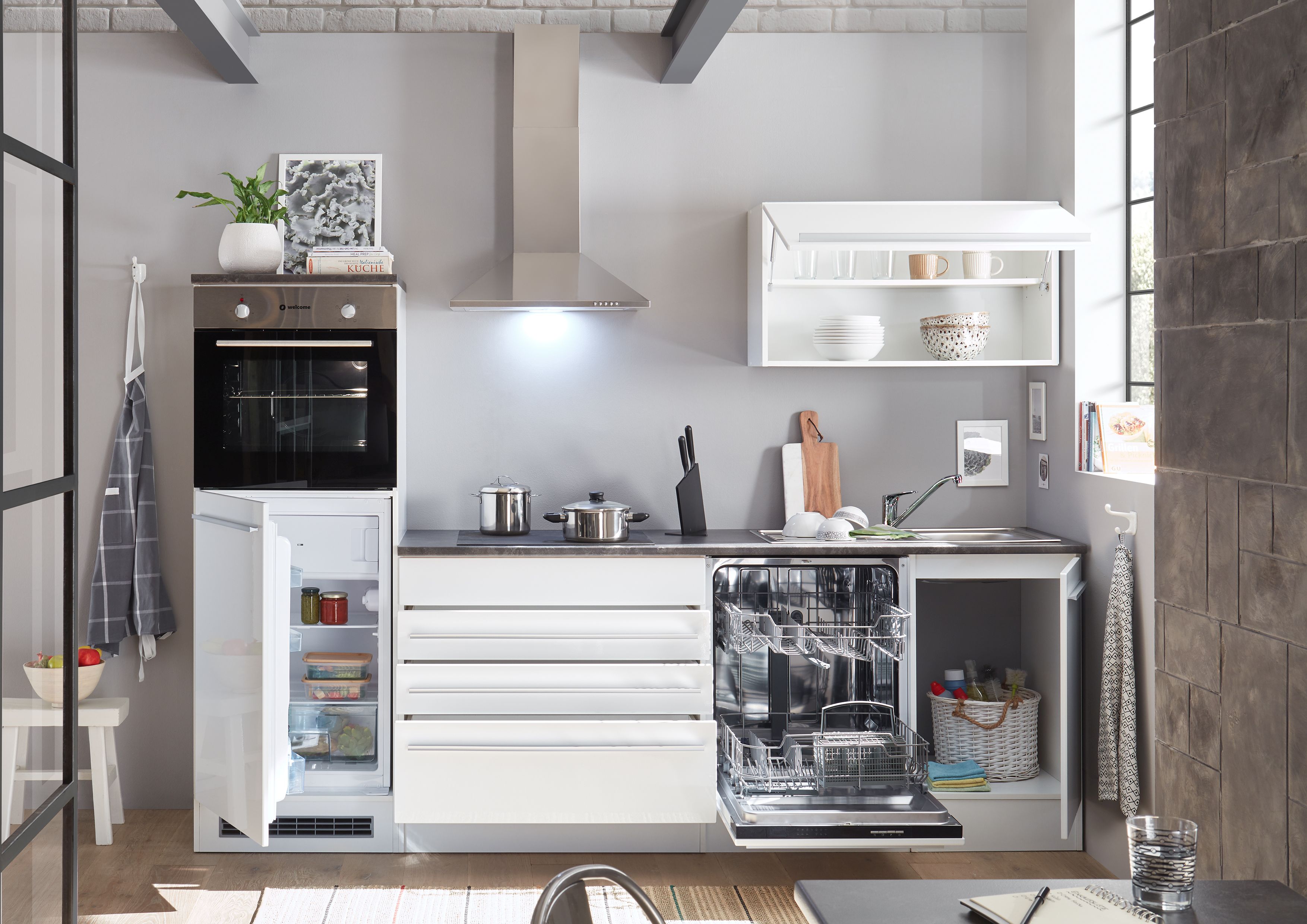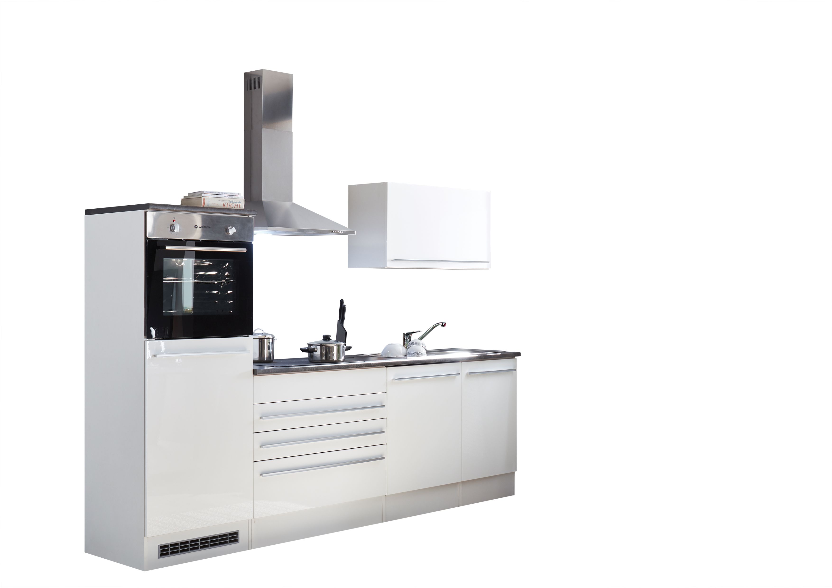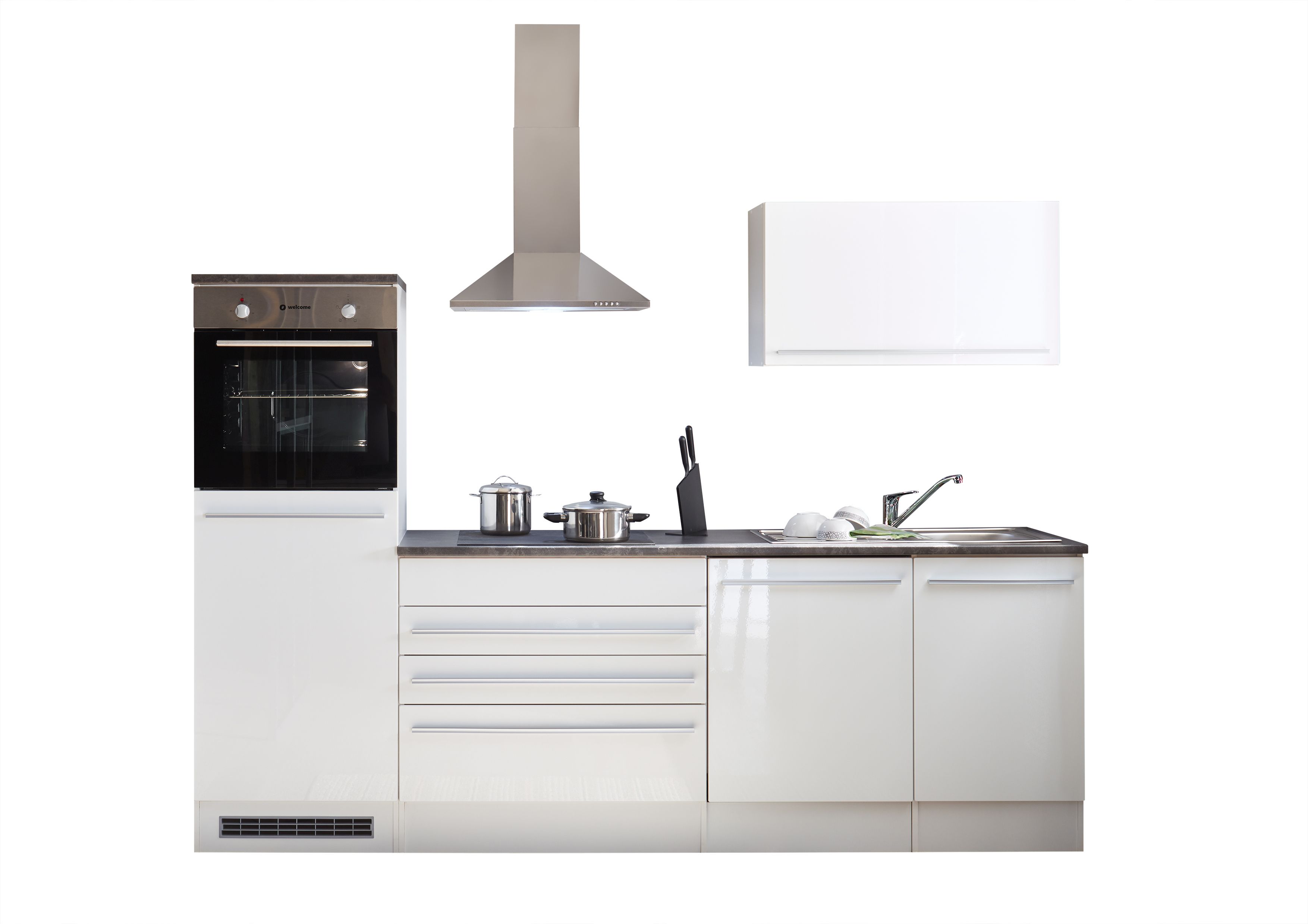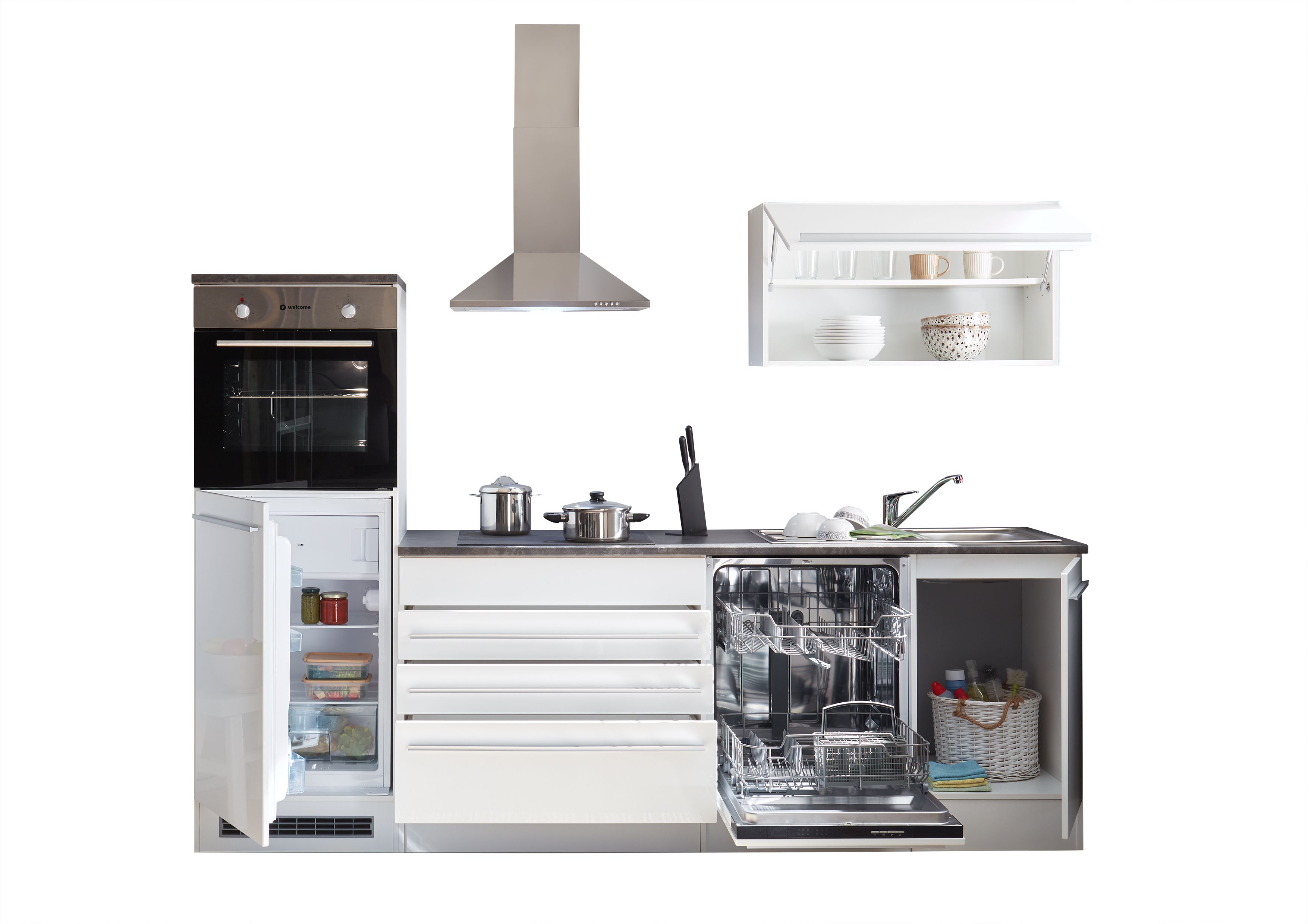 ohne Dekoration / Armatur / Waschbecken / Backofen / Kochfeld / Spülmaschine / Abzugshaube / Kühlschrank