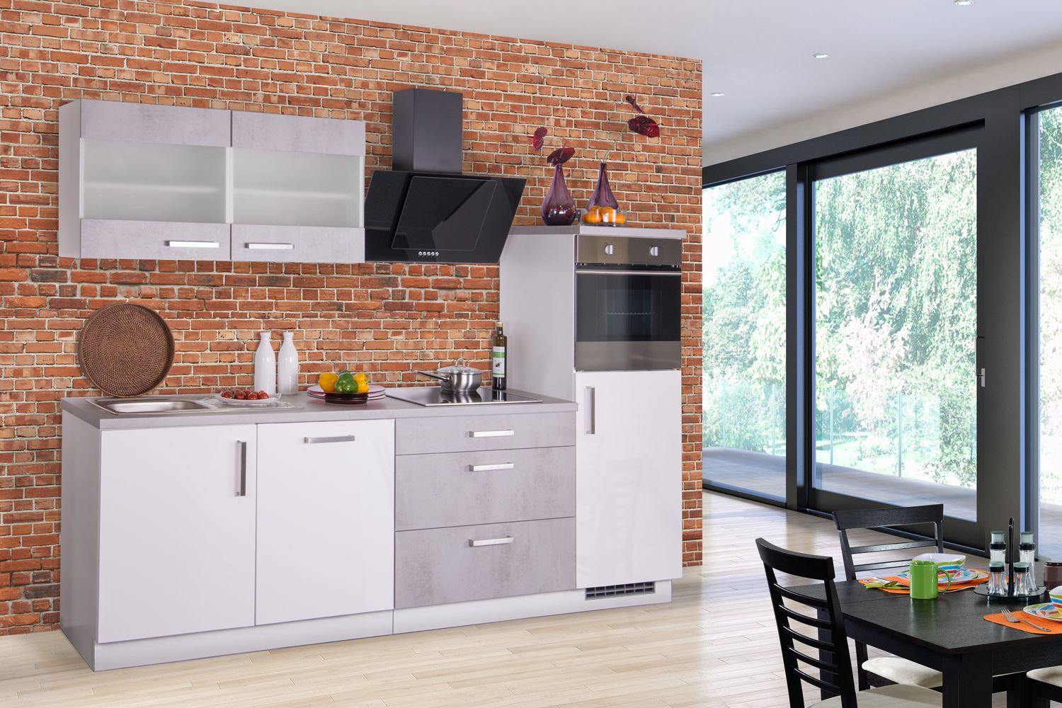 Front und Korpus: Weiß Hochglanz Lack kombiniert mit Betonoptik