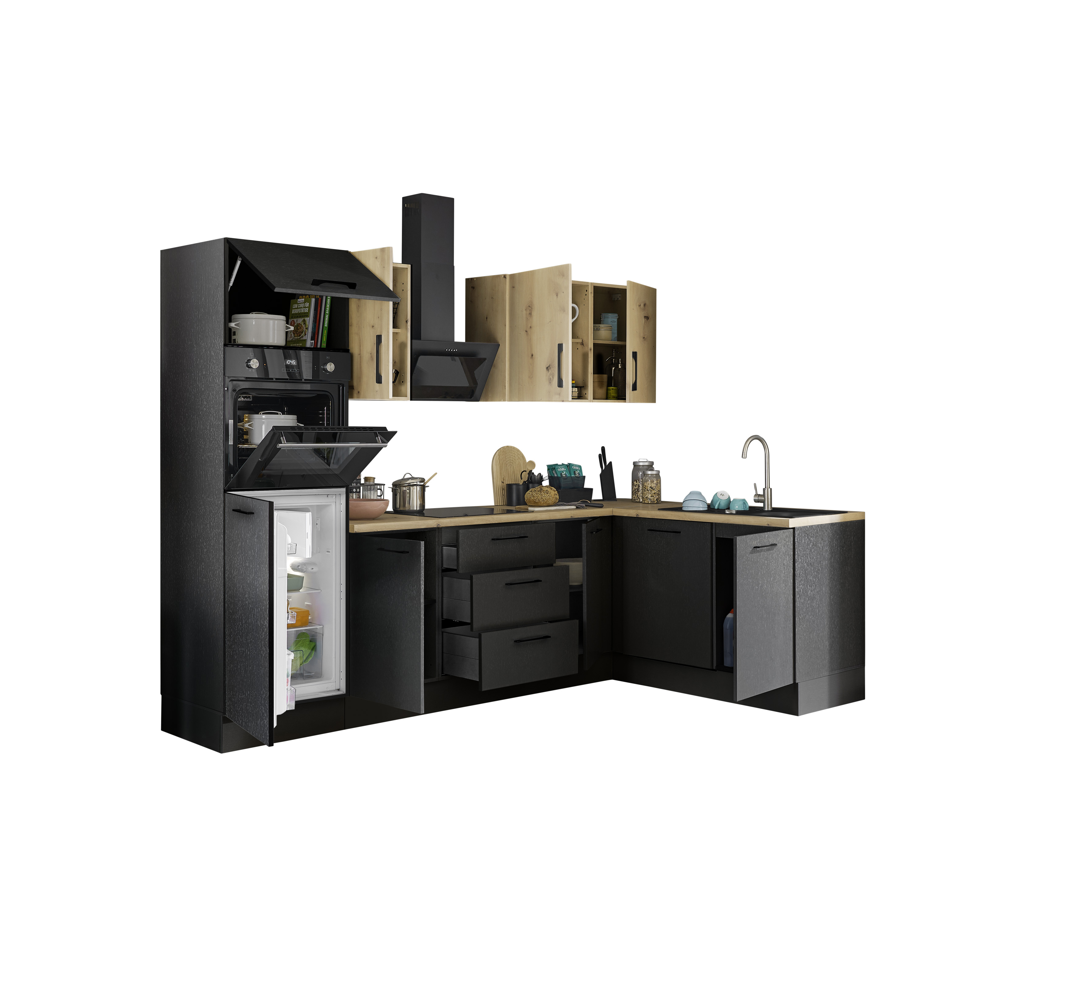 Front und Korpus: schwarz matt woodprint kombiniert mit Spanplatte Artisan Eiche Holznachbildung melaminbeschichtet