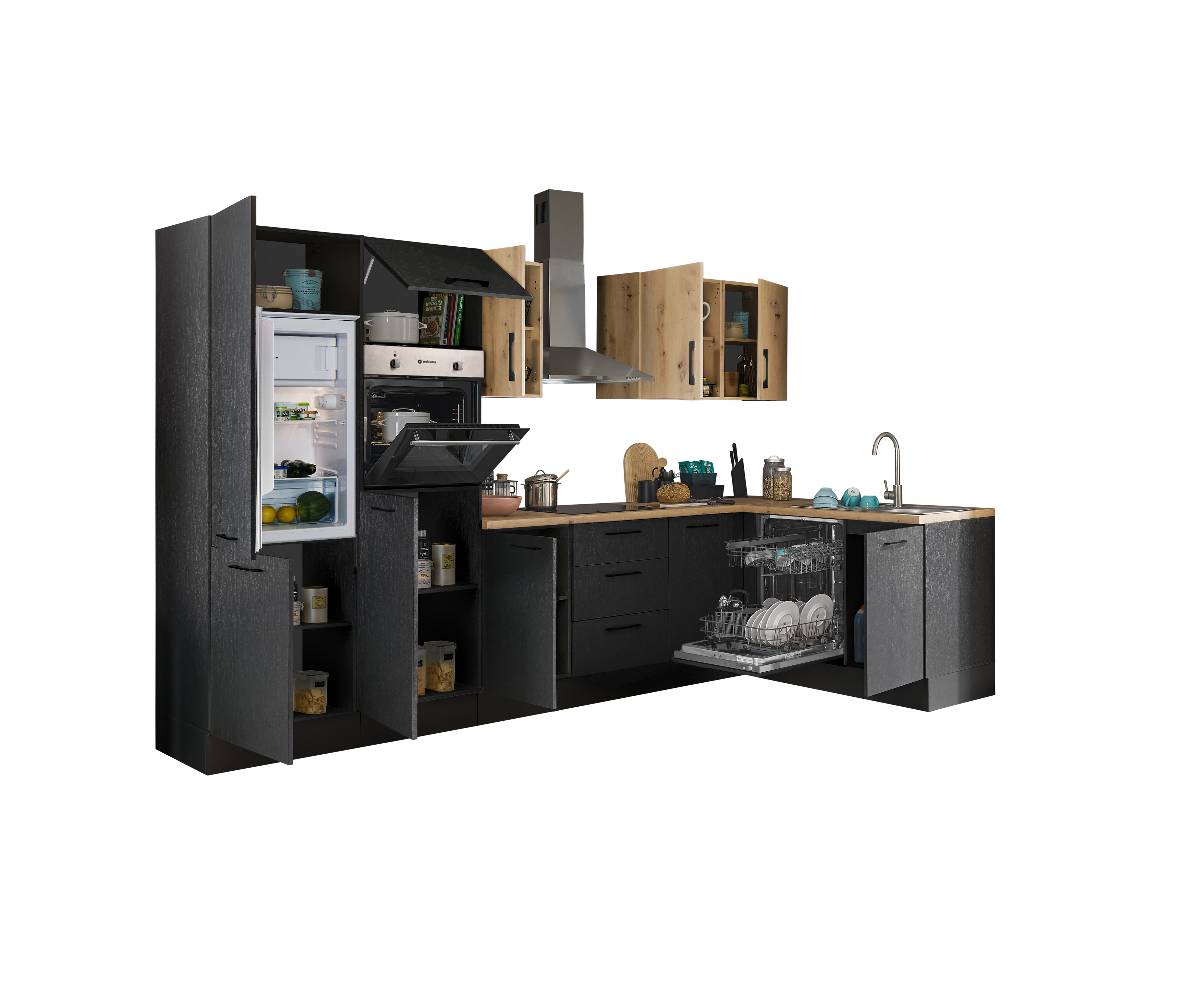 Front und Korpus: schwarz matt woodprint kombiniert mit Spanplatte Artisan Eiche Holznachbildung melaminbeschichtet