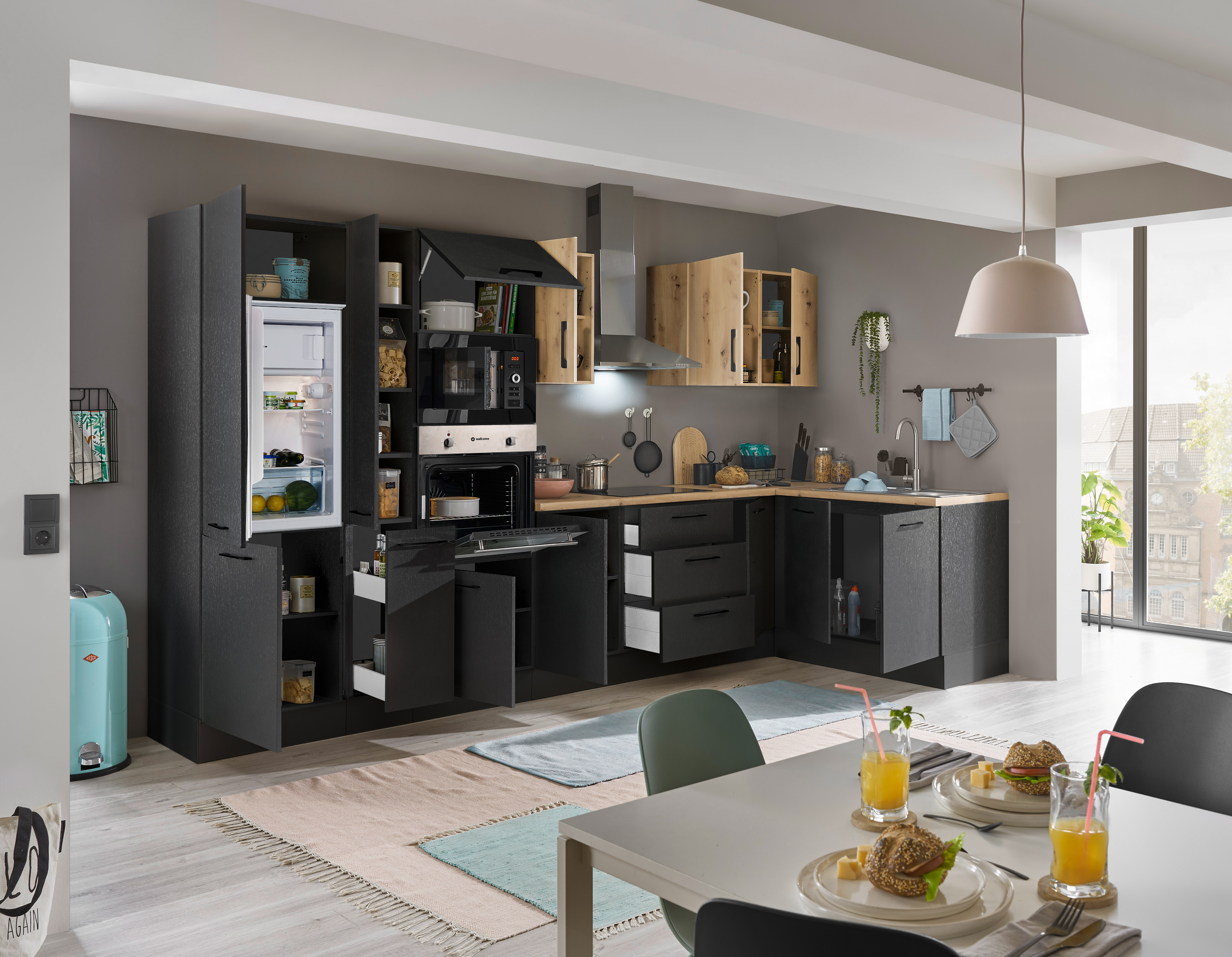 Front und Korpus: schwarz matt woodprint kombiniert mit Spanplatte Artisan Eiche Holznachbildung melaminbeschichtet