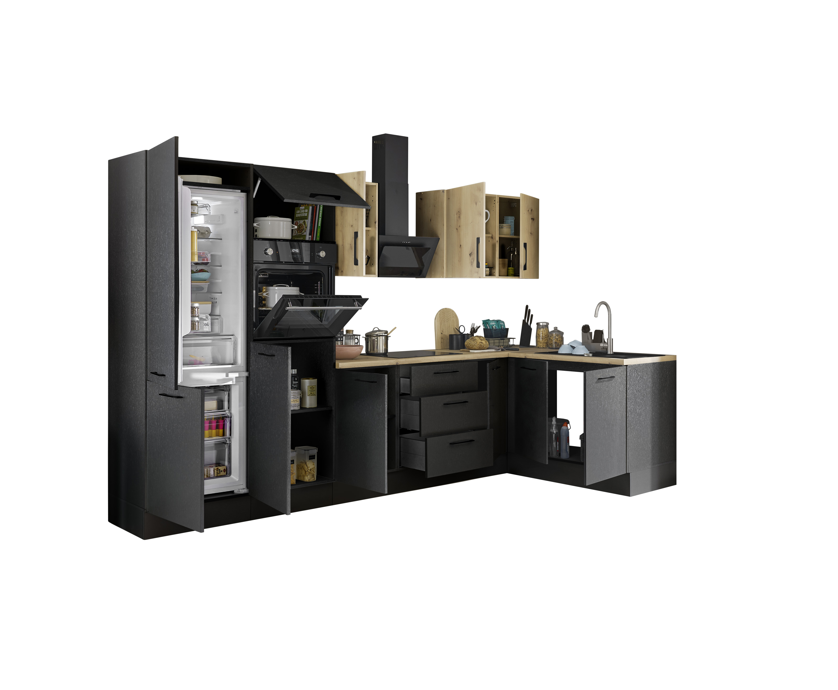 Front und Korpus: schwarz matt woodprint kombiniert mit Spanplatte Artisan Eiche Holznachbildung melaminbeschichtet