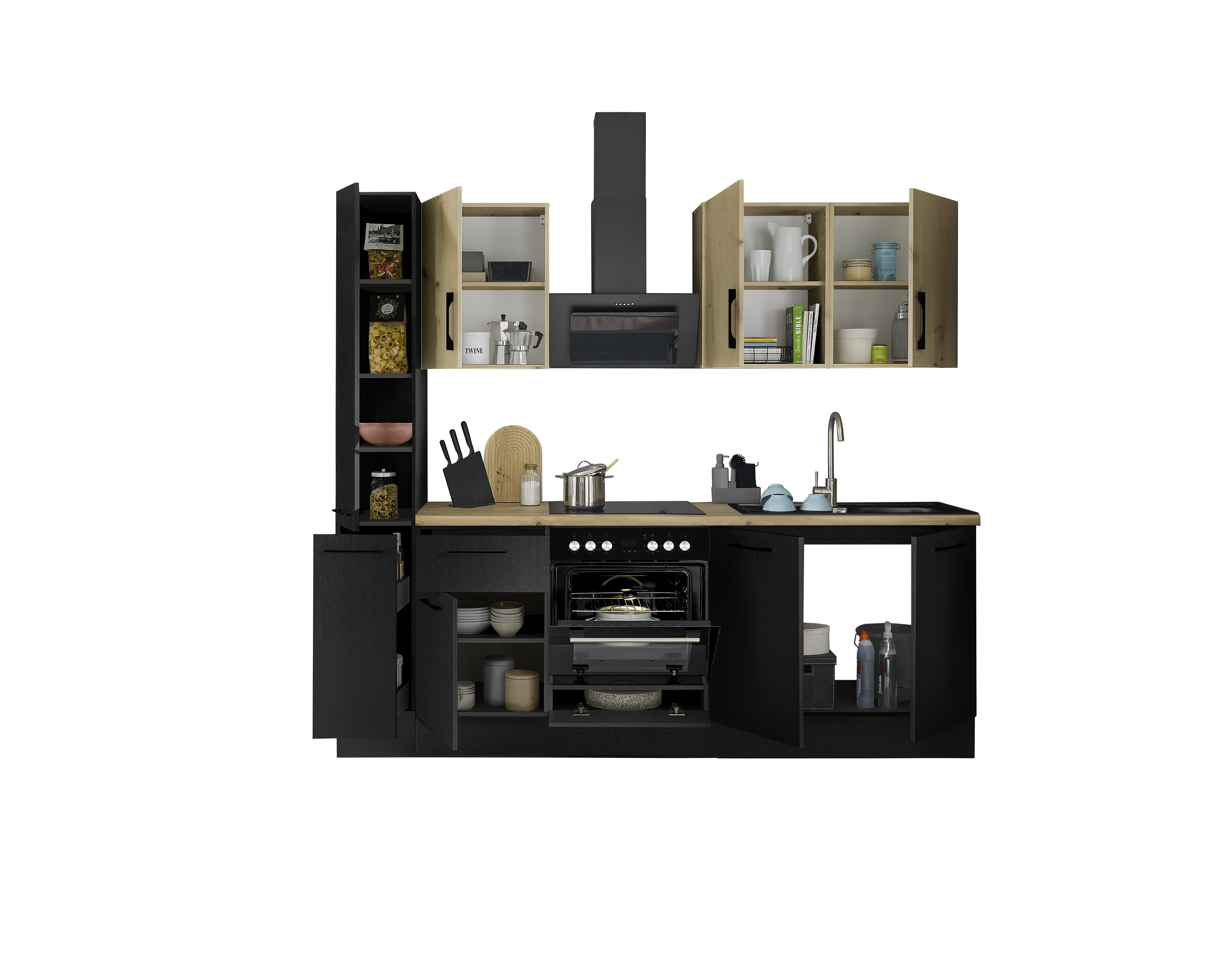 Front und Korpus: schwarz matt woodprint kombiniert mit Spanplatte Artisan Eiche Holznachbildung melaminbeschichtet